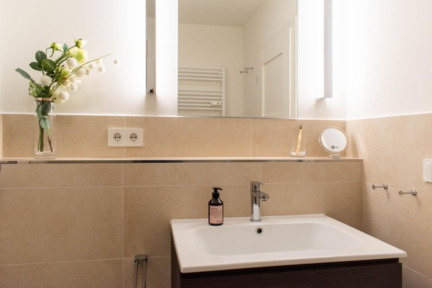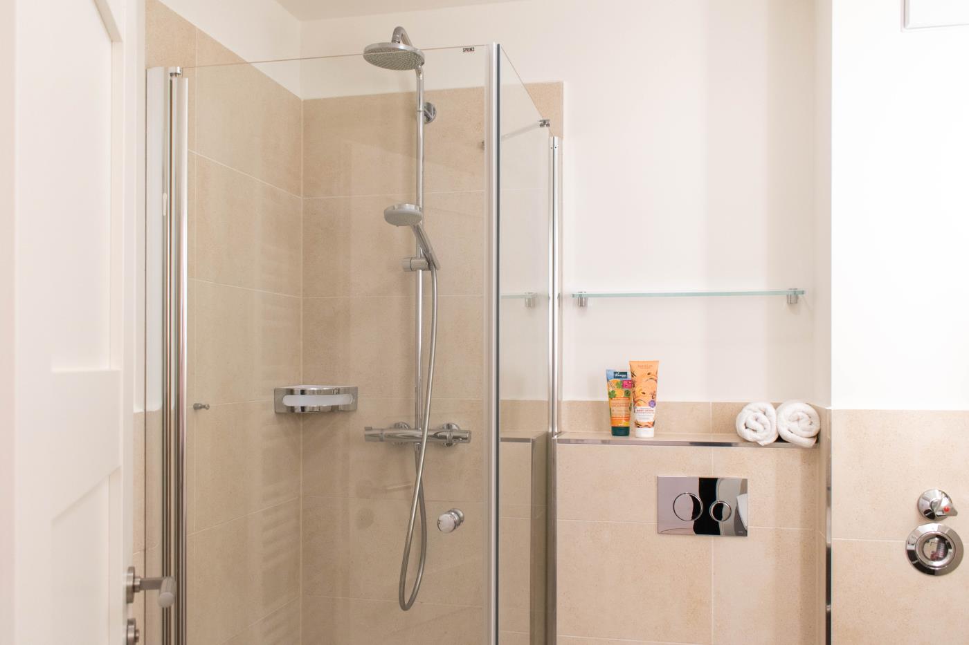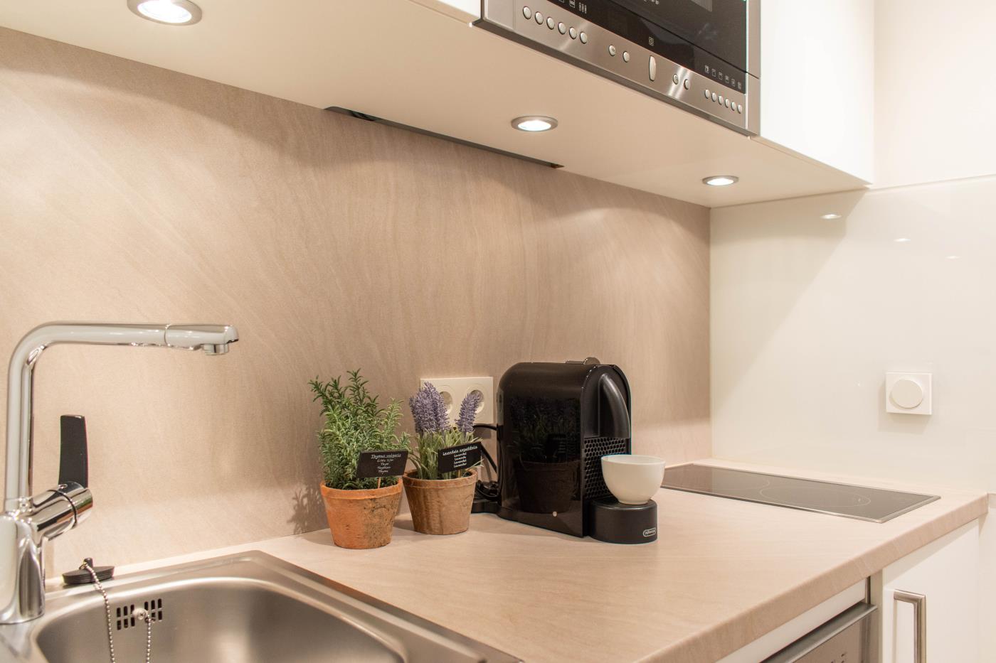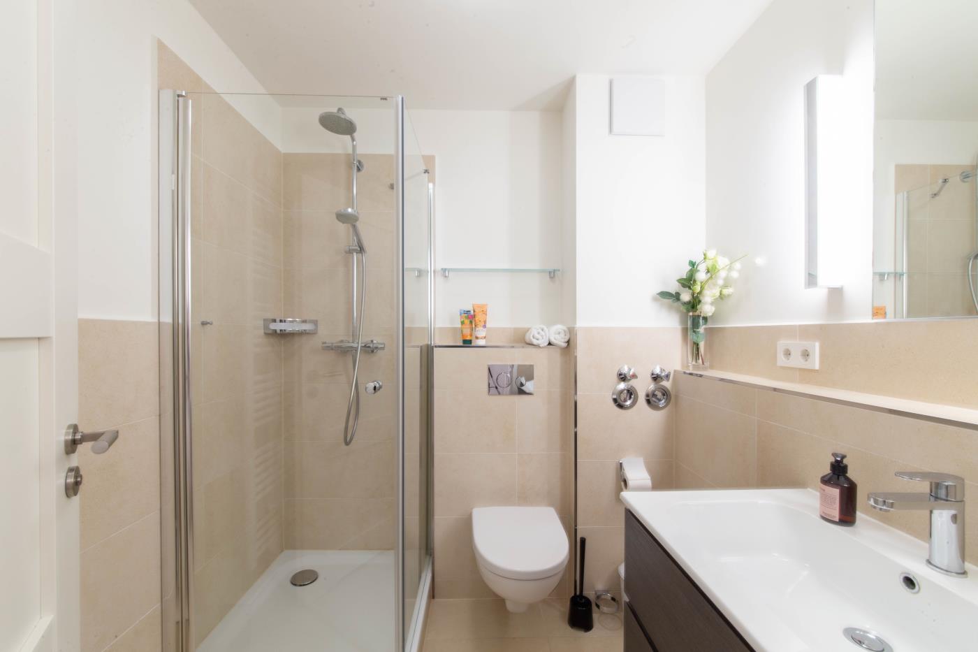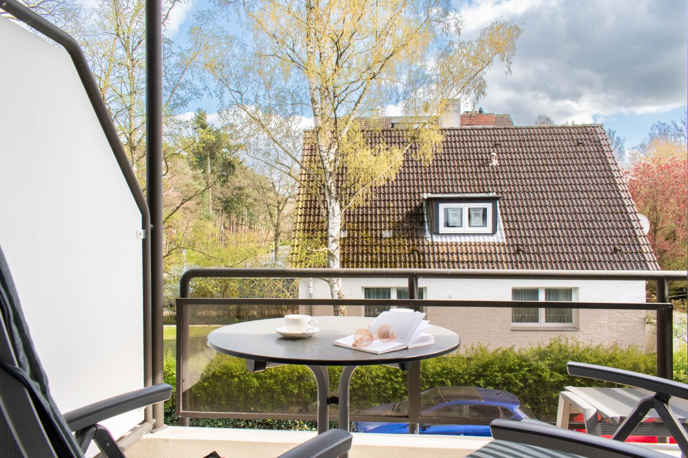 Ein Zimmer mit Doppelbett der neuesten Generation (elektrisch), Balkon und Küche bietet Platz für zwei Gäste. Bodentiefe Fenster sorgen den ganzen Tag für eine helle und freundliche Atmosphäre. Von hier aus gelangt man auch auf den Balkon mit Gartenmöbeln. Ein bequemes Doppelbett (1,80 x 2,00 m) sorgt für einen angenehmen Schlafkomfort. Die Küche ist voll ausgestattet und lässt keine Wünsche offen. Das hochwertig ausgestattete Badezimmer rundet die moderne Wohnung ab. Waschmaschine und Trockner können gegen Gebühr im Haus mitgenutzt werden.