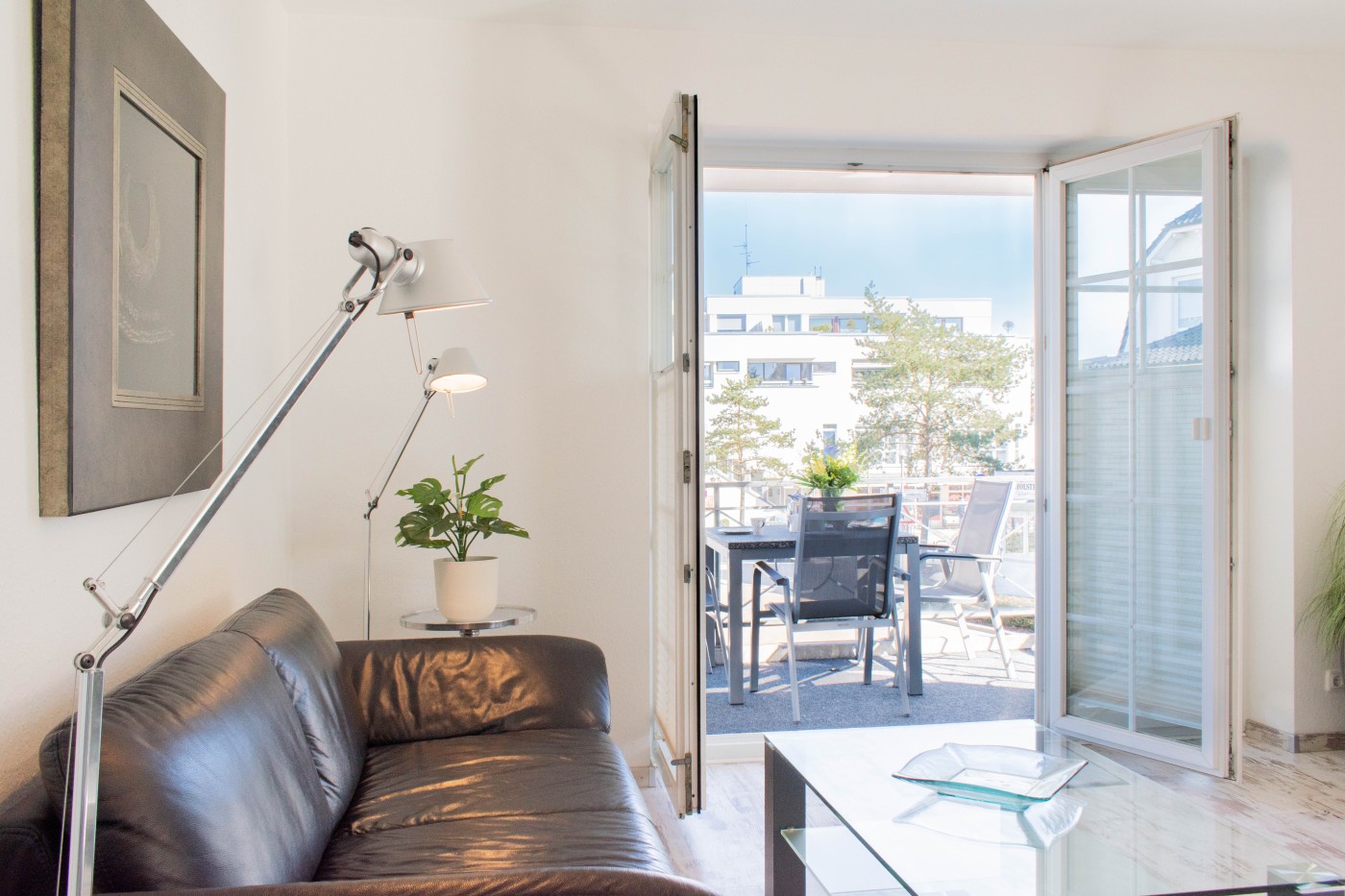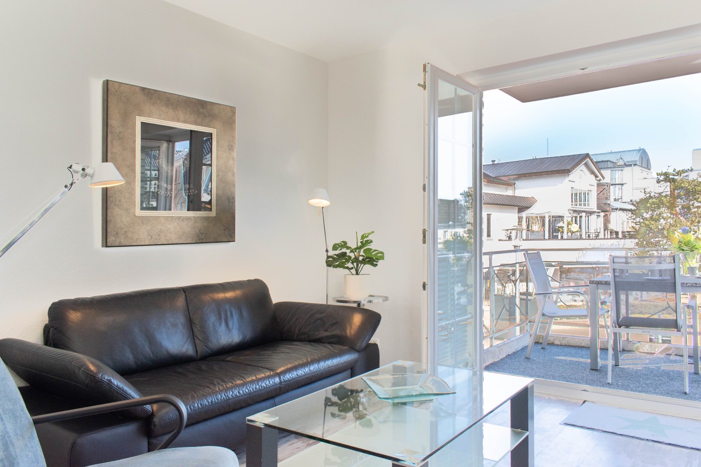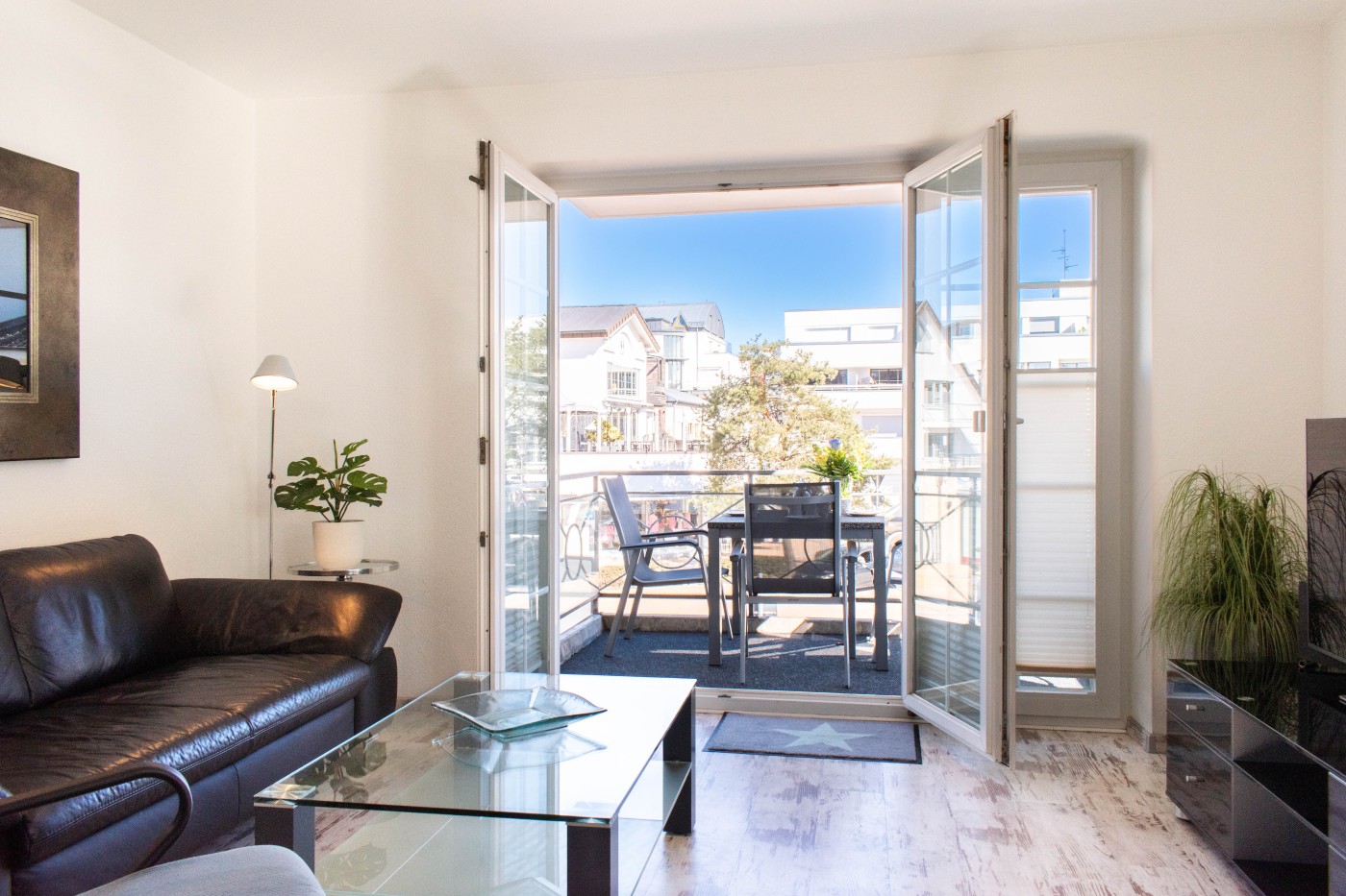 Die Ferienwohnung Logenplatz im Maison Baltique befindet sich auf der ersten Etage einer gepflegten Ferienanlage und bietet mit 2,5 Zimmern Platz für vier Gäste. Die gemütliche Sitzecke lädt zum gemeinsamen Verweilen oder zu kuscheligen Filmabenden ein. Angrenzend ist der Zugang zum möblierten Balkon, von welchem Sie herrlich das lebhafte Treiben des Kurortes, oder auch das Vorbeifahren einiger Luxuskarossen beobachten können. Der große runde Esstisch bietet Platz für vier Personen und befindet sich im lichtdurchfluteten Erker, direkt neben der Küchenzeile. Dank der hervorragenden Küchenausstattung können Sie sich ganz dem Spaß am Kochen widmen. Das größere der beiden Schlafzimmer ist mit einem komfortablen Doppelbett (2 Matratzen à 90er Breite), einem geräumigen Einbauschrank sowie einem Flat-TV ausgestattet. Durch eine Glasschiebetür lässt sich das kleinere Schlafzimmer abtrennen. Mit den beiden Einzelbetten (je 1,90 x 0,80 Meter) sowie ein kleiner Schrank eignet es sich bestens als Kinderzimmer. Reichlich Stauraum für Ihr Reisegepäck finden Sie im großen Flurschrank. Das Tageslichtbad ist mit einer Raindancedusche und einem beleuchteten Spiegel über dem Waschtisch ausgestattet. Insbesondere bei längeren Aufenthalten ist die Waschküche im Keller sehr praktisch, die Waschmaschine und den Trockner können Sie gegen Gebühr nutzen.