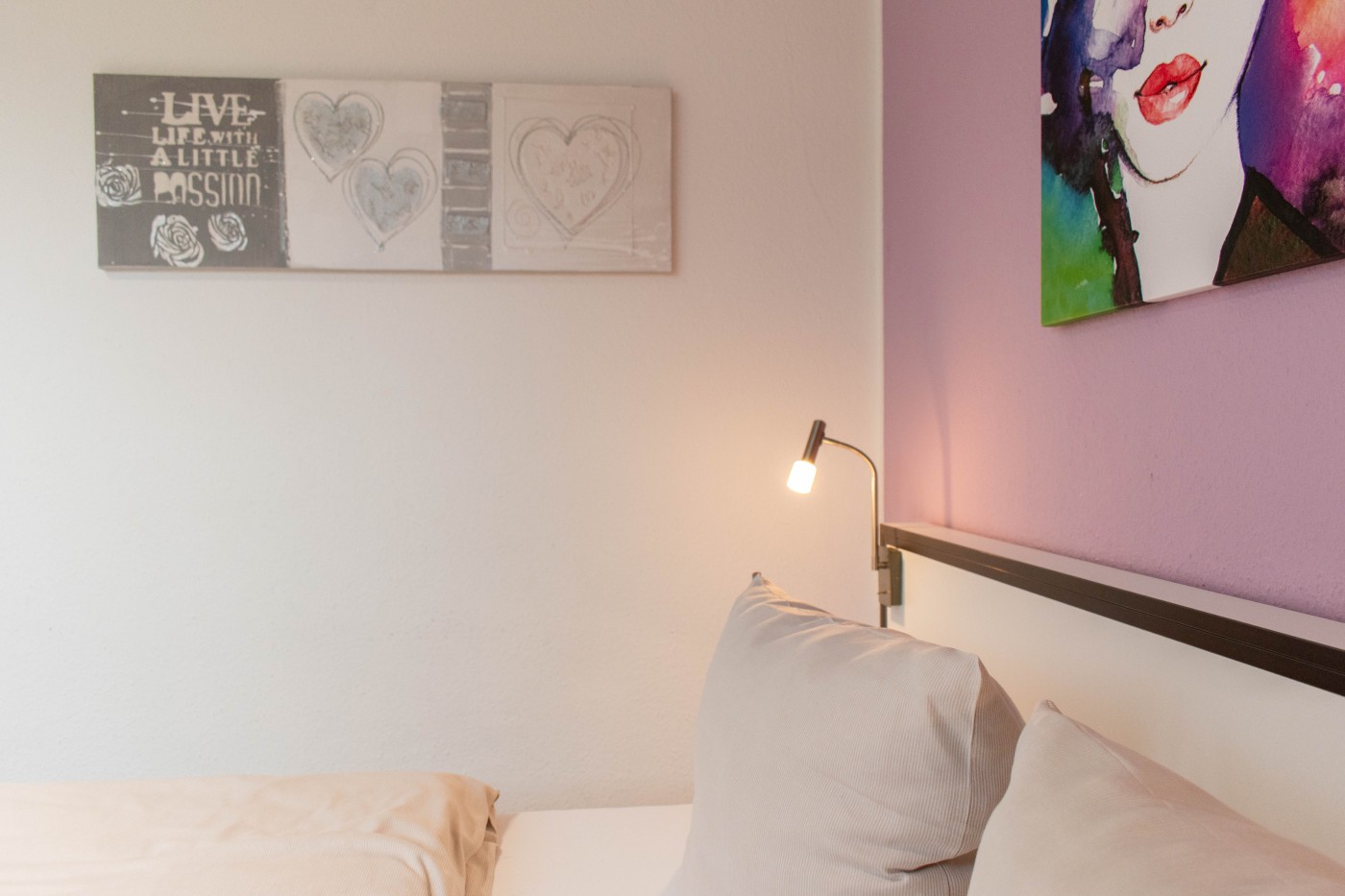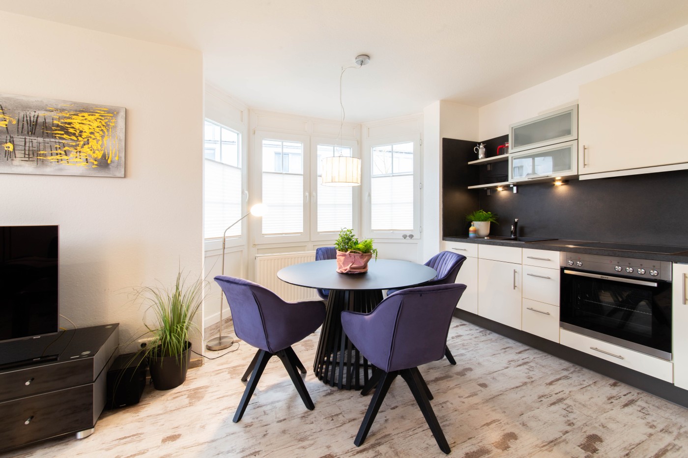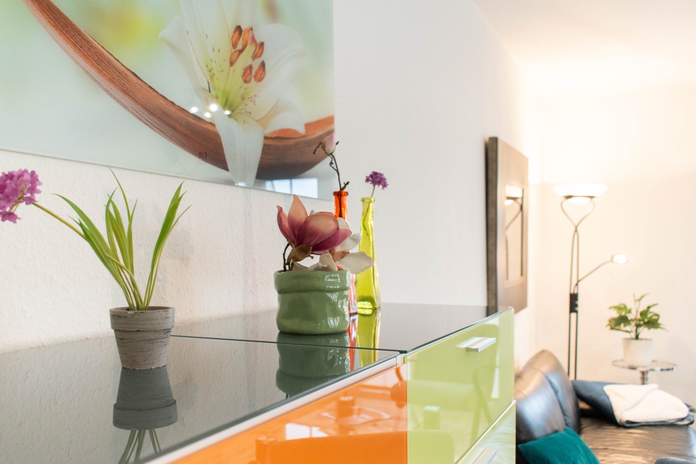 Die klassisch eingerichtete Wohnung zeichnet sich auf 58 m² durch hochwertige Materialien, zeitloses Design und eine elegante, zurückhaltende Atmosphäre aus, mit klaren Linien und gedämpften Farben. Echte Hingucker sind die die violetten Samtstühle und das bunte Highboard im Wohnraum. Im großen Schlafzimmer sorgt ein frisches Magenta für Abwechslung. Farbfrohe Wandbilder lockern die Atmosphäre auf.