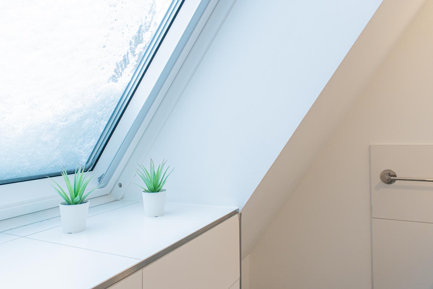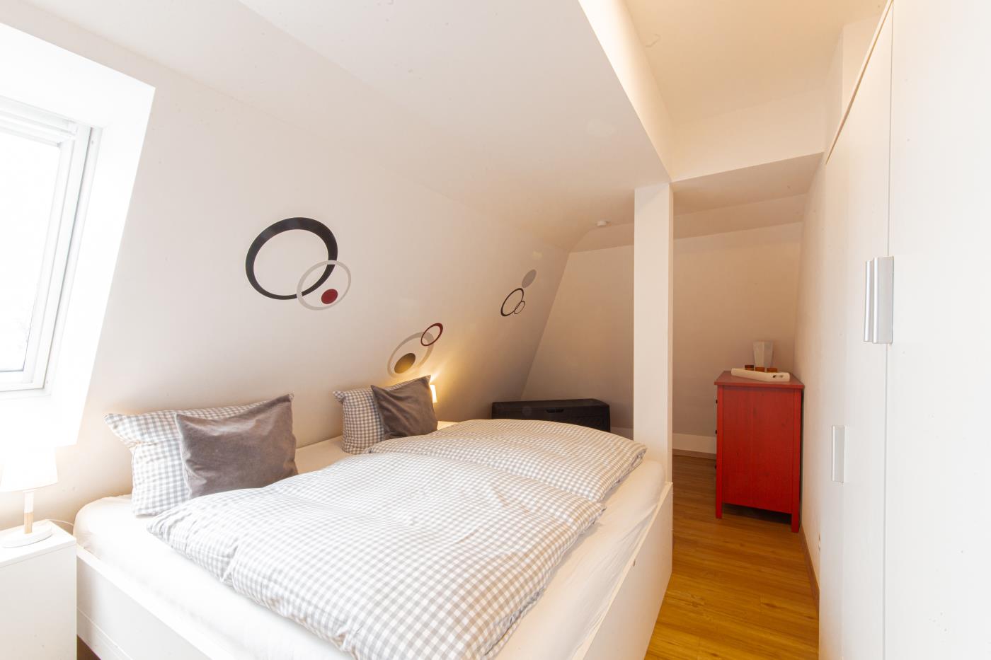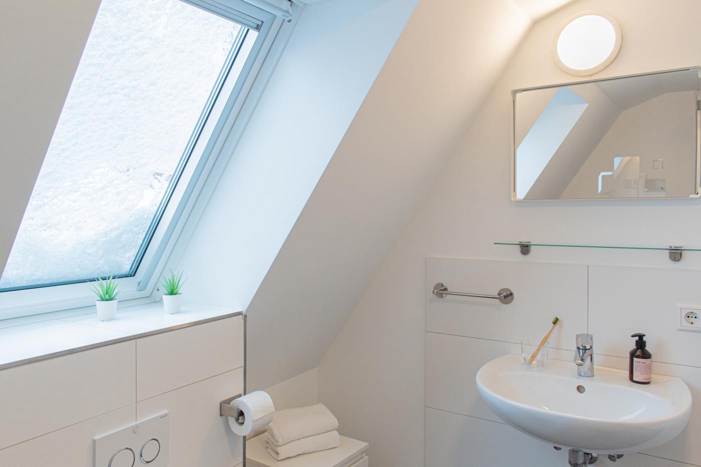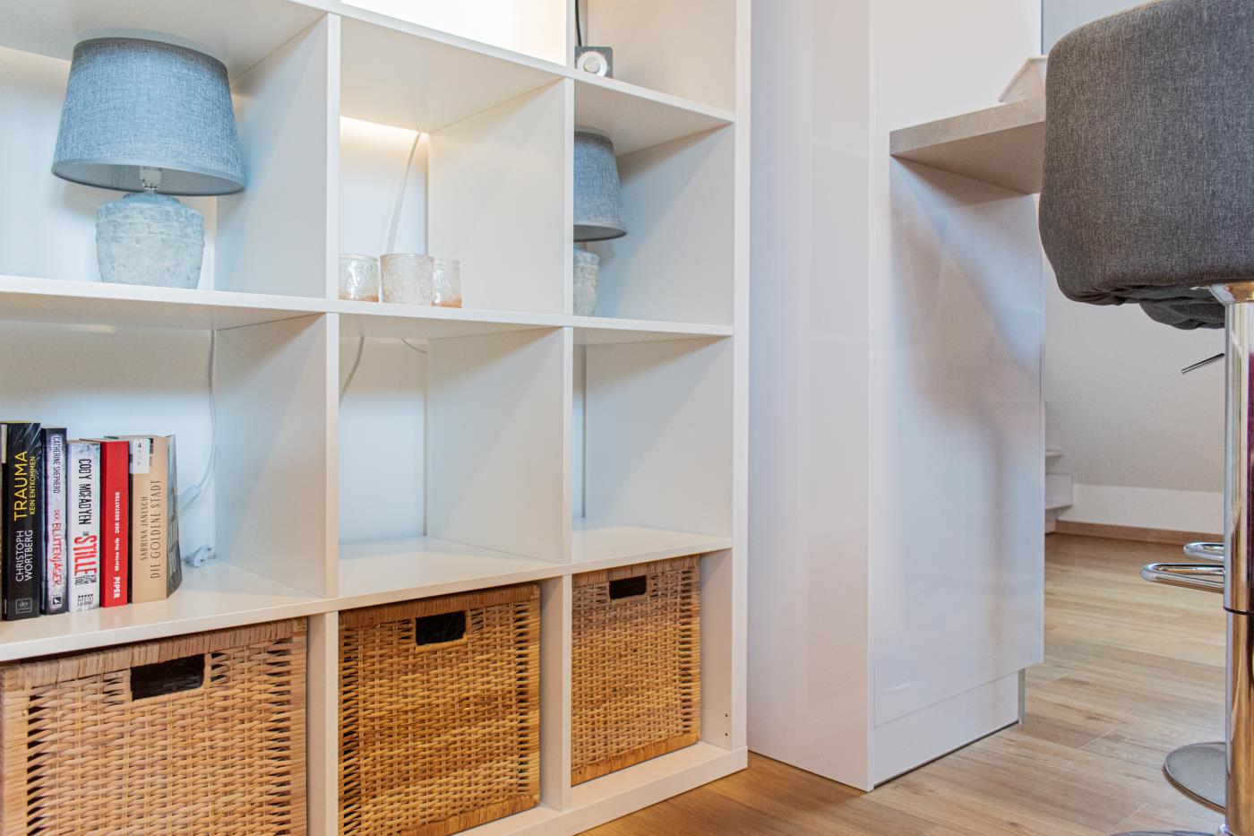 Die Einrichtung strahlt in frischen und ausgewählten Farben, die dem Stil des Appartements eine klare Linie verleihen. Den besonderen Charme der Wohnung stellen die Dachschrägen dar, welche ein wohliges Ambiente kreieren. Parken & Fahrräder