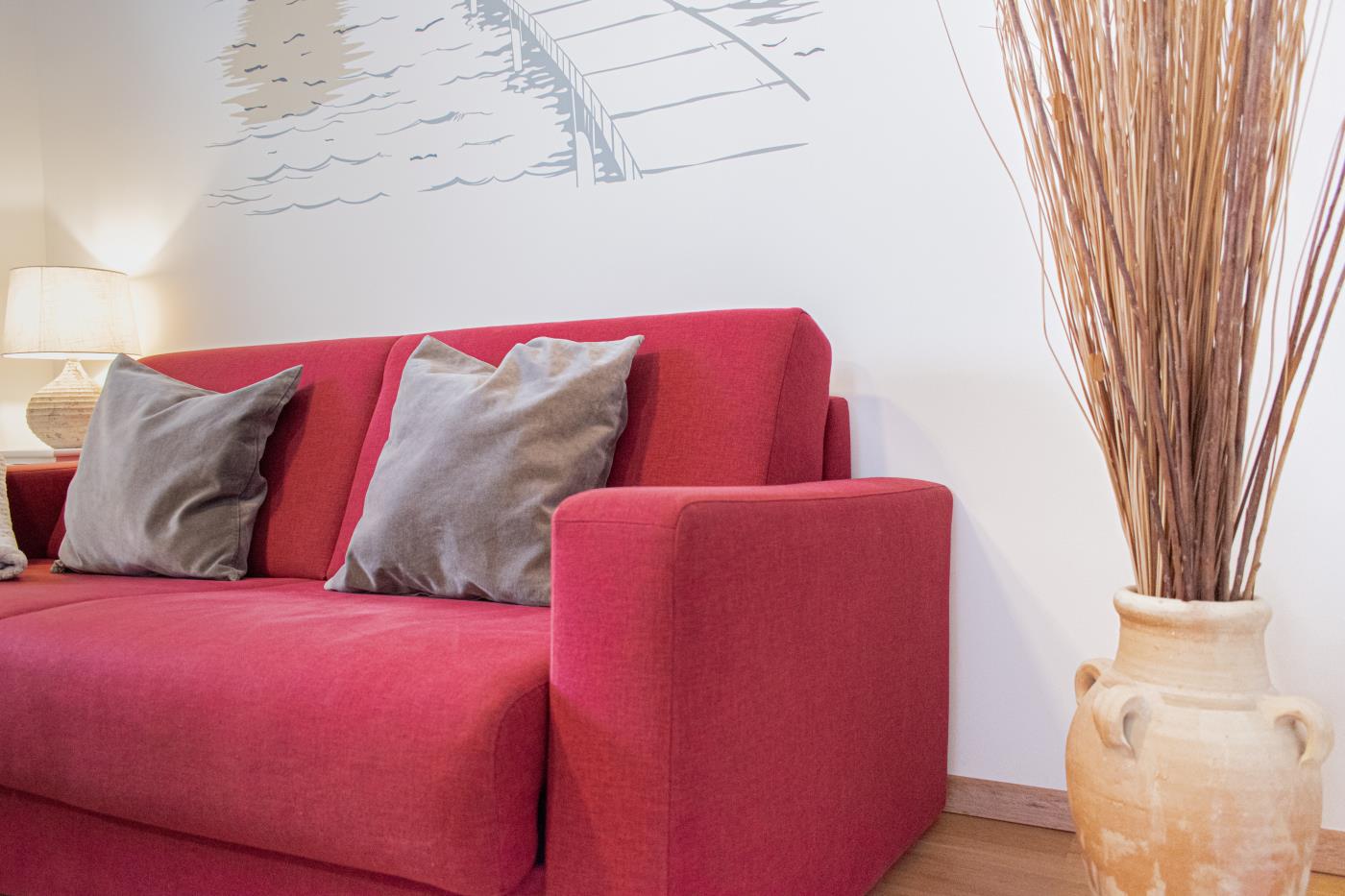 Der Wohnraum ist mit einem Smart-TV ausgestattet, der sich durch die Wandhalterung schwenken lässt und somit den Fernsehgenuss auf beiden Couchlandschaften ermöglicht. Im Schlafzimmer befindet sich ein weiterer Flat-TV. Zudem verfügt die Wohnung über einen WLAN-Anschluss, damit Sie auch im Urlaub online sein können. Für die musikalische Untermalung Ihres Urlaubs steht ein Radio bereit.