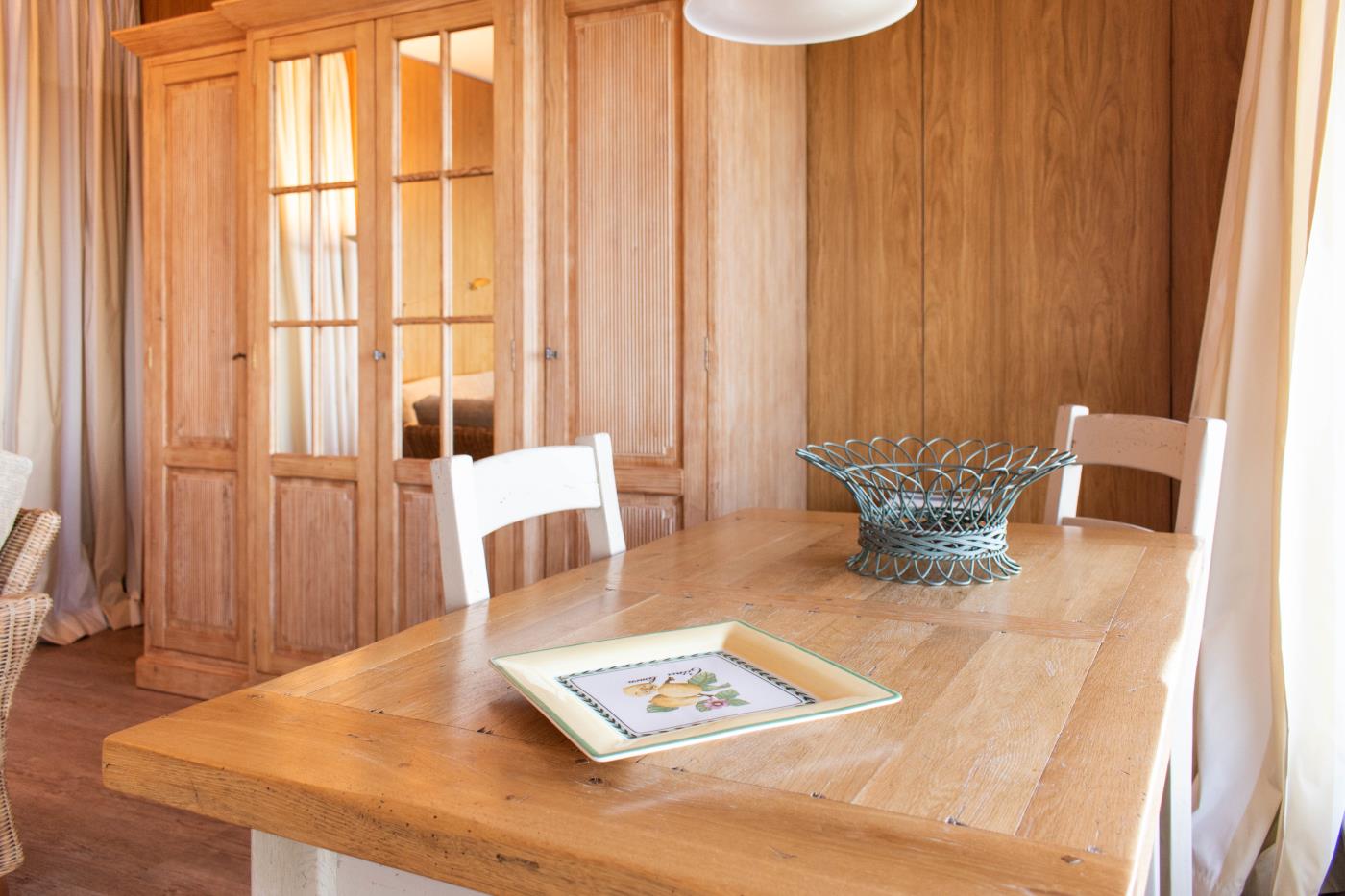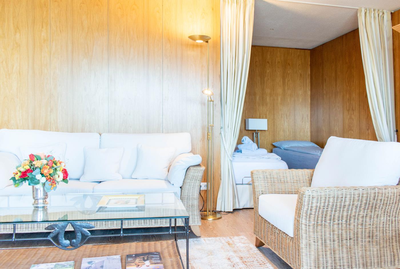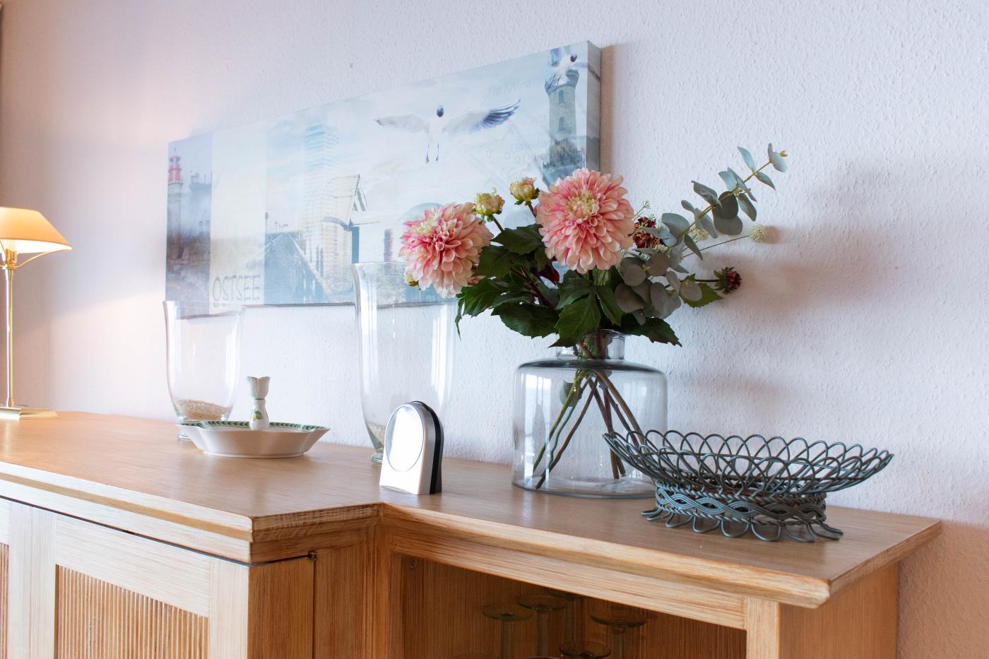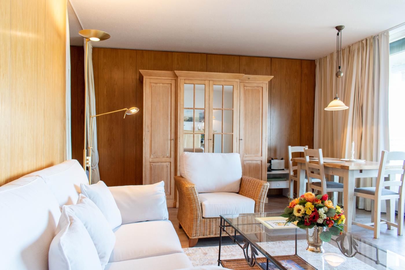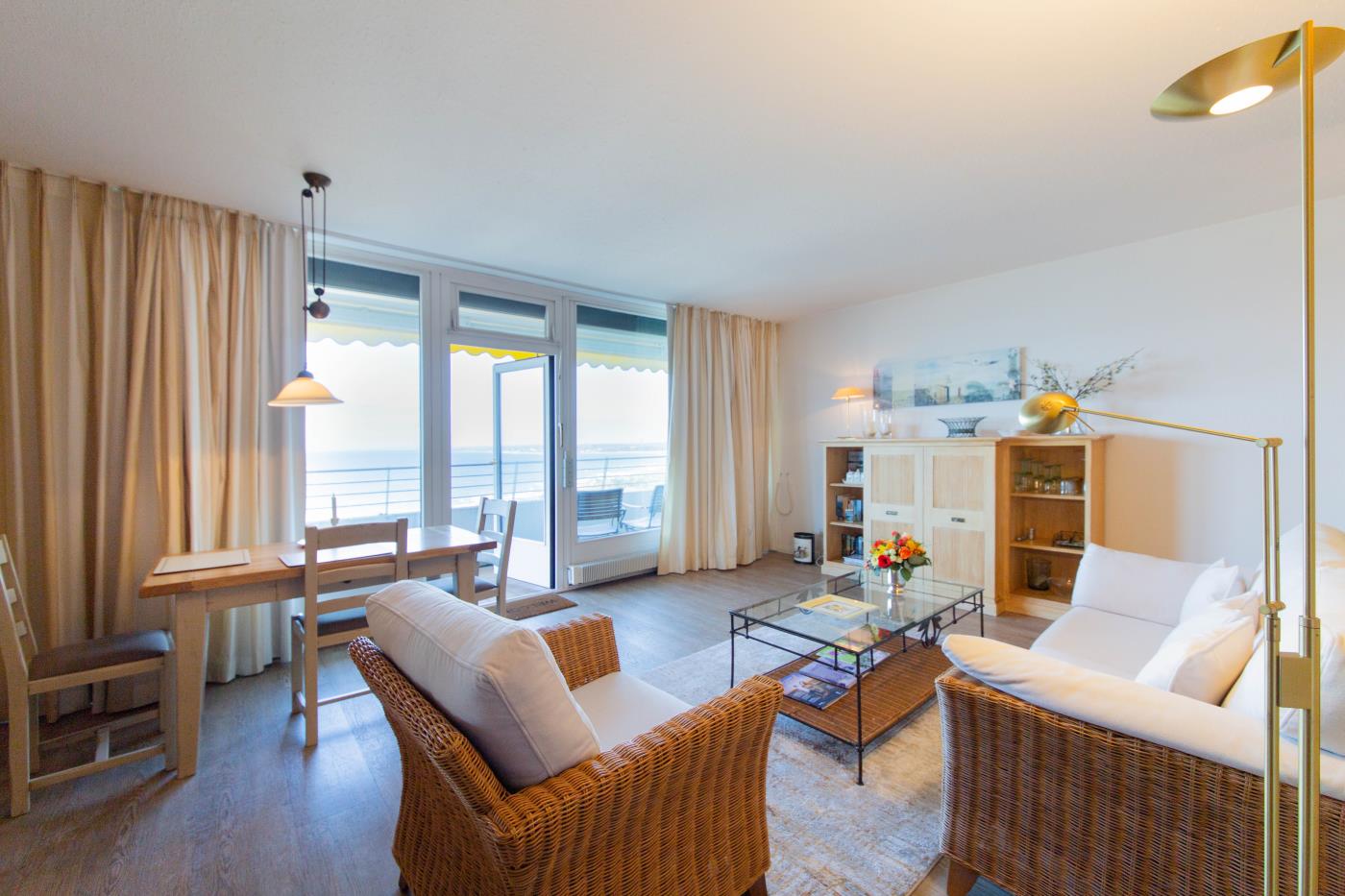 Die lichtdurchflutete Ferienwohnung ist hochwertig und komfortabel eingerichtet. Gemütliche Korbstühle sowie die Einrichtung im Landhausstil bilden eine heimelige Atmosphäre.
