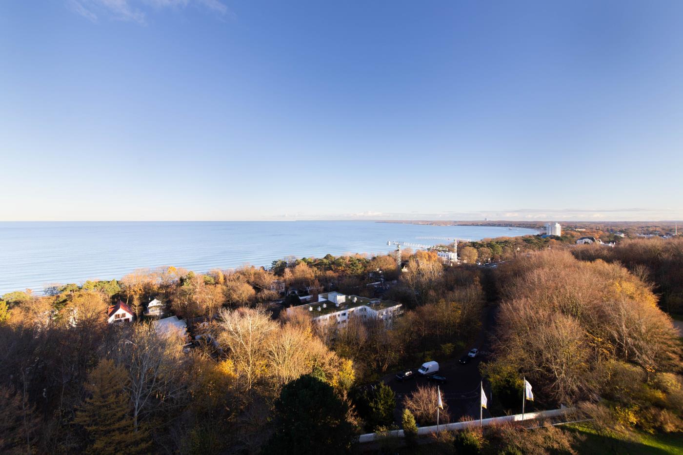 Der Gebäudekomplex befindet sich auf einer Anhöhe in ruhiger Lage, nahe einem Waldgebiet, von der man einen traumhaften Ausblick über das Meer genießen kann. Der Strand, sowie das Zentrum liegen nur wenige Gehminuten entfernt. Das Hotelgelände erstreckt sich über eine weite Fläche, auf der es viel zu entdecken gibt. Die Ferienwohnung Residenz App. 809 befindet sich auf der 8. Etage und verfügt über eine Wohnfläche von 62 m². Freuen Sie sich auf eine hochwertige Ausstattung und das individuelle Interieur, während Sie den weiten Blick auf die Ostsee und über die schöne Landschaft von Ostholstein genießen.