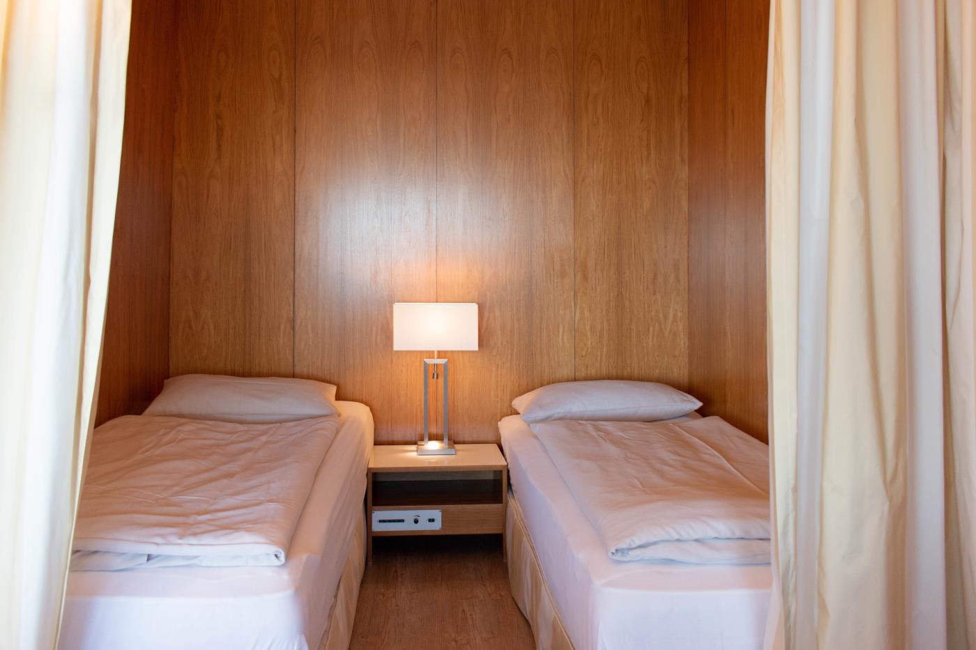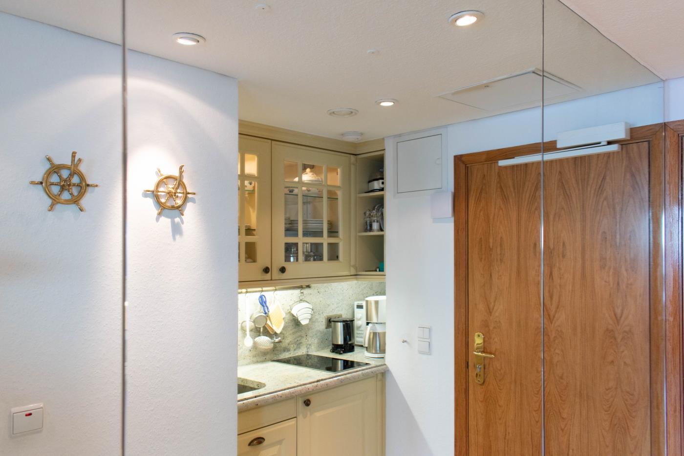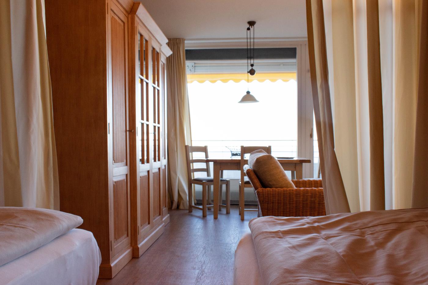 Die Einzimmerwohnung bietet Platz für zwei Gäste. Die großen Fensterfronten in der gesamten Wohnung sorgen den ganzen Tag für eine helle und freundliche Atmosphäre. Das geräumige Wohn- und Esszimmer bildet das Herzstück dieser Ferienwohnung. Eine gemütliche Sitzecke lädt zum gemeinsamen Verweilen ein und der angrenzende Essbereich bietet Platz für zwei Personen. Die beiden Einzelbetten (je 0,90er Breite) befinden sich in einer kuscheligen Nische und lassen sich durch einen Vorhang vom Wohnraum abtrennen. Die kleine, aber feine Küchenzeile befindet sich im Eingangsbereich der Wohnung. Das Badezimmer verfügt über eine Duschwanne und ein WC sowie einen Handtuchheizkörper.