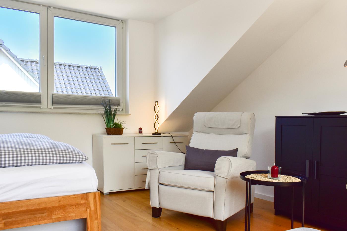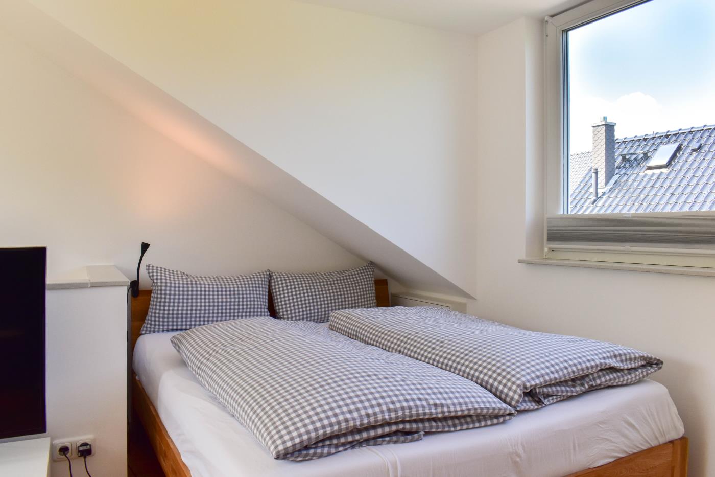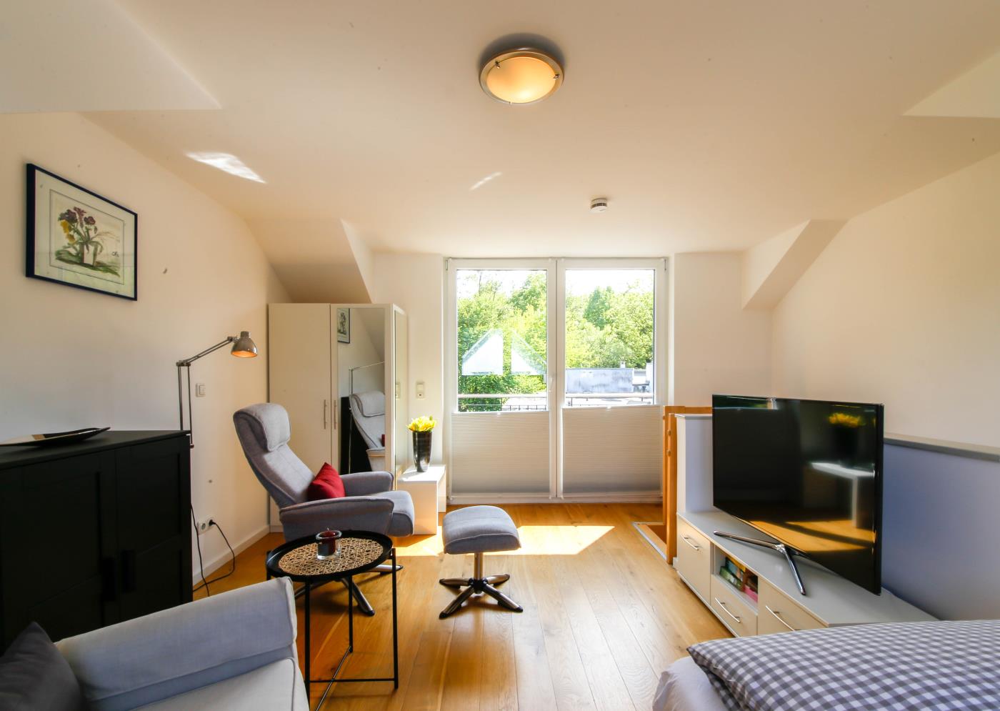 Das Zimmer im Dachgeschoss ist mit einem Flat-TV ausgestattet. Der WLAN-Zugang gehört ebenfalls zum Entertainment.