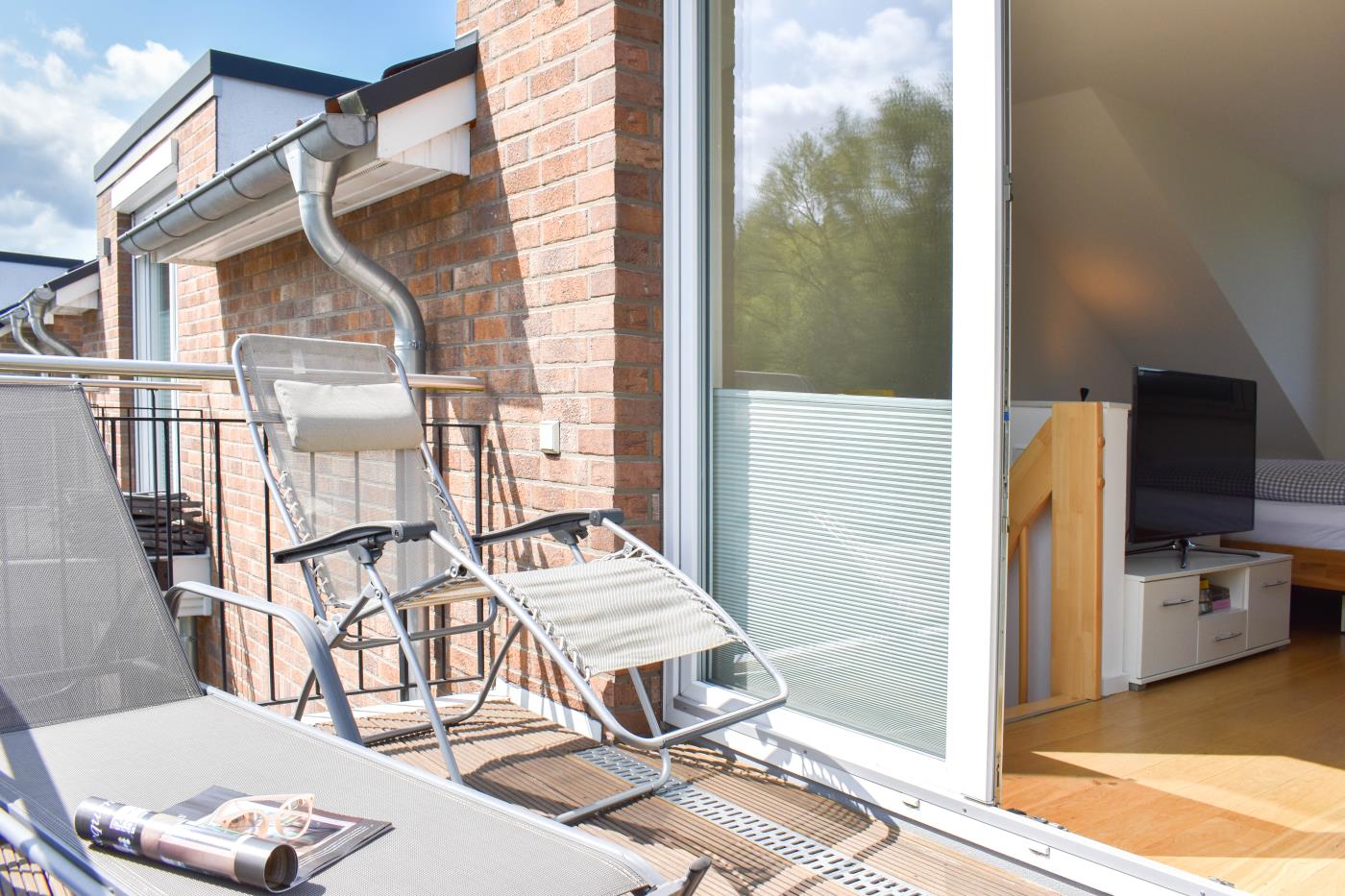 Die Ferienwohnung Strandgefühl bietet auf zwei Etagen Platz für bis zu drei Personen und ist komfortabel mit einem Fahrstuhl zu erreichen. Das gemütliche Wohn- und Esszimmer lädt zum gemeinsamen Verweilen ein. Die schicke Küche lässt keine Wünsche offen. Der Essbereich für vier Personen bildet das Zentrum des Wohnraumes. Eines der beiden Sofas lässt sich im Handumdrehen zu einer bequemen Schlafgelegenheit umbauen (1,40 x 2,00 Meter). Von hier gelangen Sie zu einem der sonnigen Balkone, welcher mit einem Essplatz ausgestattet ist. Ebenfalls im unteren Bereich der Ferienwohnung befindet sich das moderne Badezimmer mit einer ebenerdigen Dusche und einem Handtuchheizkörper. Über die Holztreppe gelangen Sie ins Obergeschoss, welches sogleich das zweite Schlafzimmer mit einem bequemen Doppelbett (1,80er Breite) ist. Die gemütliche Leseecke rundet diesen Rückzugsort ab. Von hier erreichen Sie das I-Tüpfelchen der Ferienwohnung: den zweiten Balkon mit bequemen Loungemöbeln - hier erwartet Sie Sonne pur!