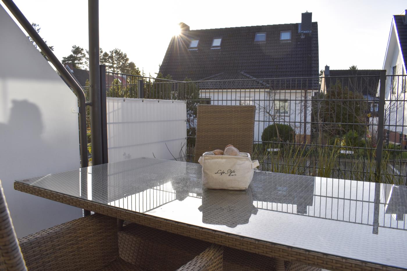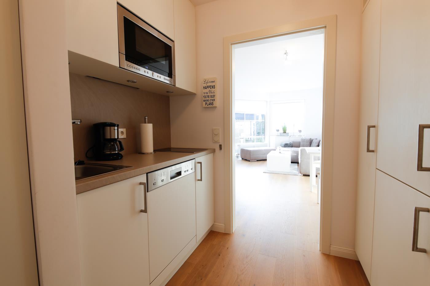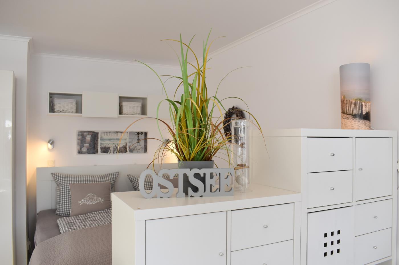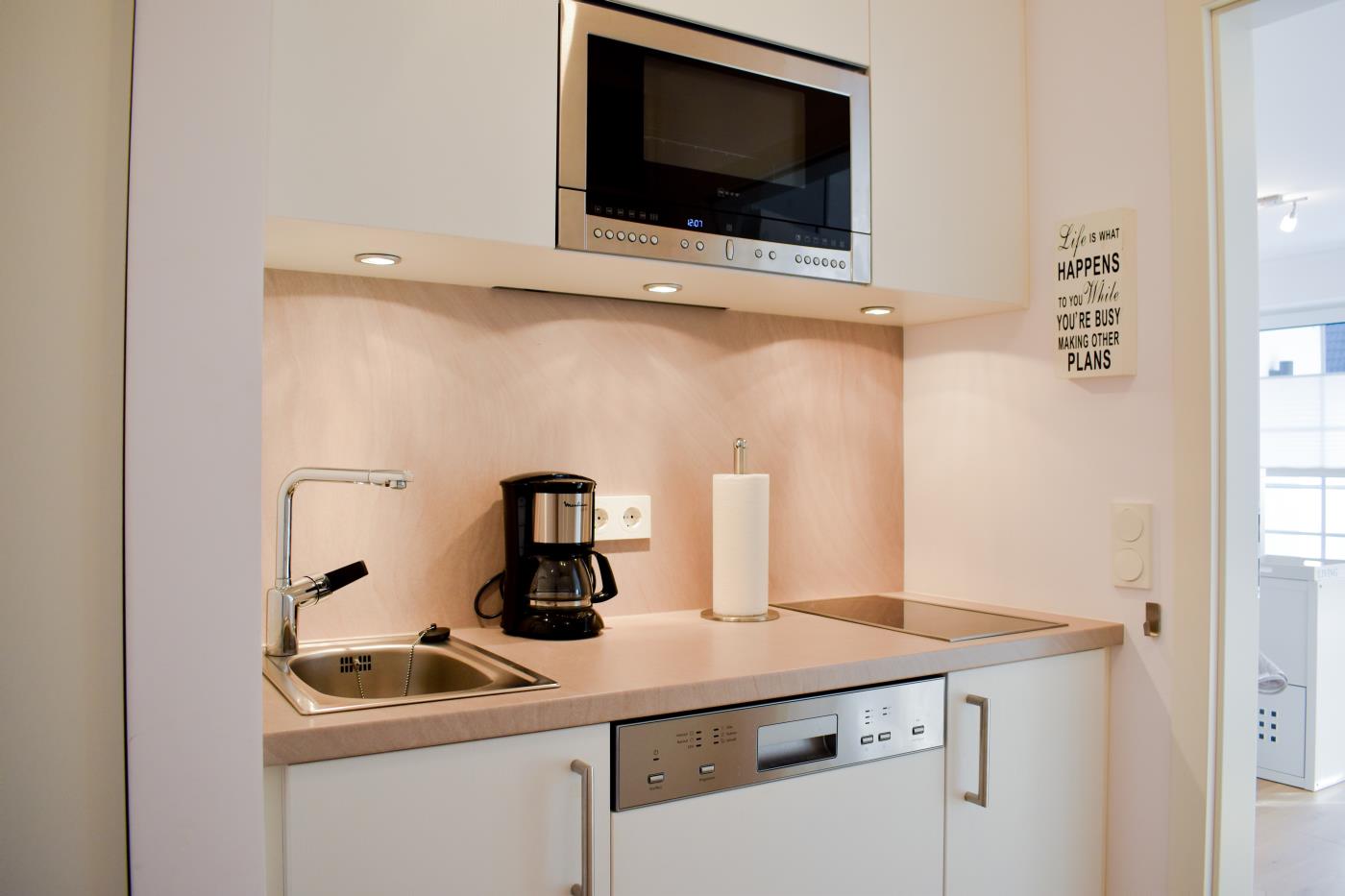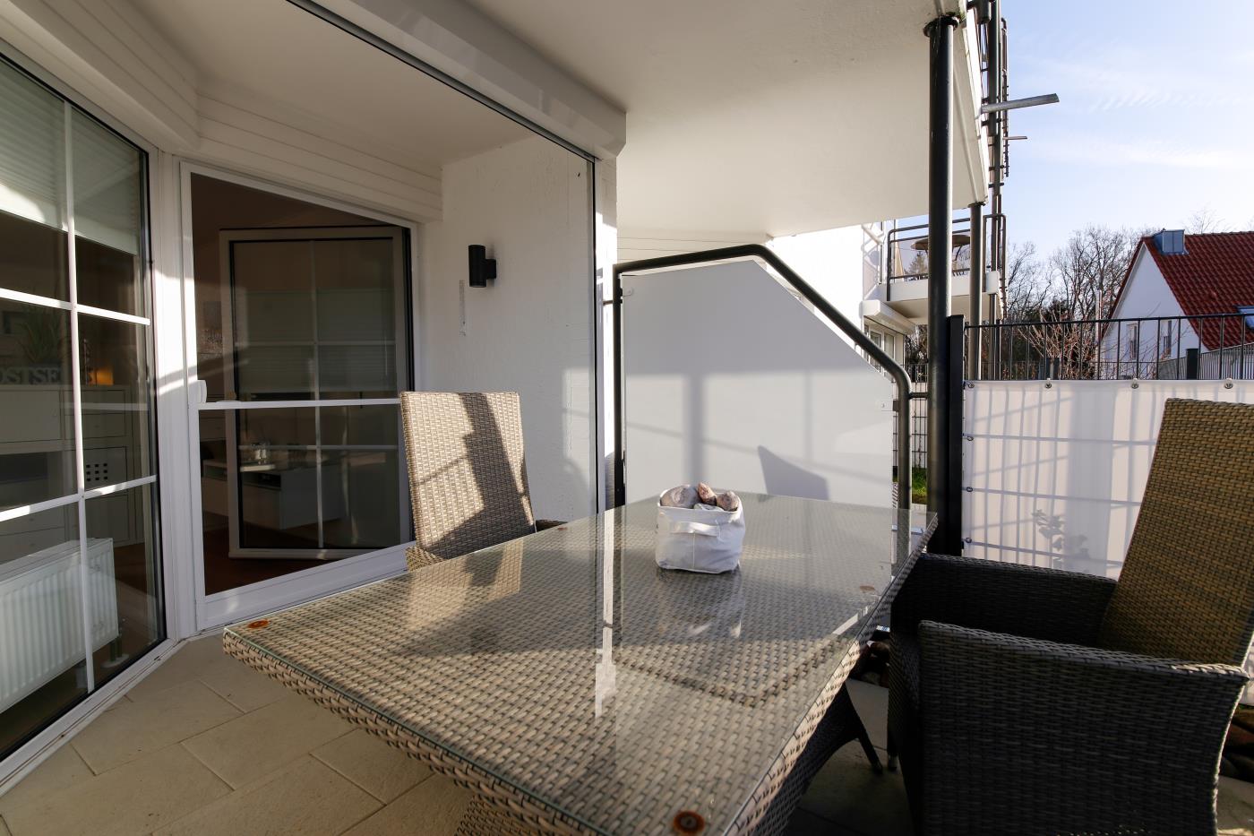 Die Einzimmerwohnung bietet Platz für zwei Gäste. Die offene Küche ist komplett ausgestattet und lässt keine Wünsche offen, sie ist geschickt in den Flur integriert. Der Essplatz für zwei Personen grenzt direkt an die Küche an. Die Fensterfront im Wohnzimmer sorgt den ganzen Tag für eine helle und freundliche Atmosphäre und die gemütliche Couchecke lädt zum Verweilen ein. Vom Wohnzimmer gelangt man auf den möblierten und süd-westlich ausgerichteten Balkon mit eigenem Strandkorb, in dem es sich herrlich relaxen lässt. Ebenfalls im Wohnraum befindet sich das bequeme Doppelbett (1,80er Breite), durch den Raumtrenner ist der Schlafbereich vom Wohnraum separiert. Das schicke Badezimmer mit Dusche rundet diese Wohlfühlwohnung ab. Im hauseigenen Waschraum können die Waschmaschine und der Trockner gegen Gebühr mitgenutzt werden.