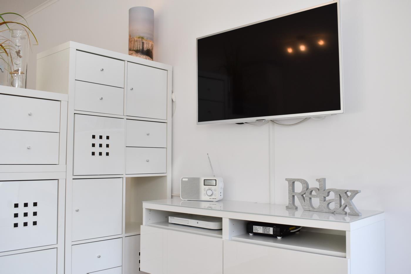Für die Unterhaltung am Abend sorgt der Smart-TV im Wohnzimmer. Eine Stereoanlage und der WLAN-Zugang gehören ebenfalls zum Entertainmentpaket.