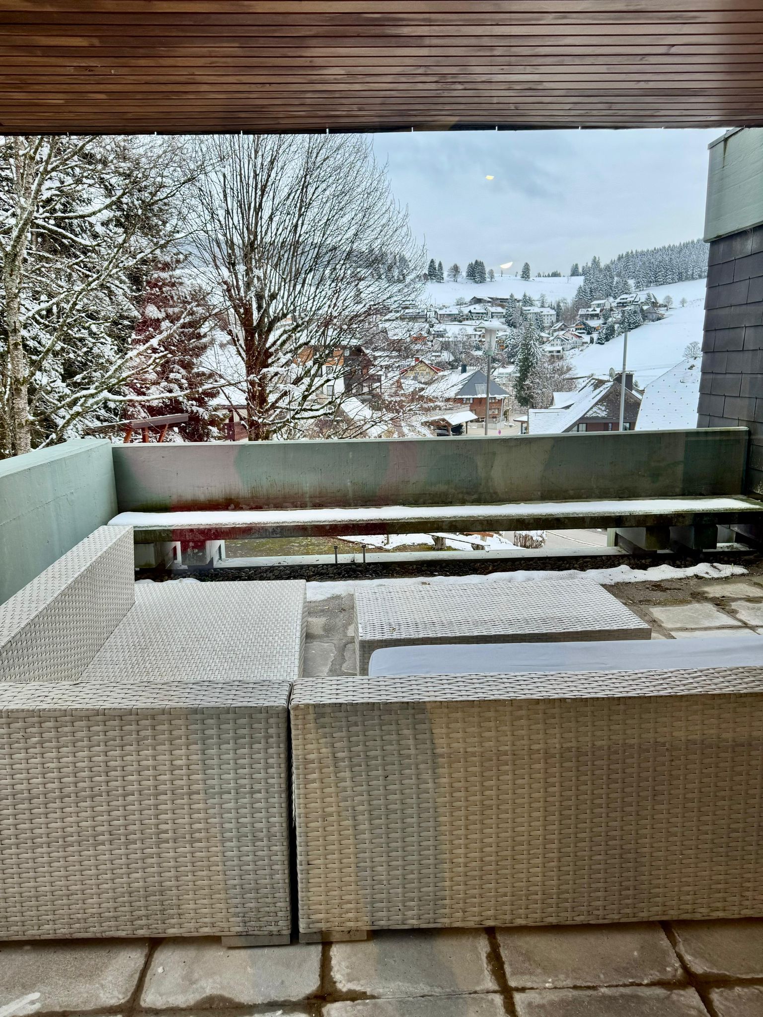 Ein besonderes Highlight ist der großzügige überdachte Balkon mit einem beeindruckenden Blick auf die Schwarzwaldberge.