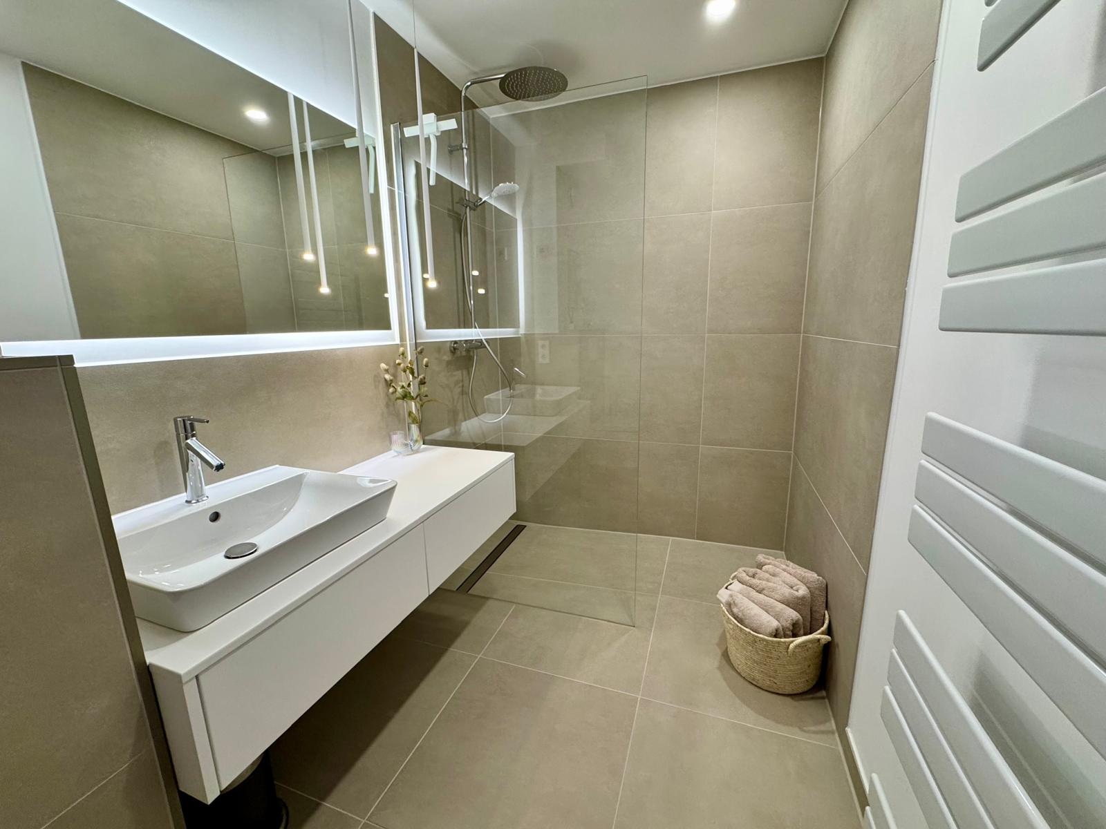 Begehbare Dusche WC und Waschbecken Beleuchteter Spiegel Handtücher, Badetücher und FöhnAußenbereich