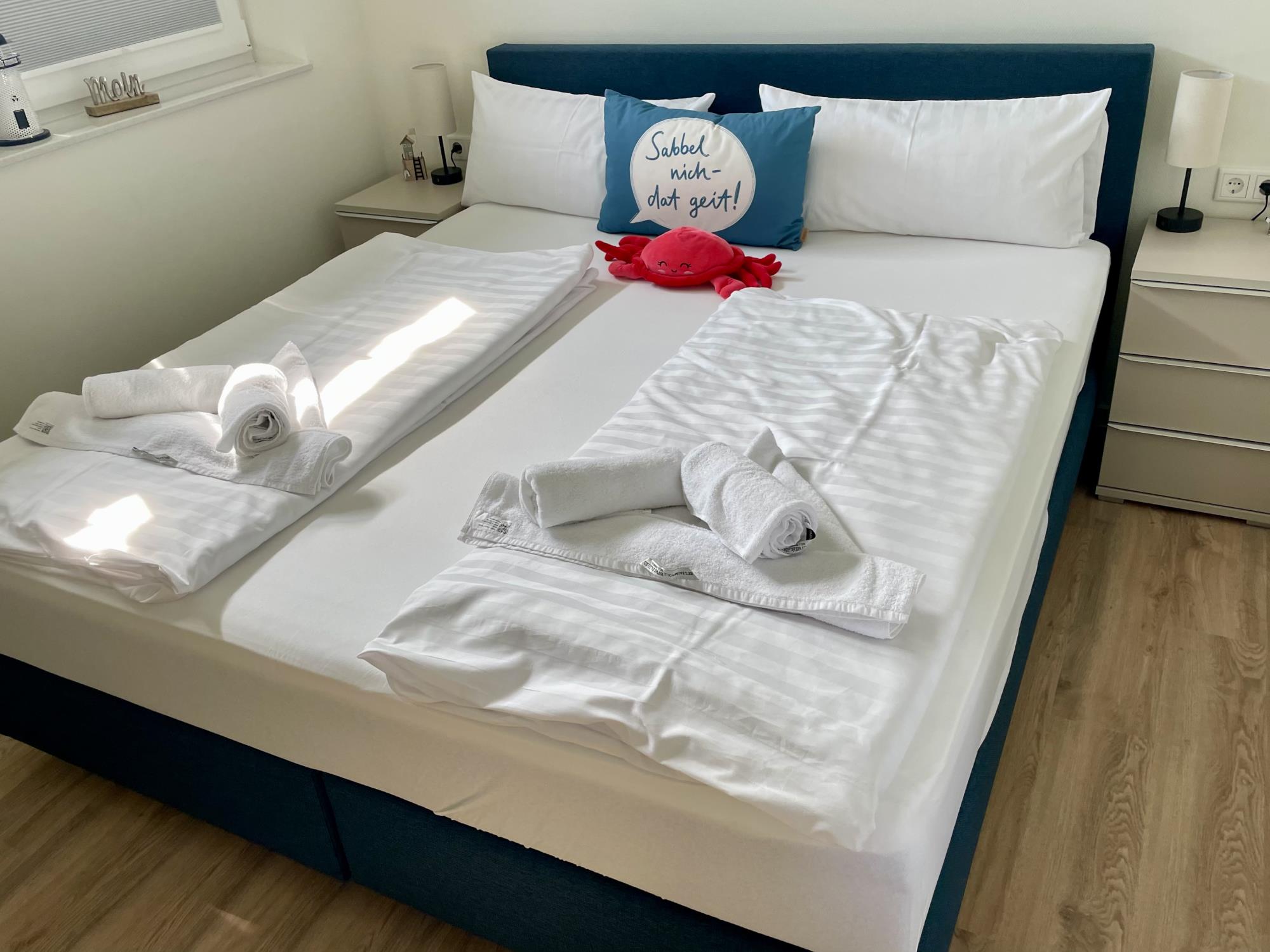 In den beiden Schlafzimmern findet Ihr Boxspringbetten 180x200cm mit durchgängigen Toppern. Für die kleinen Gäste wurde sogar an einen Rausfallschutz gedacht.