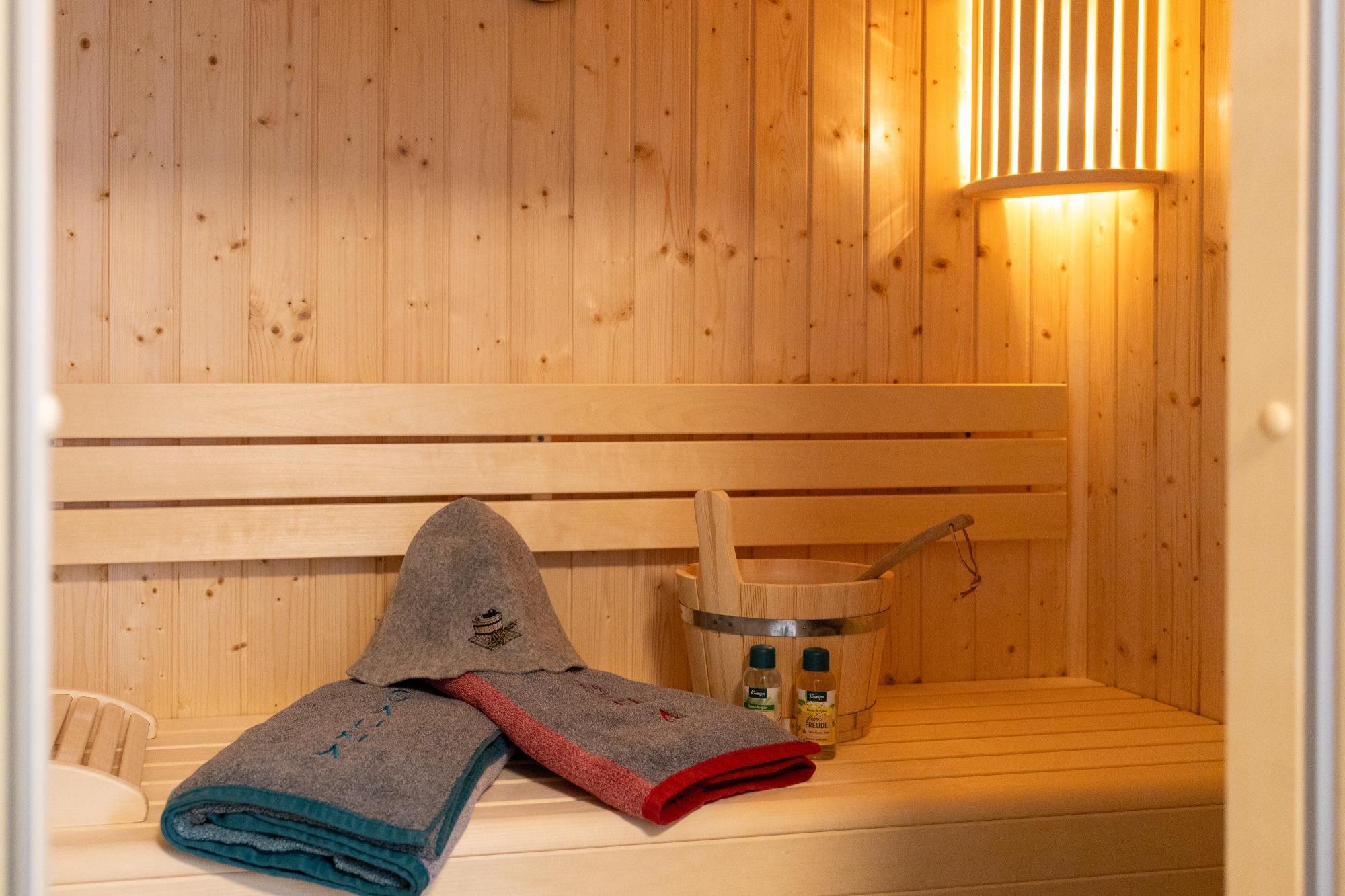 Wohn-/Essbereich mit offener Küche und Balkonzugang. Eine eigene Sauna im Bad.