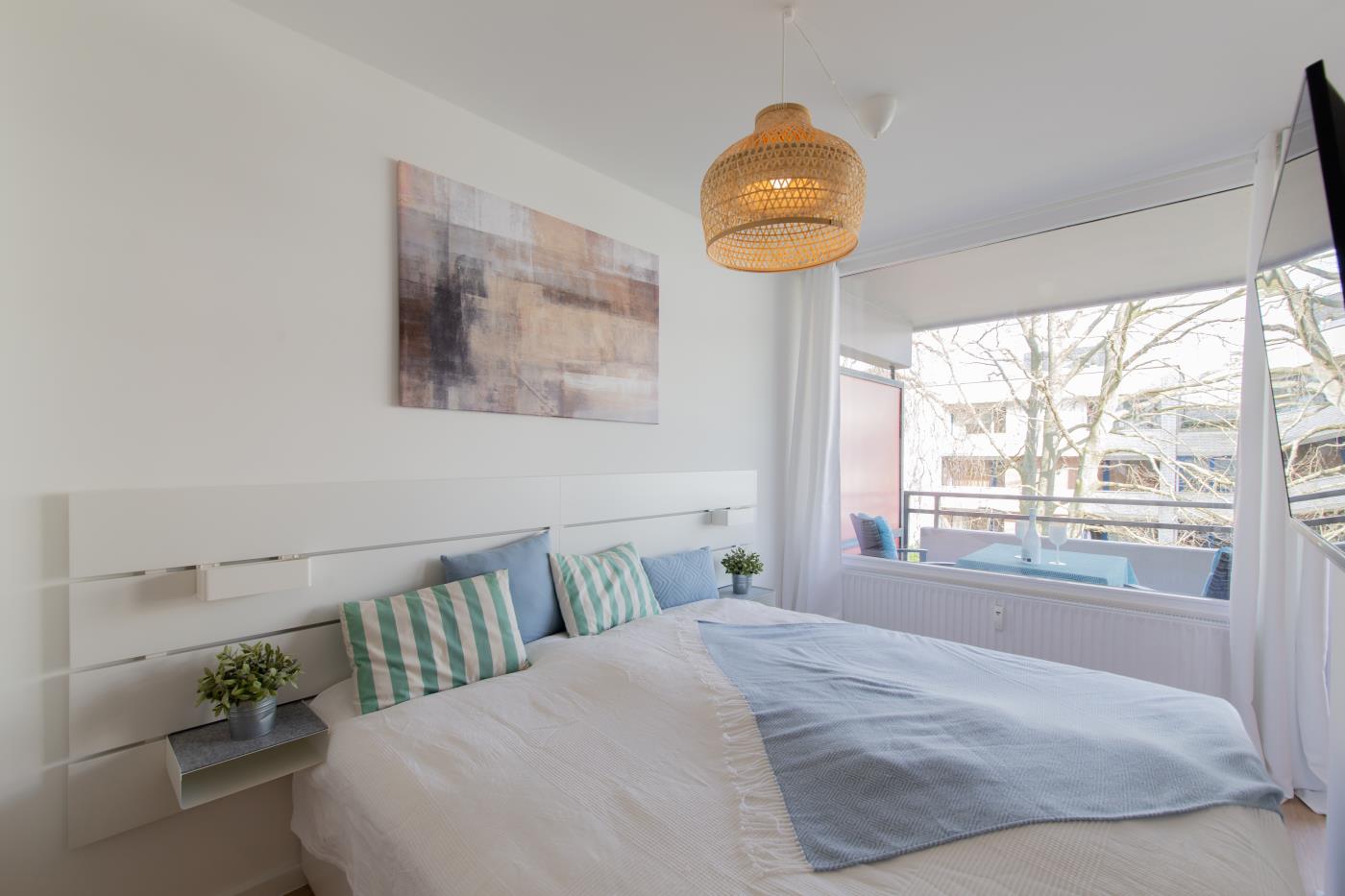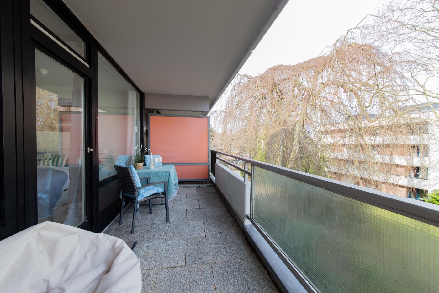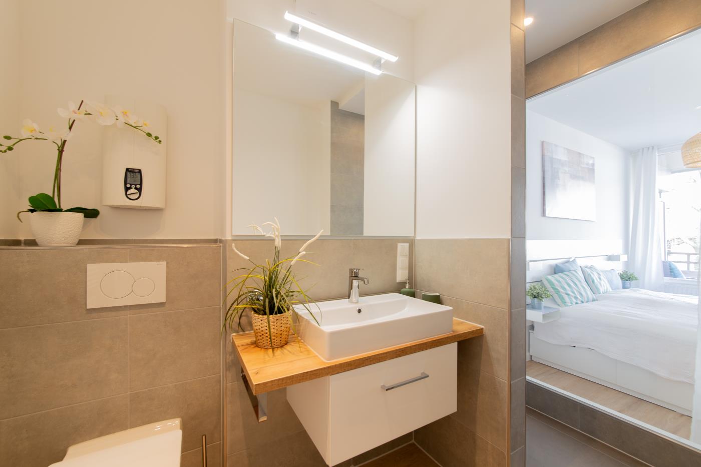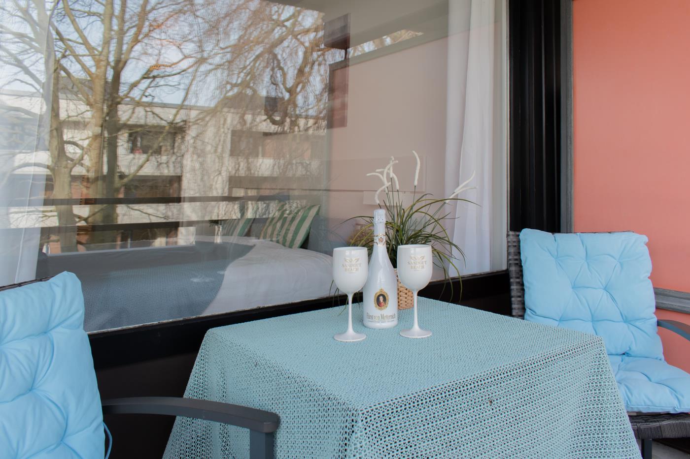 Die Wohnung überzeugt mit liebevoller Einrichtung. Der offene und lichtdurchflutete Wohn- und Essbereich ist stilvoll gestaltet und geschickt aufgeteilt. Die kleine, aber feine Küchenzeile ist voll ausgestattet. Eine gemütliche Sitzecke lädt zum gemeinsamen Verweilen ein und der angrenzende Essbereich bietet Platz für vier Personen. Eine große Fensterfront sorgt den ganzen Tag für eine helle und freundliche Atmosphäre. Von hieraus gelangen Sie auf den anliegenden Balkon. Das Schlafzimmer verfügt über ein gemütliches Doppelbett (1,80m Breite) und einen Kleiderschrank und kann mit einer Glastür zu einem separaten Raum getrennt werden. Das Bad besticht durch einen wärmenden Handtuchhalter und eine Raindance-Dusche.