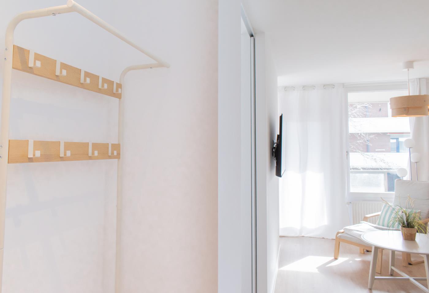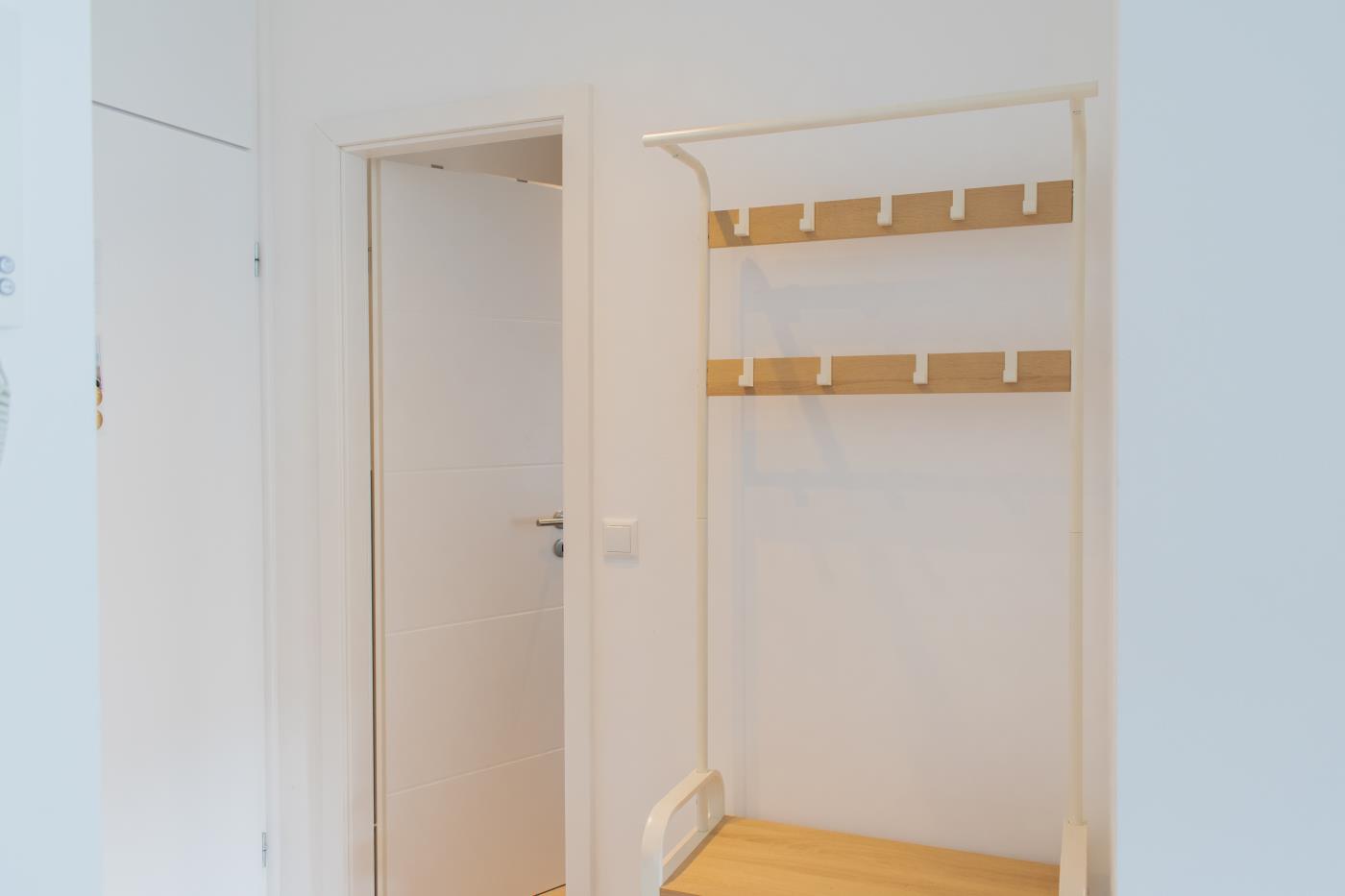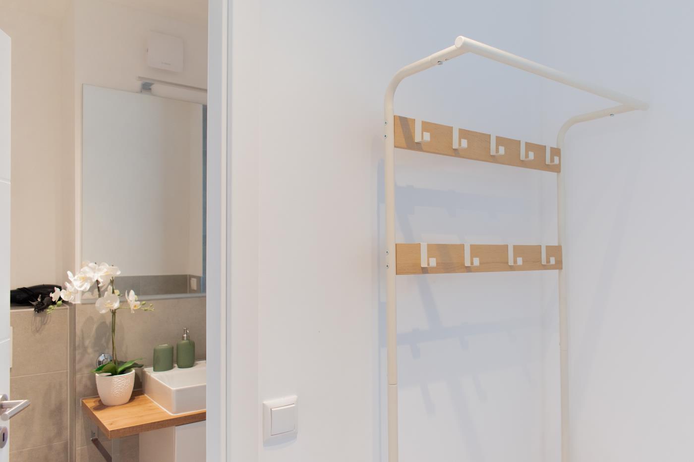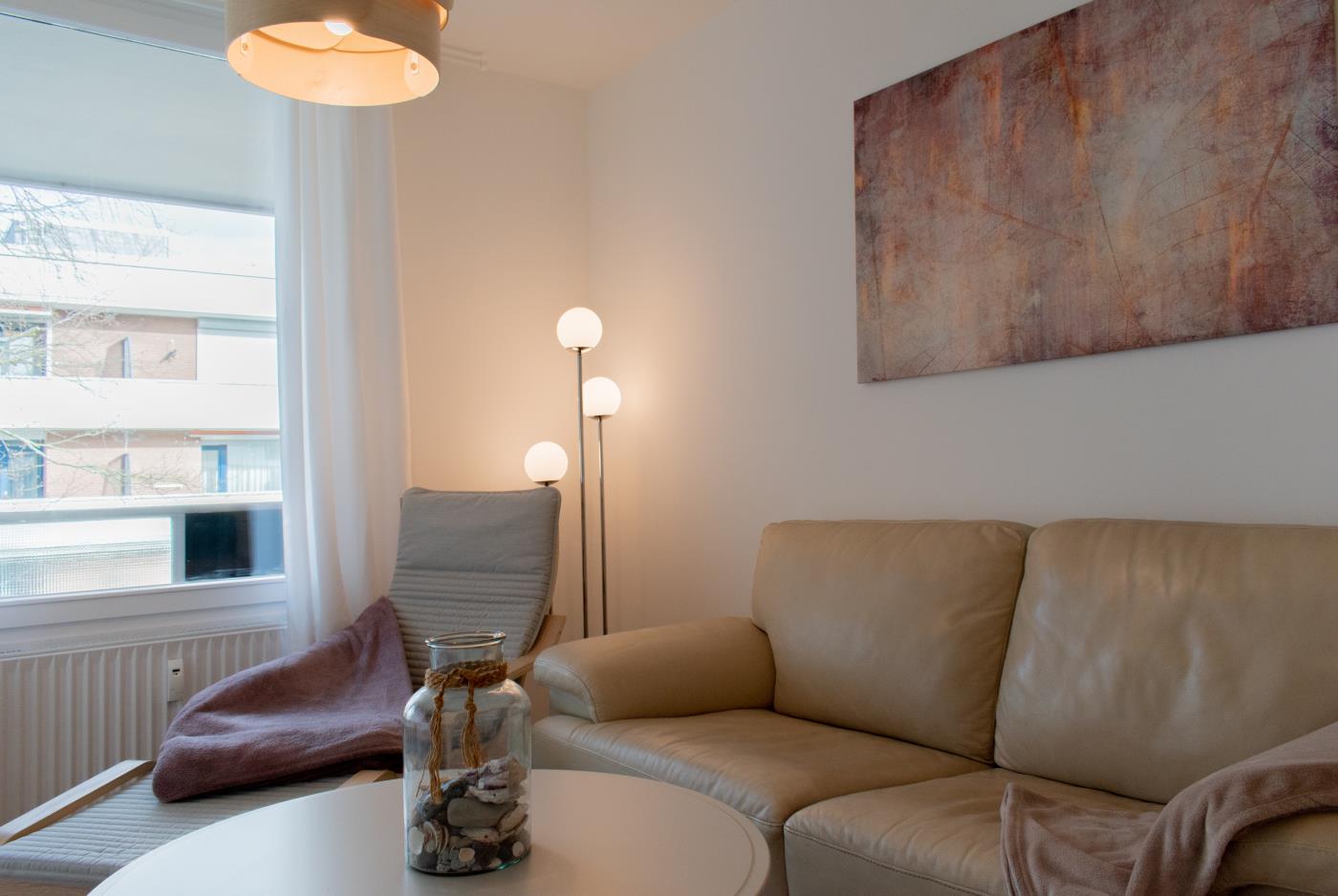 Die Wohnung überzeugt mit liebevoller Einrichtung. Der offene und lichtdurchflutete Wohn- und Essbereich ist stilvoll gestaltet und geschickt aufgeteilt. Die kleine, aber feine Küchenzeile ist voll ausgestattet. Eine gemütliche Sitzecke lädt zum gemeinsamen Verweilen ein und der angrenzende Essbereich bietet Platz für vier Personen. Eine große Fensterfront sorgt den ganzen Tag für eine helle und freundliche Atmosphäre. Von hieraus gelangen Sie auf den anliegenden Balkon. Das Schlafzimmer verfügt über ein gemütliches Doppelbett (1,80m Breite) und einen Kleiderschrank und kann mit einer Glastür zu einem separaten Raum getrennt werden. Das Bad besticht durch einen wärmenden Handtuchhalter und eine Raindance-Dusche.