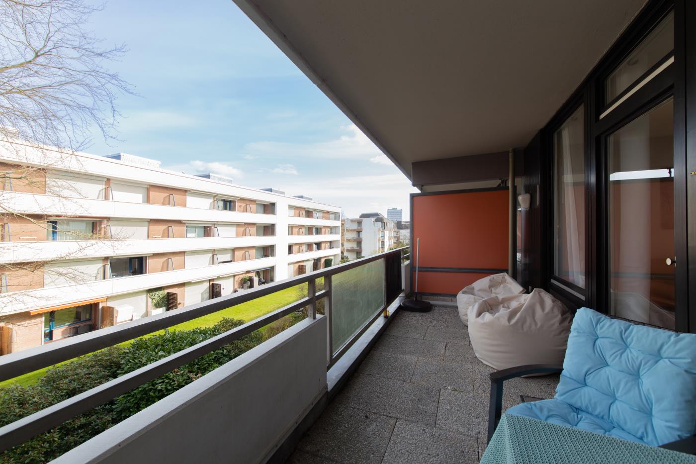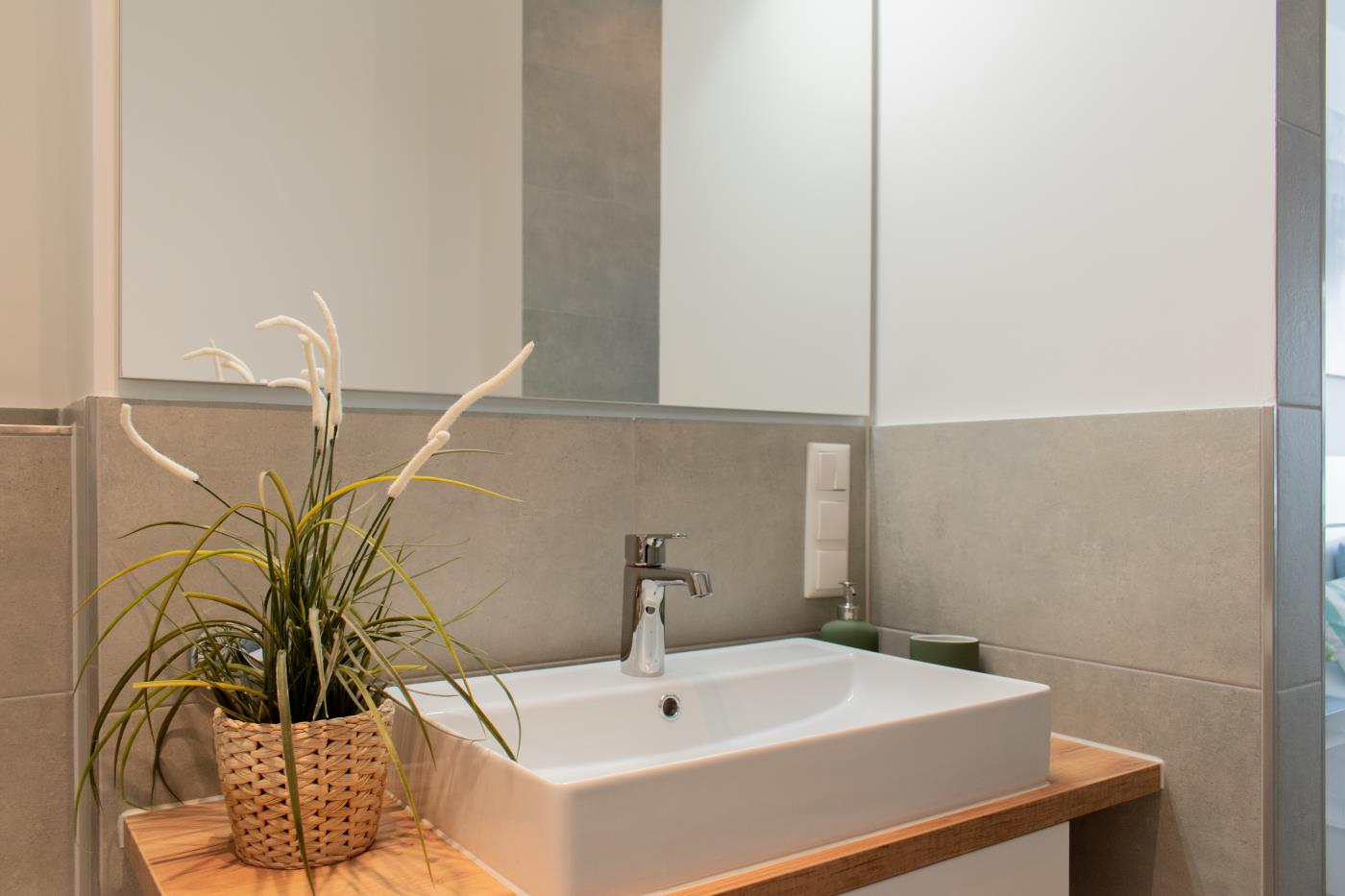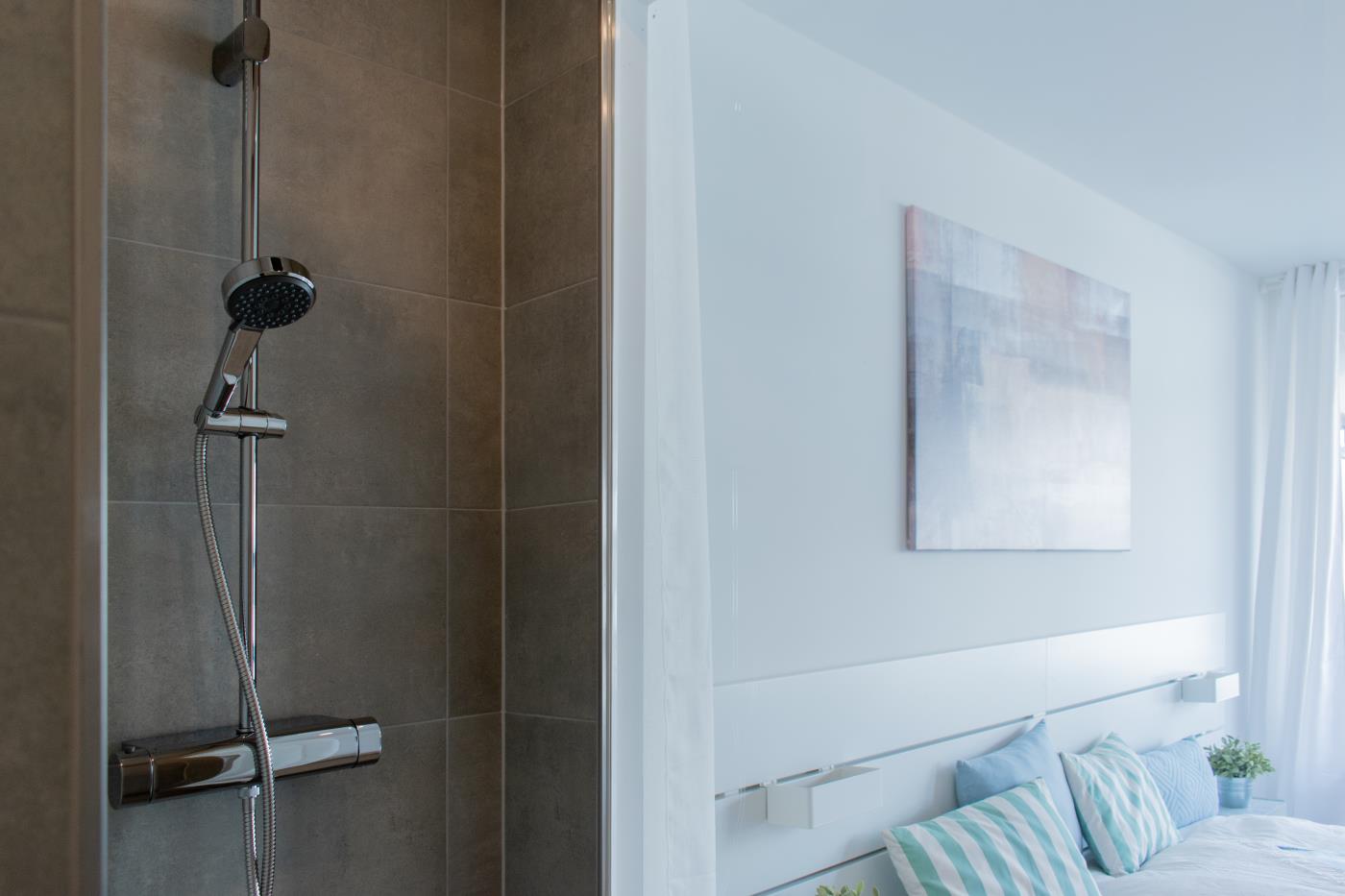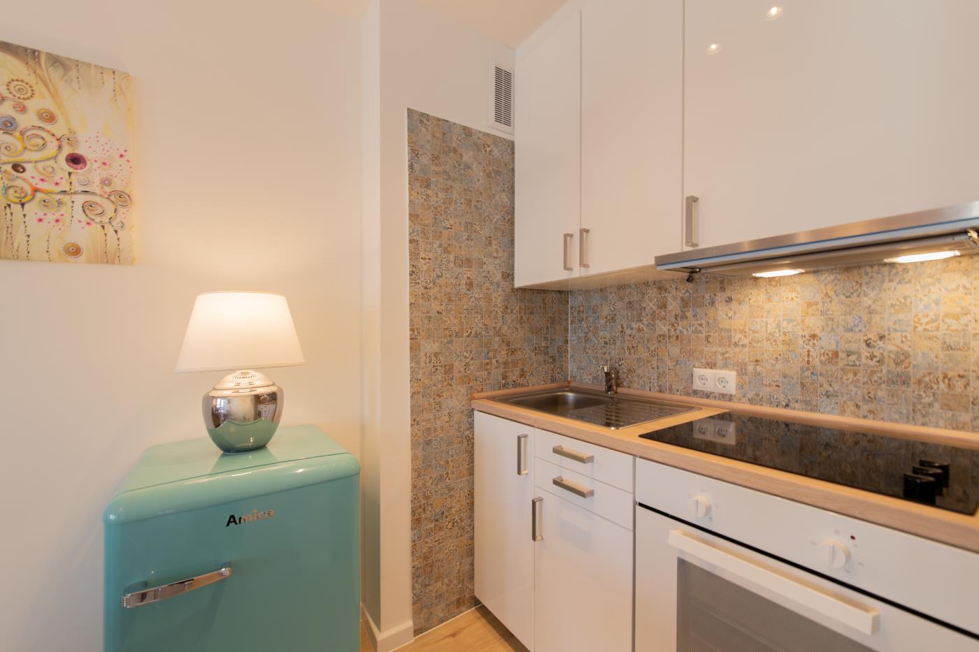Die Wohnung überzeugt mit liebevoller Einrichtung. Der offene und lichtdurchflutete Wohn- und Essbereich ist stilvoll gestaltet und geschickt aufgeteilt. Die kleine, aber feine Küchenzeile ist voll ausgestattet. Eine gemütliche Sitzecke lädt zum gemeinsamen Verweilen ein und der angrenzende Essbereich bietet Platz für vier Personen. Eine große Fensterfront sorgt den ganzen Tag für eine helle und freundliche Atmosphäre. Von hieraus gelangen Sie auf den anliegenden Balkon. Das Schlafzimmer verfügt über ein gemütliches Doppelbett (1,80m Breite) und einen Kleiderschrank und kann mit einer Glastür zu einem separaten Raum getrennt werden. Das Bad besticht durch einen wärmenden Handtuchhalter und eine Raindance-Dusche.