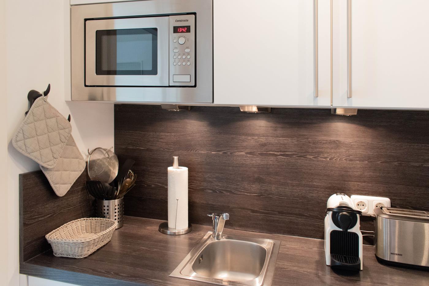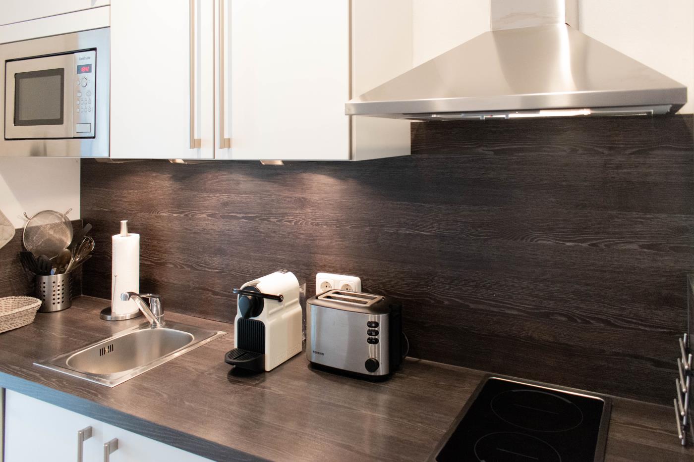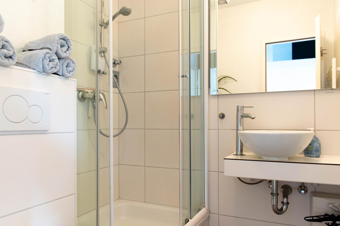 Die voll ausgestattete Küche bietet alles, was Sie für einen gelungenen Aufenthalt benötigen. Im separaten Schlafzimmer sorgt ein komfortables Doppelbett (1,60 m Breite) für erholsamen Schlaf. Das Badezimmer ist funktional eingerichtet und verfügt über Dusche und WC.
