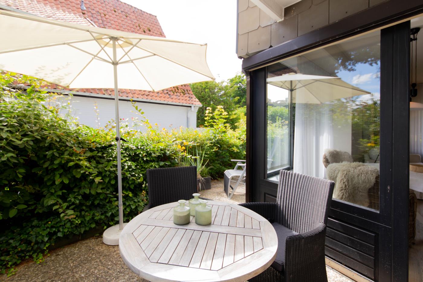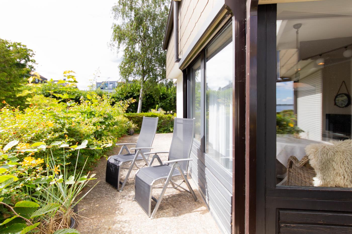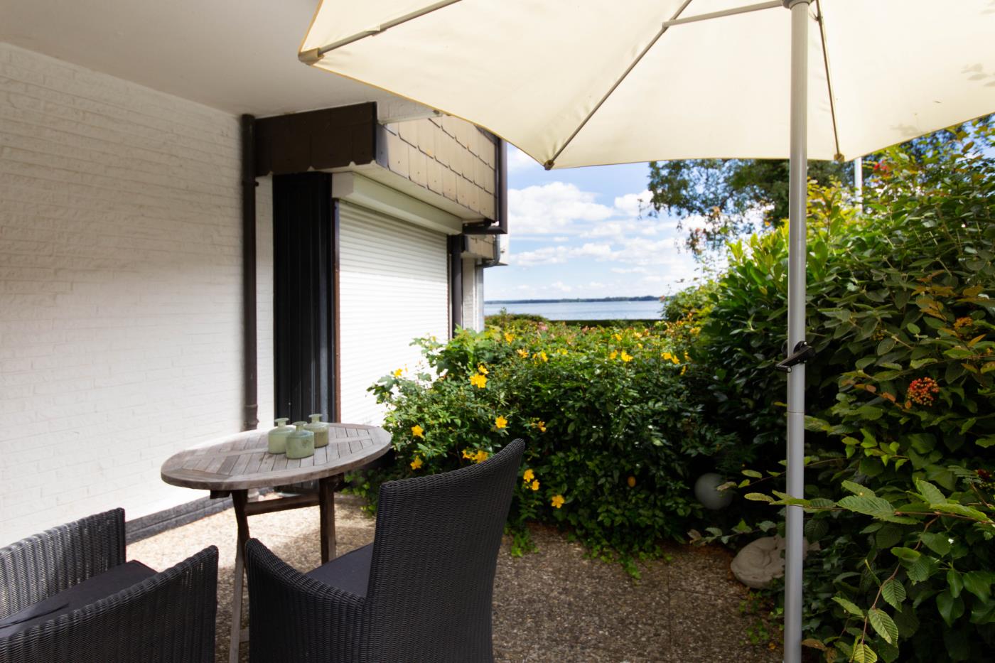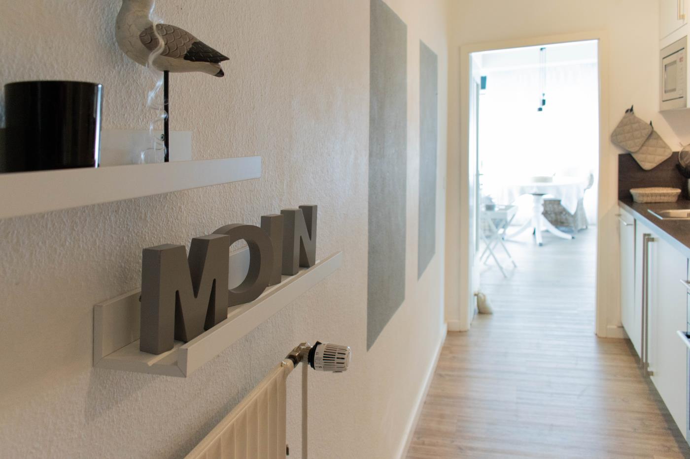 WohnenDie Ferienwohnung verfügt über zwei liebevoll gestaltete Zimmer und ist ideal für zwei Gäste geeignet. Das helle Wohnzimmer mit bodentiefen Fenstern schafft eine freundliche, lichtdurchflutete Atmosphäre und bietet direkten Zugang zur möblierten Terrasse mit Meerblick – perfekt für entspannte Stunden im Freien.