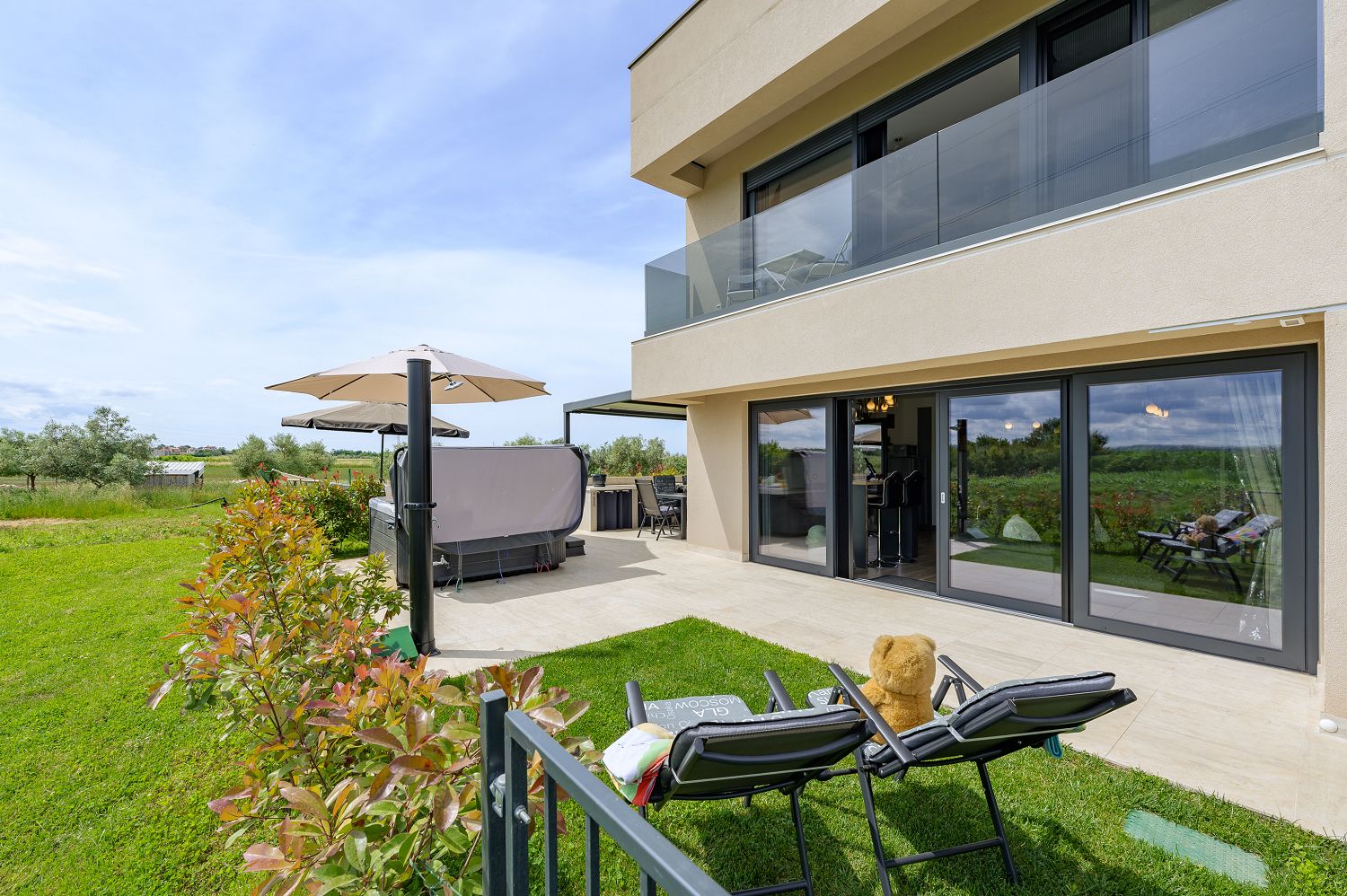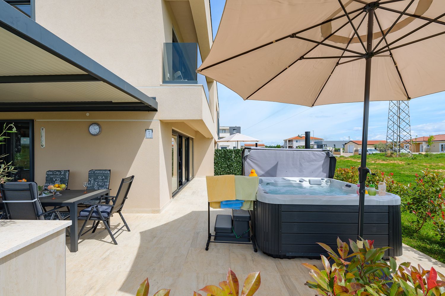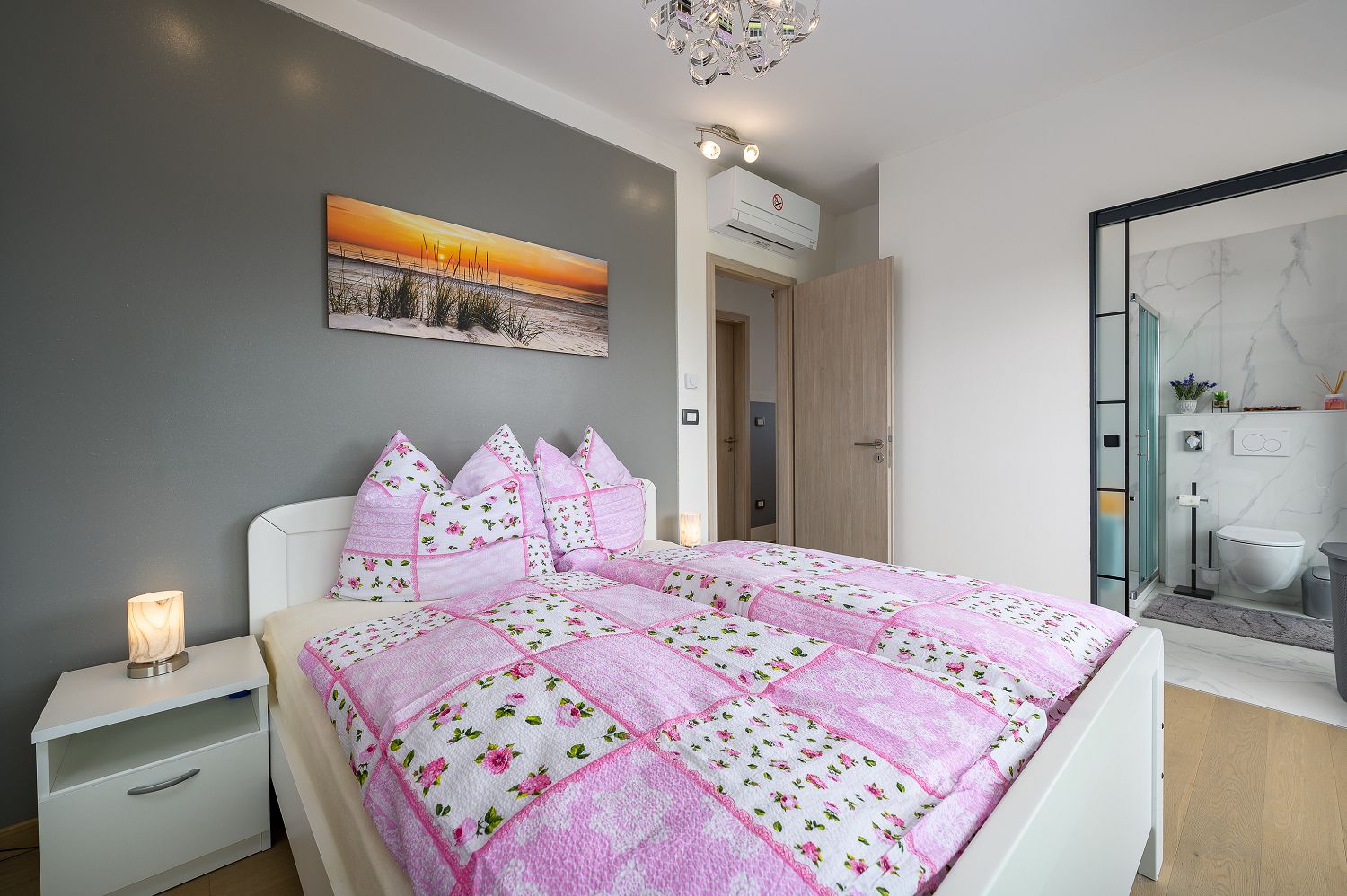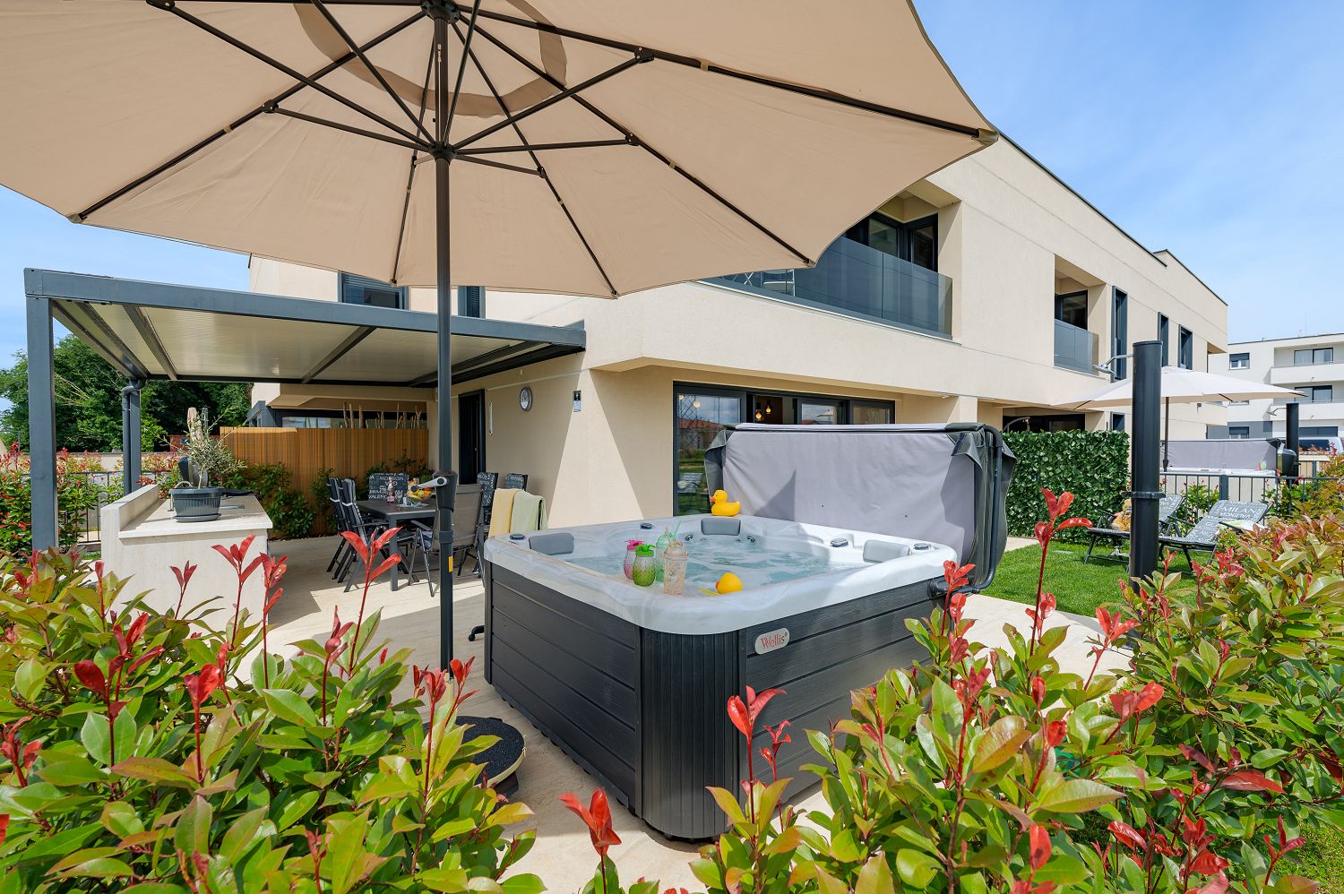 Dieses neue Apartment mit drei Schlafzimmern und einer Grundfläche von 105 m² bietet Ihnen einen komfortablen, offenen Wohnbereich mit einer voll ausgestatteten Küche sowie einem Ess- und Sitzbereich. Durch große Glastüren und Fenster ist dieser mit der Außenterrasse und dem Garten verbunden. Im Außenbereich können Sie ein Bad im privaten Whirlpool genießen und Ihre Abendessen in der Außenküche mit Grill und Essbereich zubereiten. Sowohl der Wohnbereich als auch die Schlafzimmer verfügen über eine Klimaanlage. Zwei Schlafzimmer sind mit einem großen Doppelbett ausgestattet, ein Schlafzimmer hat ein Einzelbett mit einem Zusatzbett, das bei Bedarf aus dem Hauptbett herausgezogen werden kann. Insgesamt bietet das Apartment Platz für maximal sechs schlafende Gäste. Wenn Sie dieses Apartment mieten, werden Bettwäsche und ein Satz Handtücher pro Person und Woche bereitgestellt. Im Preis inbegriffen sind die Kurtaxe, Parkplätze, WLAN und Satellitenfernsehprogramme. Haustiere sind in diesem Apartment nicht gestattet und der Hauptmieter muss mindestens 25 Jahre alt sein. Ein perfekter Ort für Familien und Freunde.