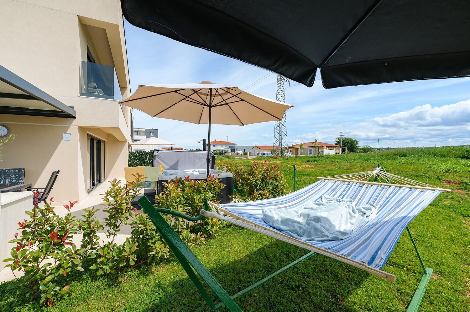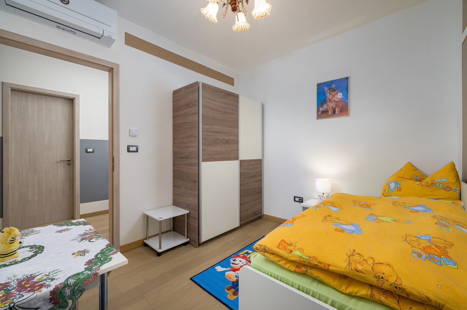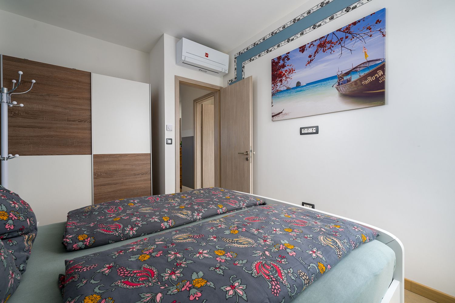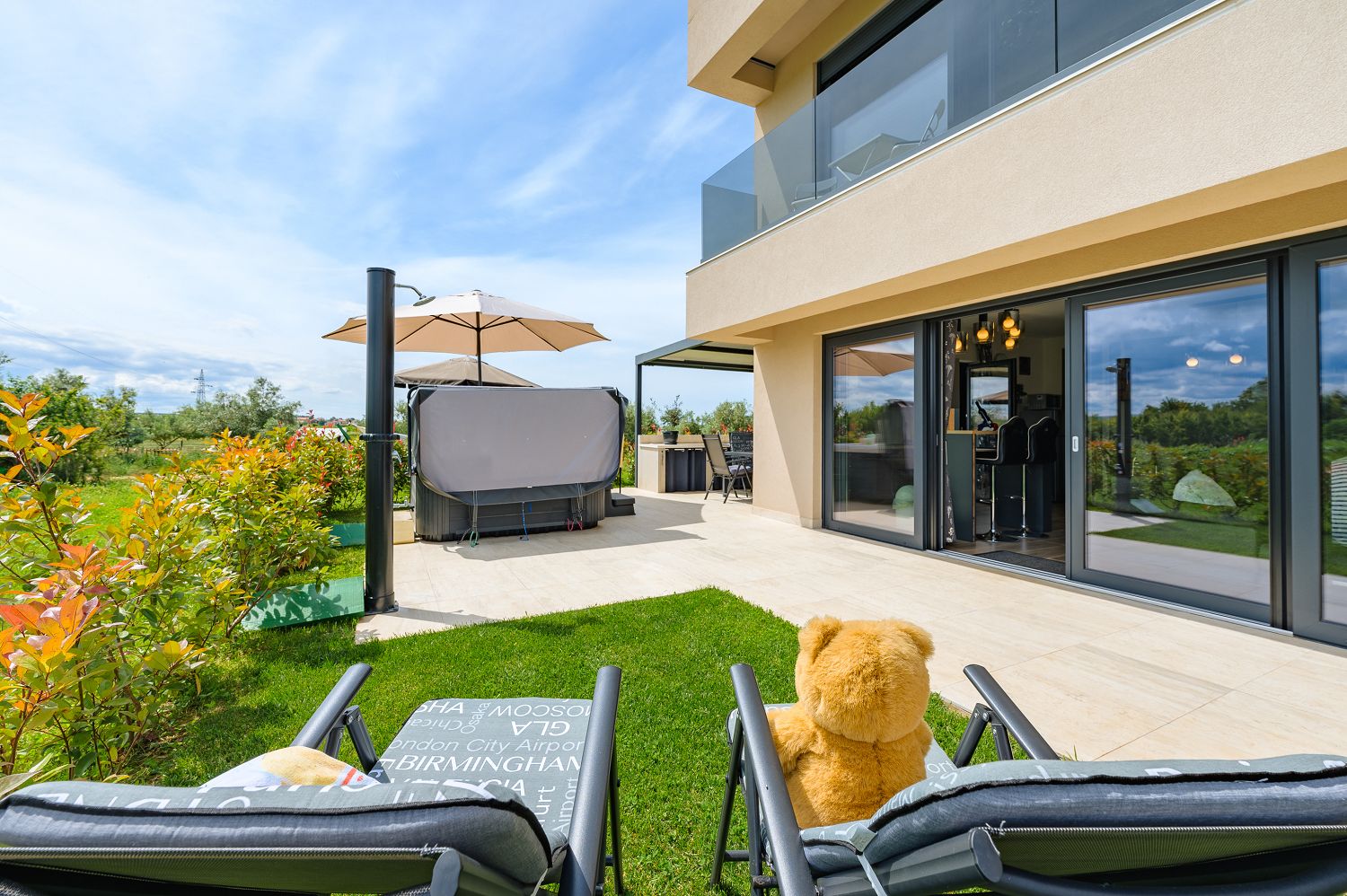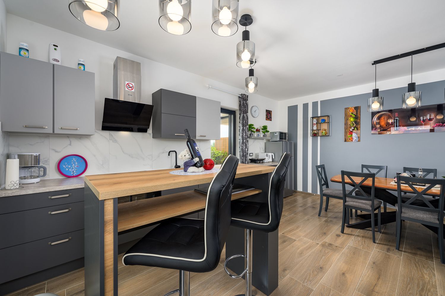 Dieses neue Apartment mit drei Schlafzimmern und einer Grundfläche von 105 m² bietet Ihnen einen komfortablen, offenen Wohnbereich mit einer voll ausgestatteten Küche sowie einem Ess- und Sitzbereich. Durch große Glastüren und Fenster ist dieser mit der Außenterrasse und dem Garten verbunden. Im Außenbereich können Sie ein Bad im privaten Whirlpool genießen und Ihre Abendessen in der Außenküche mit Grill und Essbereich zubereiten. Sowohl der Wohnbereich als auch die Schlafzimmer verfügen über eine Klimaanlage. Zwei Schlafzimmer sind mit einem großen Doppelbett ausgestattet, ein Schlafzimmer hat ein Einzelbett mit einem Zusatzbett, das bei Bedarf aus dem Hauptbett herausgezogen werden kann. Insgesamt bietet das Apartment Platz für maximal sechs schlafende Gäste. Wenn Sie dieses Apartment mieten, werden Bettwäsche und ein Satz Handtücher pro Person und Woche bereitgestellt. Im Preis inbegriffen sind die Kurtaxe, Parkplätze, WLAN und Satellitenfernsehprogramme. Haustiere sind in diesem Apartment nicht gestattet und der Hauptmieter muss mindestens 25 Jahre alt sein. Ein perfekter Ort für Familien und Freunde.