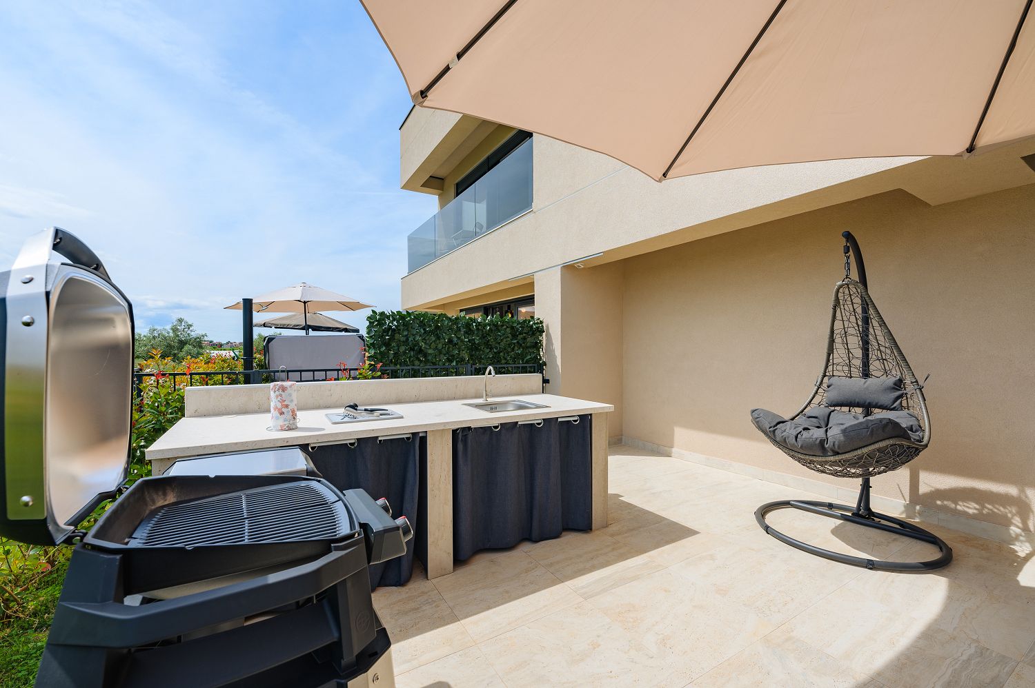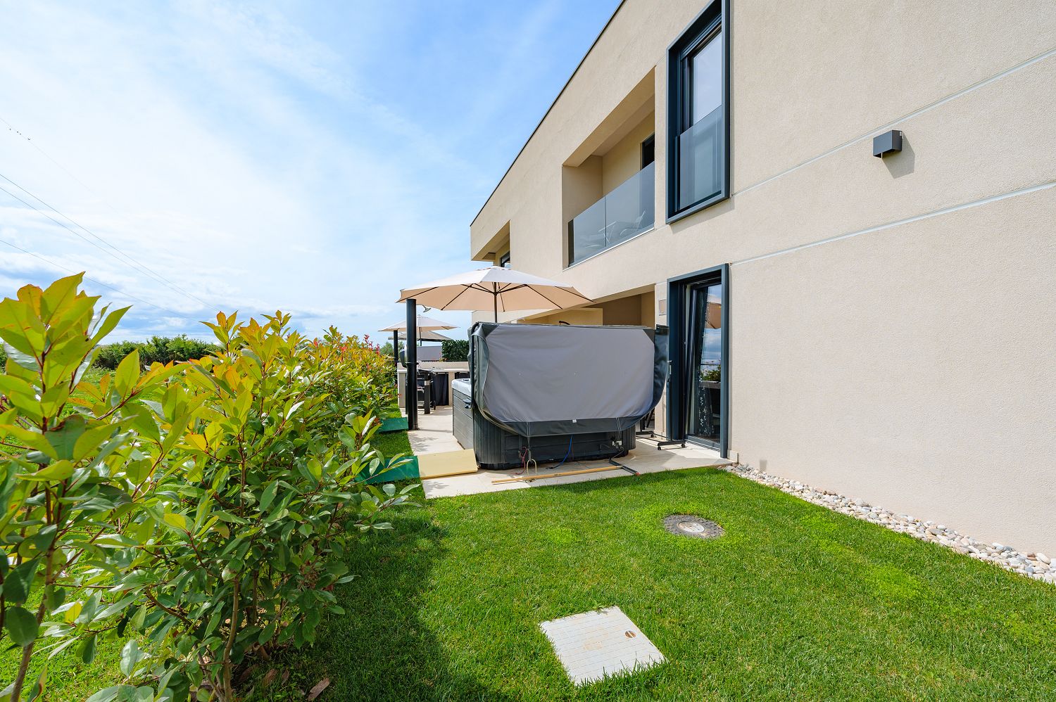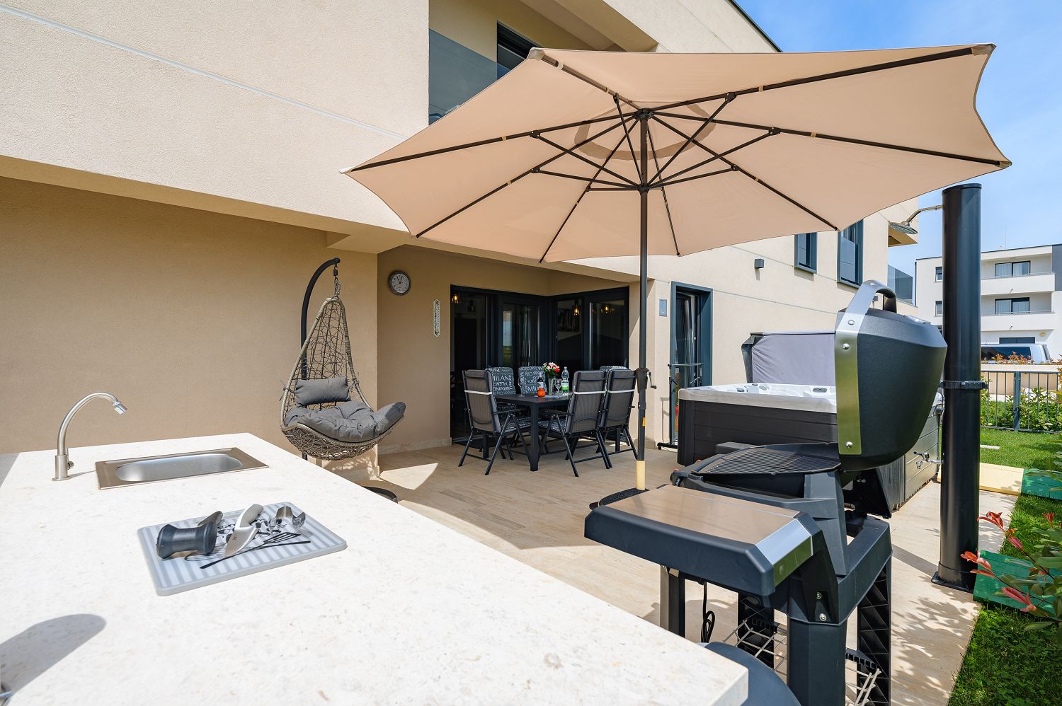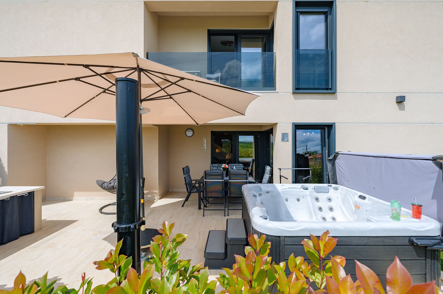 Dieses neue Apartment mit drei Schlafzimmern und einer Grundfläche von 100 m² bietet Ihnen einen komfortablen, offenen Wohnbereich mit einer voll ausgestatteten Küche sowie einem Ess- und Sitzbereich. Durch große Glastüren und Fenster ist dieser mit der Außenterrasse und dem Garten verbunden. Im Außenbereich können Sie ein Bad im privaten Whirlpool genießen und Ihre Abendessen in der Außenküche mit Grill und Essbereich zubereiten. Sowohl der Wohnbereich als auch die Schlafzimmer verfügen über eine Klimaanlage. Zwei Schlafzimmer sind mit einem großen Doppelbett ausgestattet, ein Schlafzimmer hat ein Etagenbett. Somit können maximal sechs Gäste im Apartment übernachten. Wenn Sie dieses Apartment mieten, werden Bettwäsche und ein Satz Handtücher pro Person und Woche bereitgestellt. Im Preis inbegriffen sind die Kurtaxe, Parkplätze, eine WLAN-Verbindung und Satellitenfernsehprogramme. Haustiere sind in diesem Apartment nicht gestattet und der Hauptmieter muss mindestens 25 Jahre alt sein. Ein perfekter Ort für Familien und Freunde!