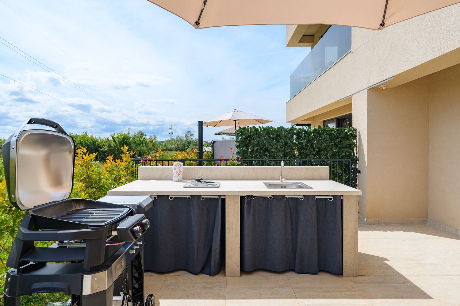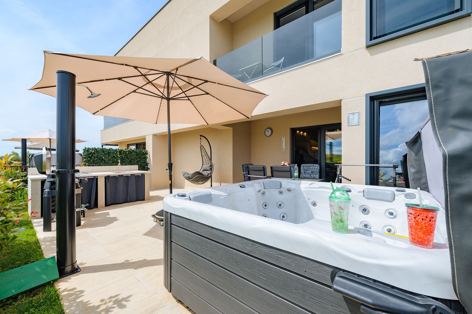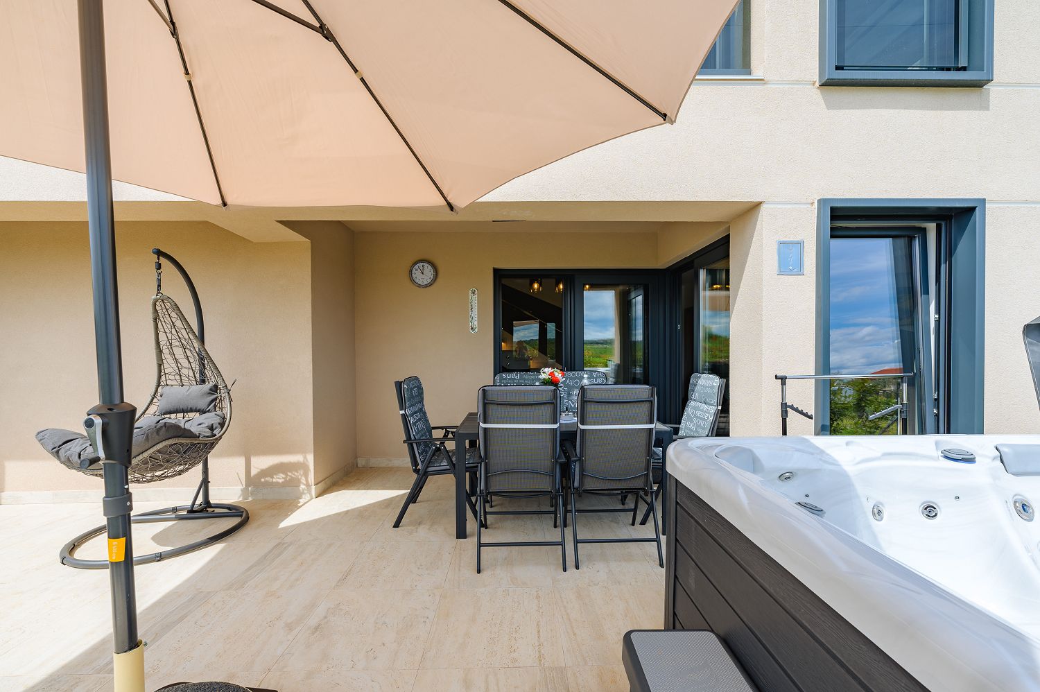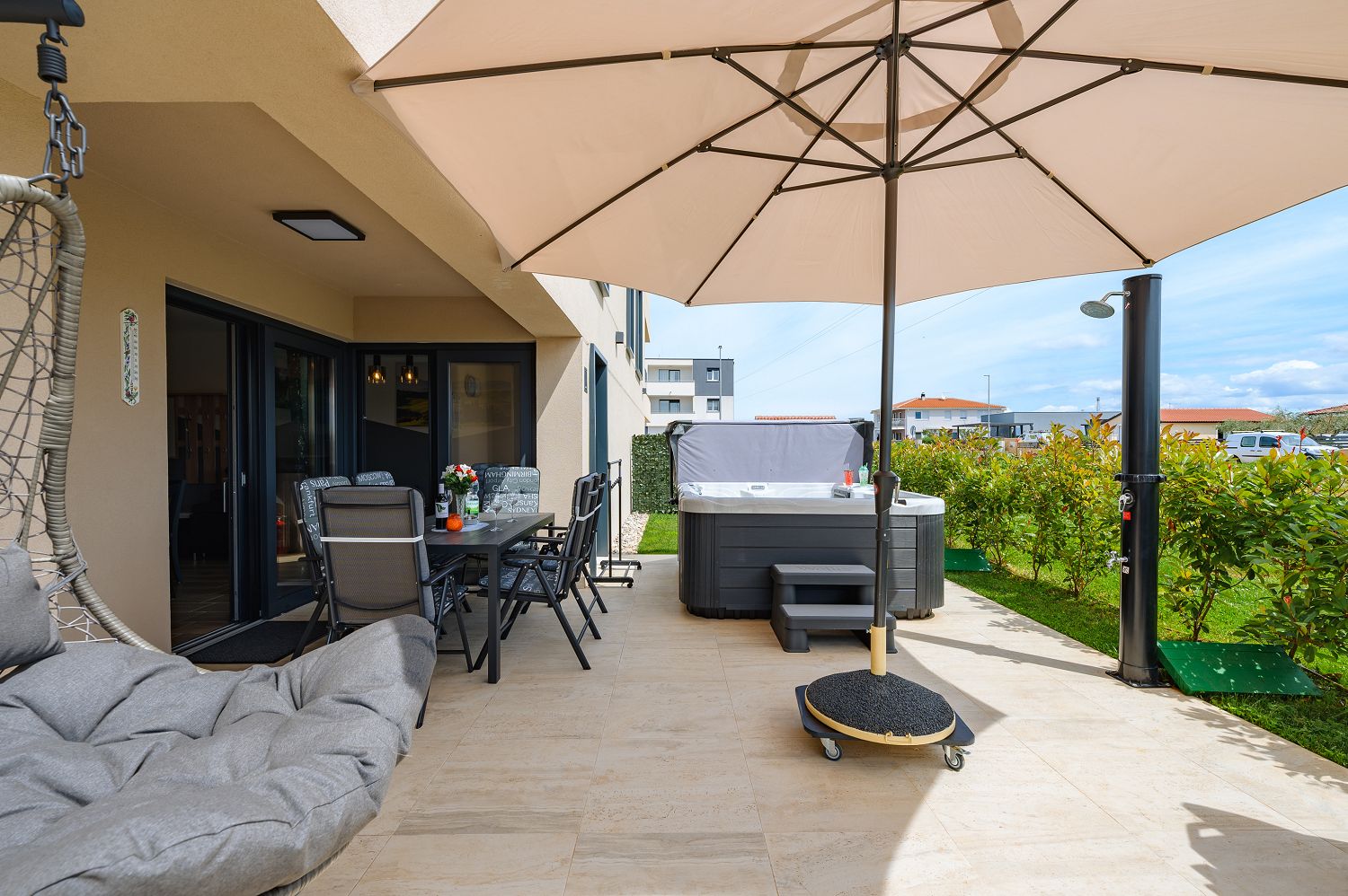 Dieses neue Apartment mit drei Schlafzimmern und einer Grundfläche von 100 m² bietet Ihnen einen komfortablen, offenen Wohnbereich mit einer voll ausgestatteten Küche sowie einem Ess- und Sitzbereich. Durch große Glastüren und Fenster ist dieser mit der Außenterrasse und dem Garten verbunden. Im Außenbereich können Sie ein Bad im privaten Whirlpool genießen und Ihre Abendessen in der Außenküche mit Grill und Essbereich zubereiten. Sowohl der Wohnbereich als auch die Schlafzimmer verfügen über eine Klimaanlage. Zwei Schlafzimmer sind mit einem großen Doppelbett ausgestattet, ein Schlafzimmer hat ein Etagenbett. Somit können maximal sechs Gäste im Apartment übernachten. Wenn Sie dieses Apartment mieten, werden Bettwäsche und ein Satz Handtücher pro Person und Woche bereitgestellt. Im Preis inbegriffen sind die Kurtaxe, Parkplätze, eine WLAN-Verbindung und Satellitenfernsehprogramme. Haustiere sind in diesem Apartment nicht gestattet und der Hauptmieter muss mindestens 25 Jahre alt sein. Ein perfekter Ort für Familien und Freunde!