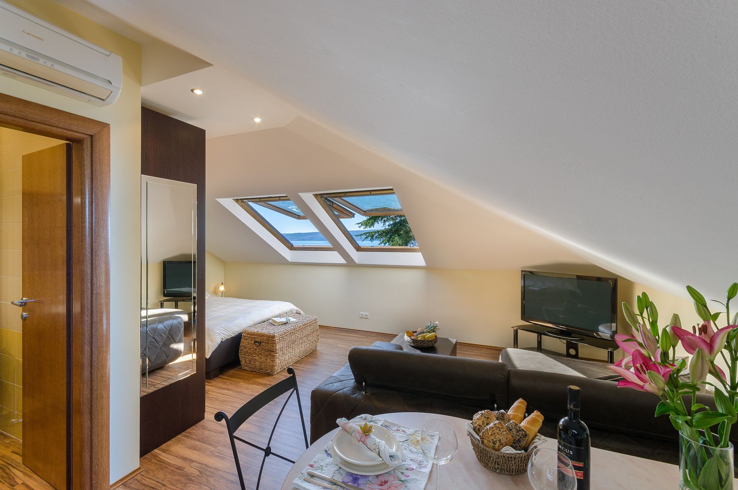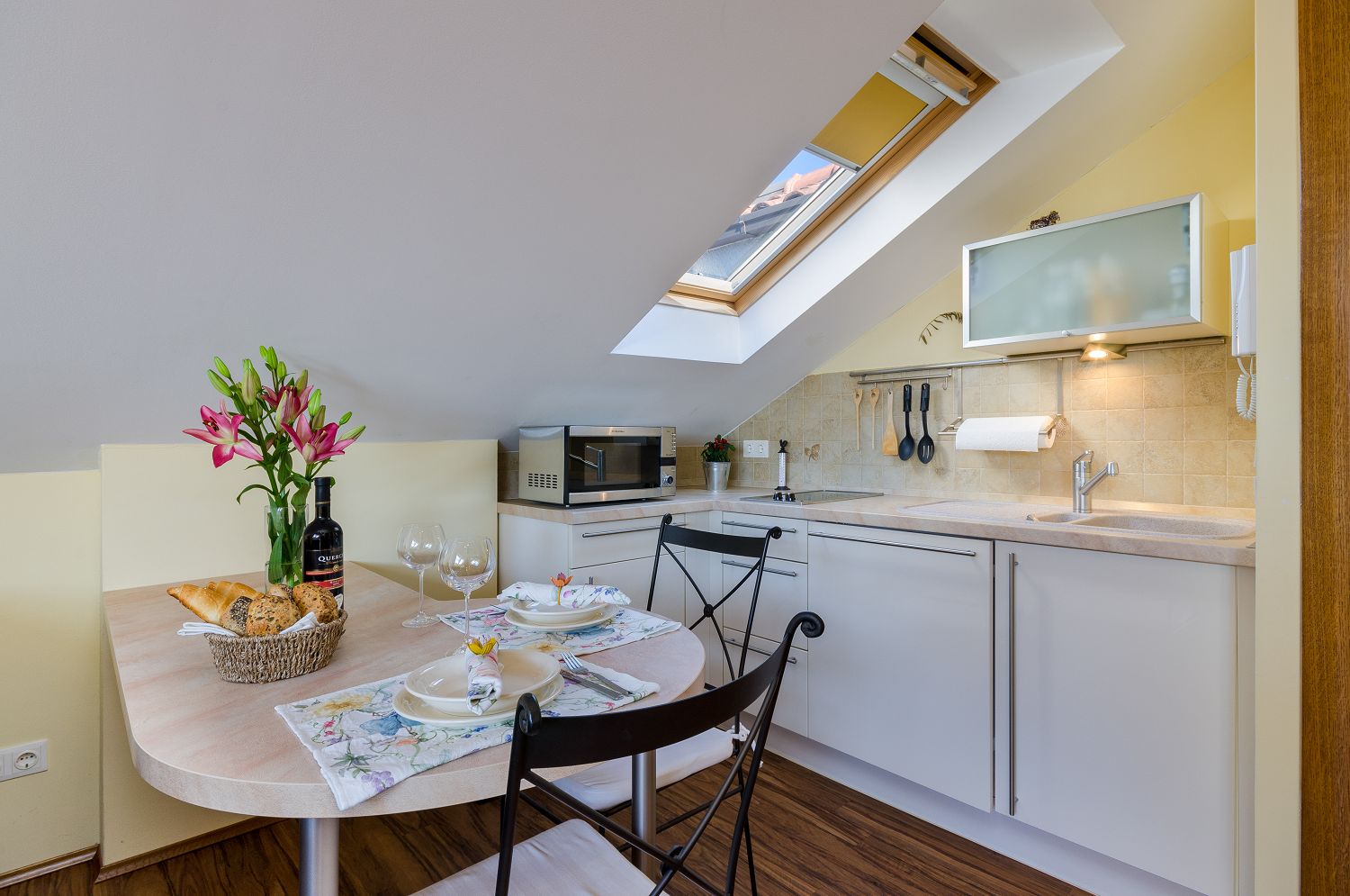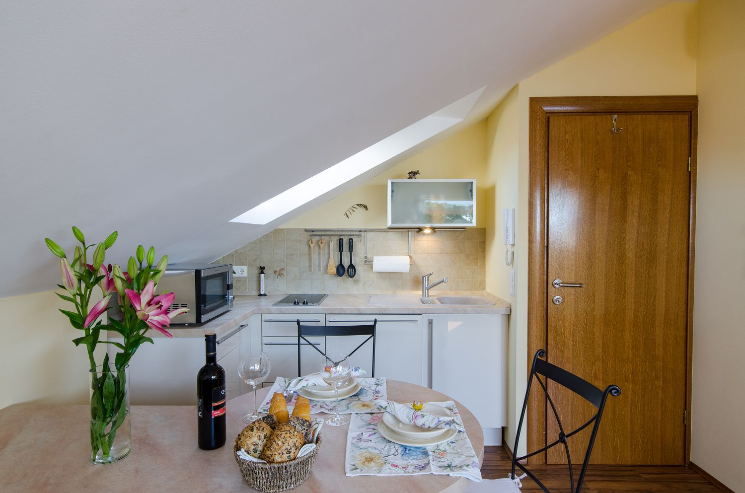 Ein luxuriös eingerichtetes Studioappartement in unmittelbarer Nähe zum Meer! Die Wohnung befindet sich im schönsten Stadtteil von Crikvenica, „Crni Mol“ genannt, und ist nur eine Gehminute vom beliebten Sandstrand entfernt. Von der Wohnung aus hat man einen wunderschönen Meerblick, der Ihnen einen unvergesslichen Urlaub garantiert. Neben der Standardausstattung verfügt diese Wohnung über einen großen Flachbildfernseher mit Satellitenanschluss, einen WLAN-Anschluss, eine Solar-Warmwasserversorgung und eine Bodenheizung für kältere Tage. Auf derselben Etage befindet sich ein Wäscheraum mit Wäschetrockner. Die Küche ist sehr gut ausgestattet mit einer Filterkaffeemaschine, einem Eierkocher usw. Vor dem Eingang befindet sich ein Balkon, der für diese Wohnung vorgesehen ist und als Durchgang zur zweiten Ferienwohnung auf dieser Etage genutzt wird, da er am Treppenaufgang liegt. Auf der 140 m² großen Etage befinden sich zwei Penthousewohnungen, darunter diese 30 m² große Wohnung. Ihnen steht ein kostenfreier Privatparkplatz auf dem Grundstück zur Verfügung.