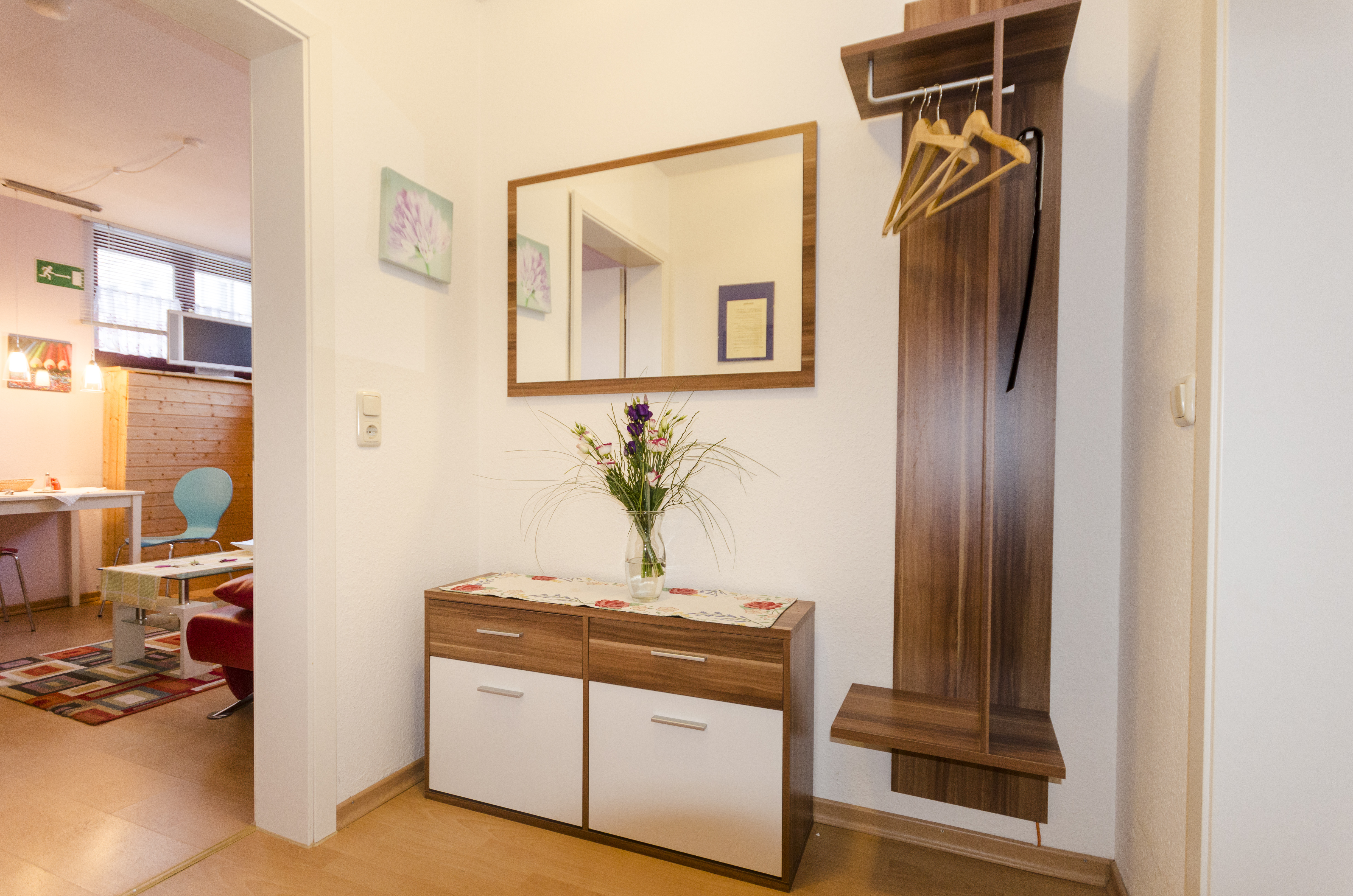 Die gmütliche Ferienwohnung Nautilus ist eine Souterrainwohnung. Sie verfügt über einen Wohn/Essbereich mit Schlafcouch (140x200), Wohnzimmermöbeln und Flachbildschirm sowie kleiner Essgruppe. Einen Flur mit Garderobe und ein separates Schlafzimmer mit Doppelbett und großem Kleiderschrank gehören ebenfalls zur Wohnung.