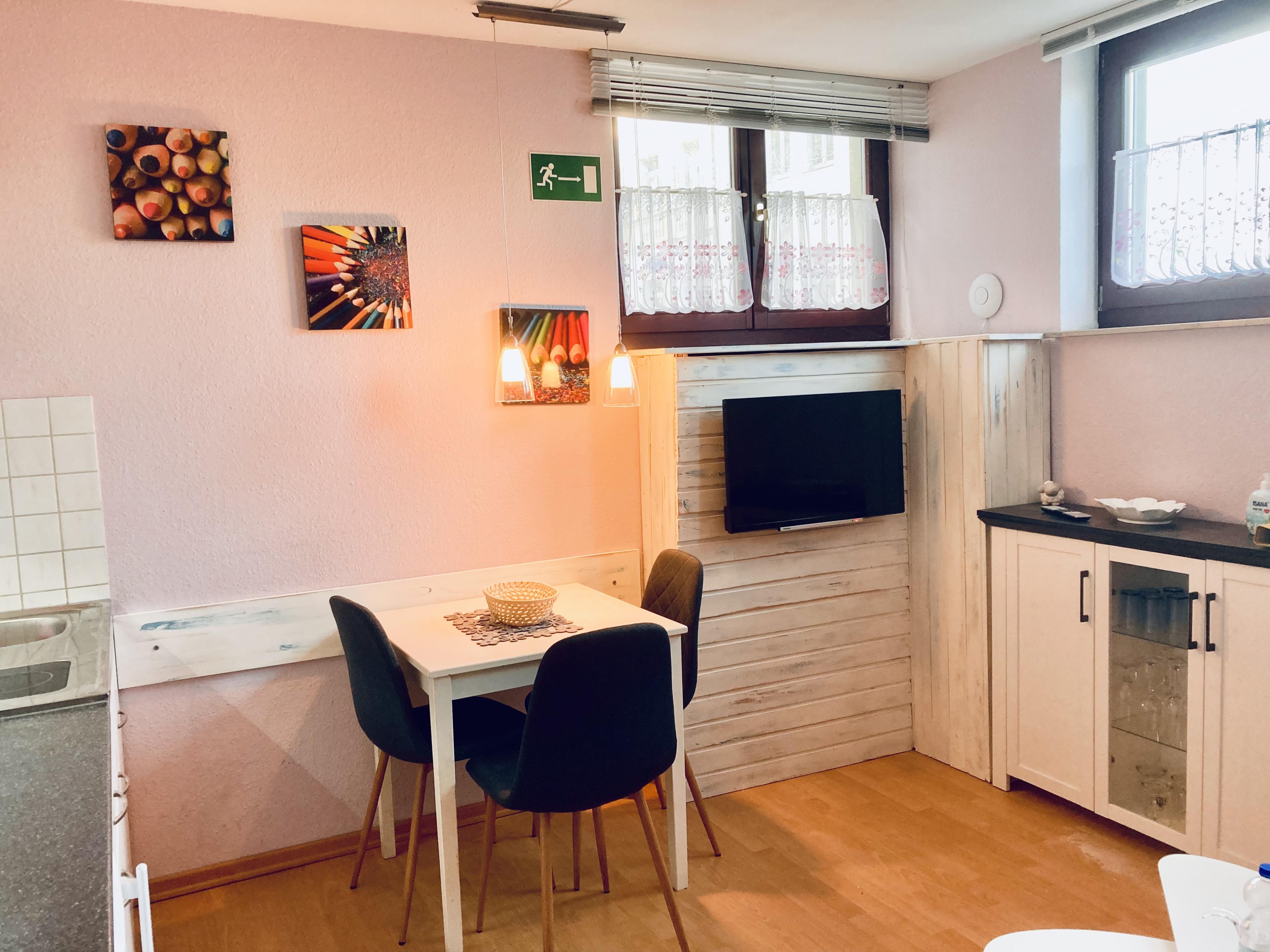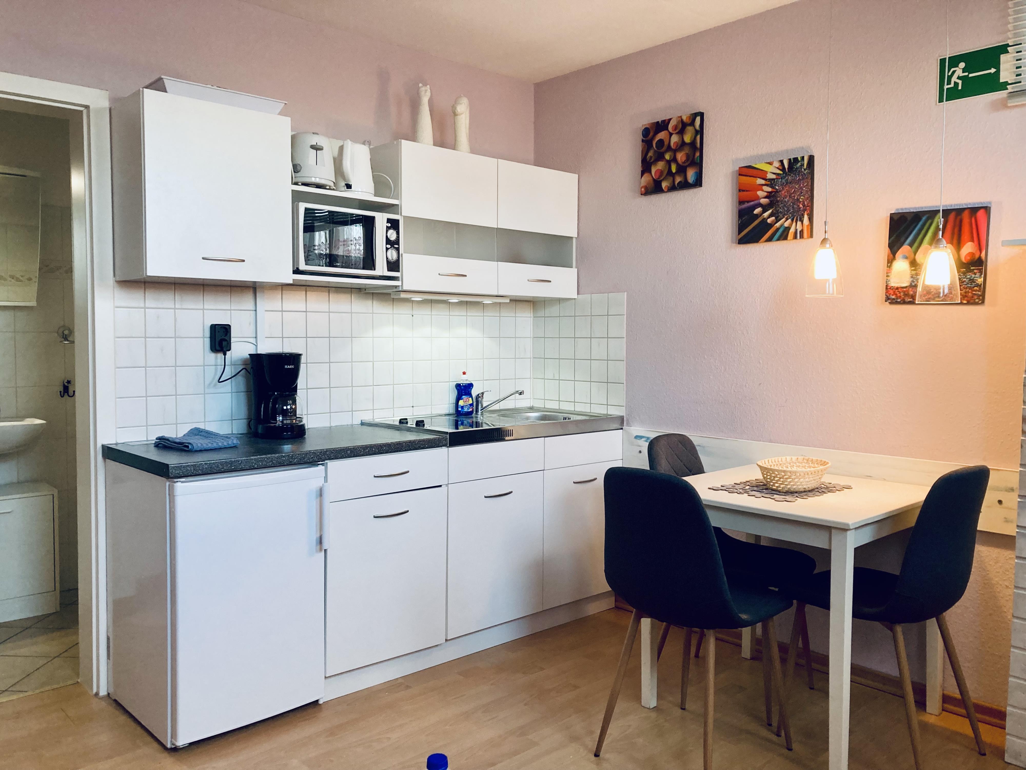Die FeWo Nautilus verfügt über eine voll ausgestattete Küchenzeile mit Zweiplatten -Herd, Kühlschrank und Mikrowelle