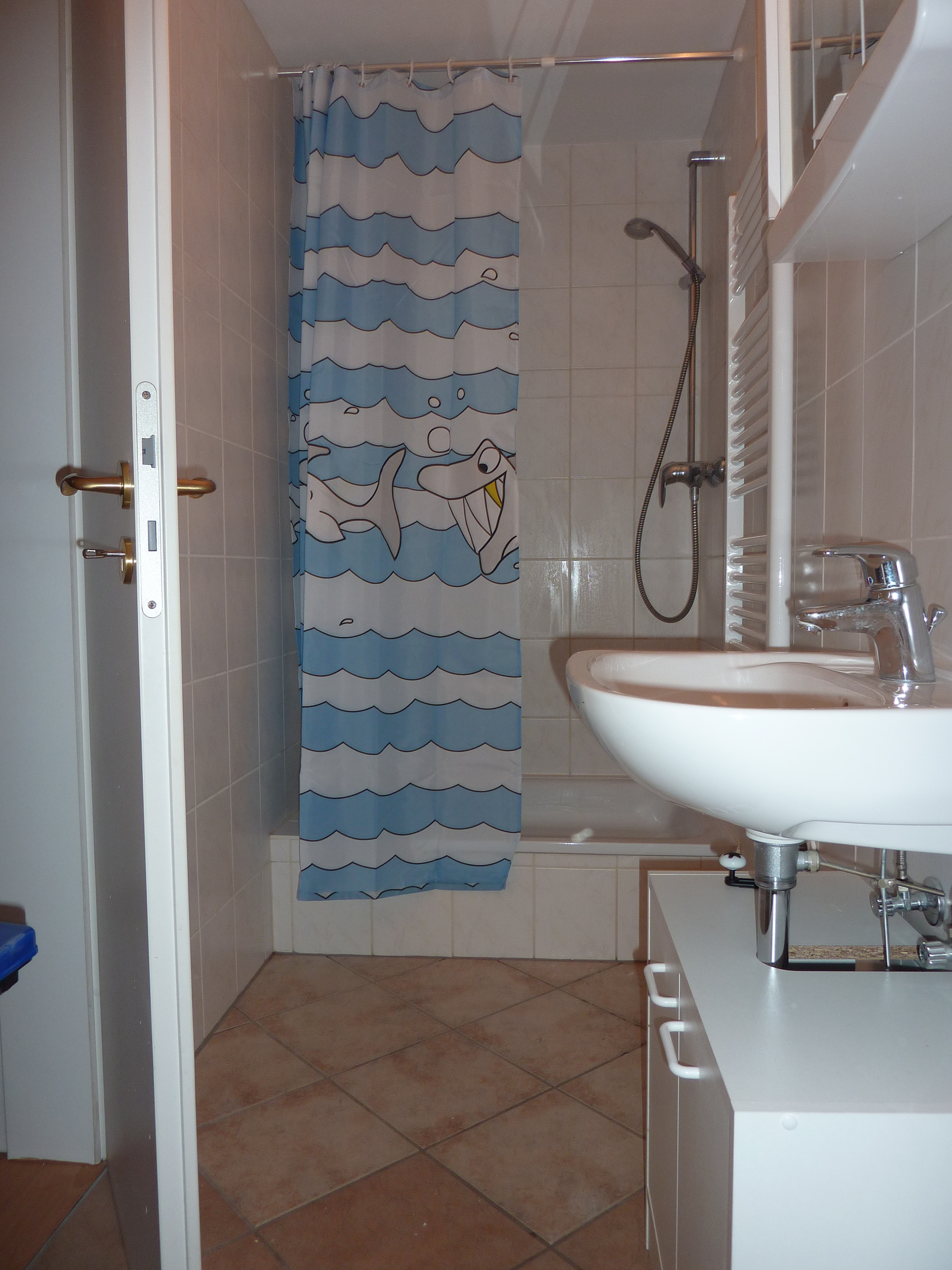 Das Badezimmer verfügt über eine Dusche und eine separate Toilette mit Fenster.