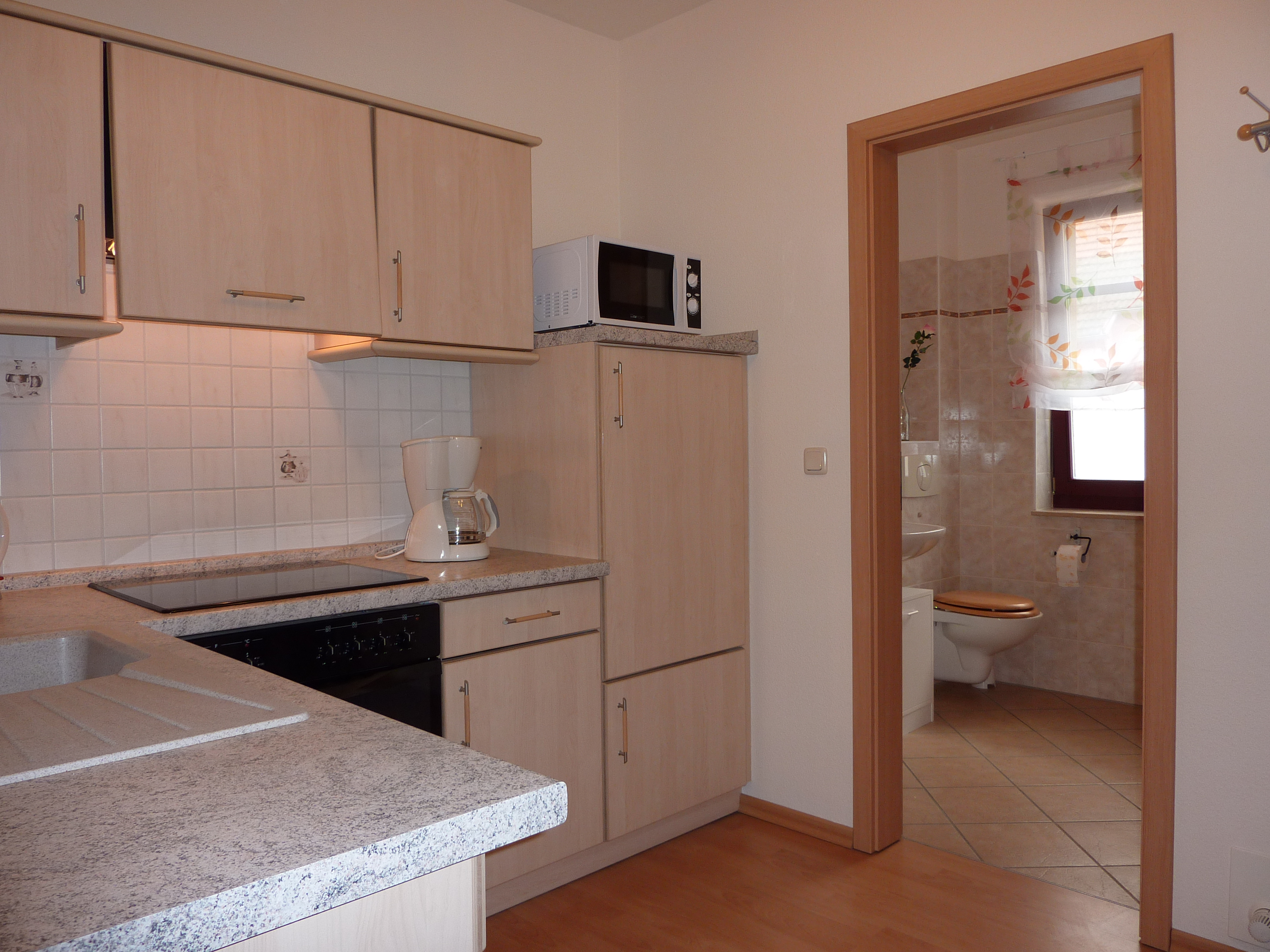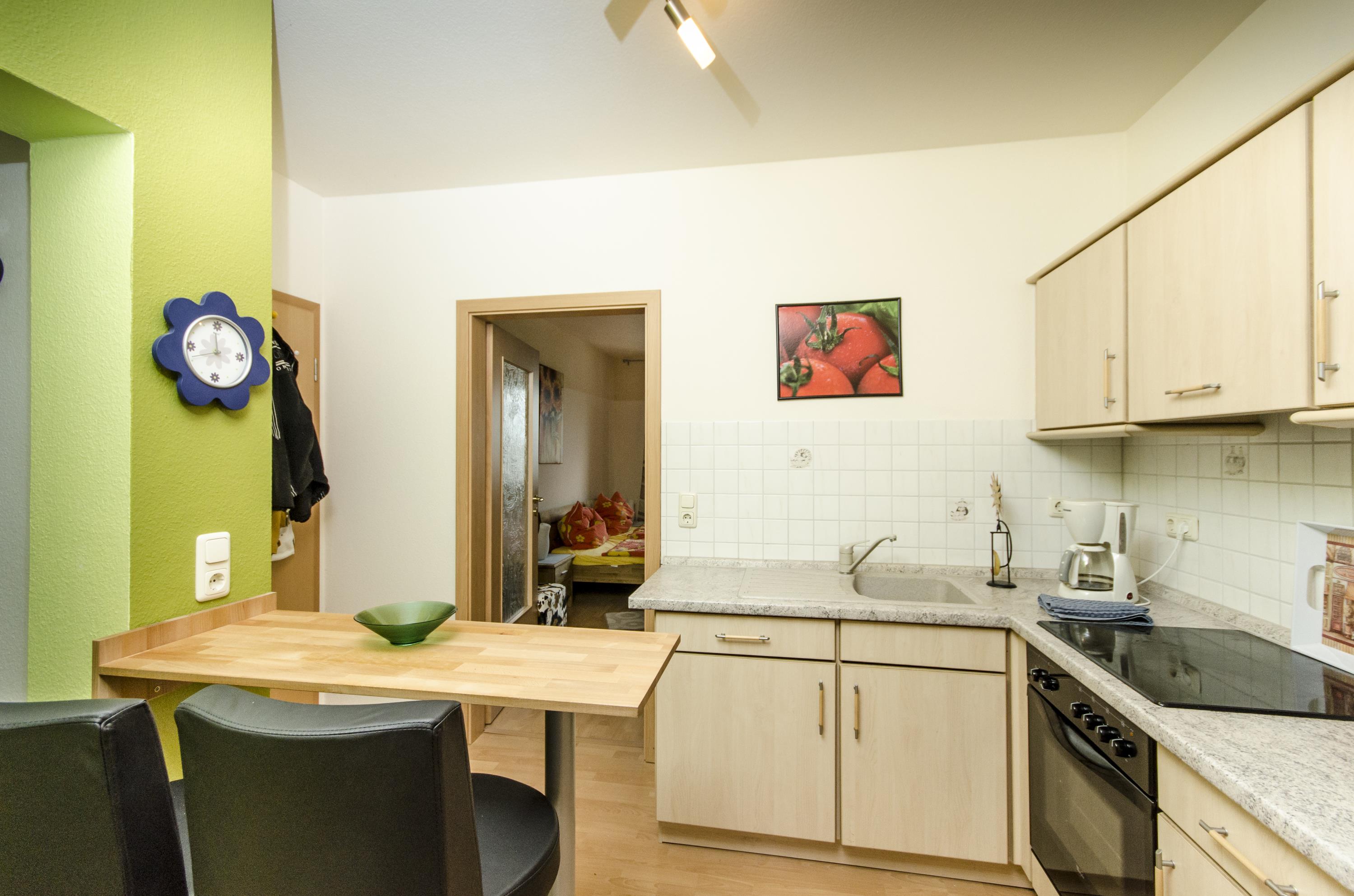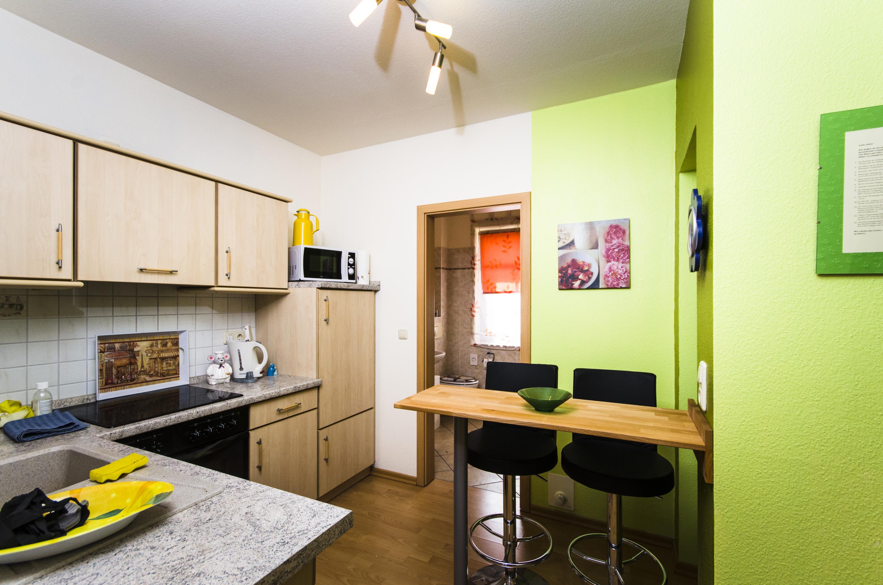 Die FeWo Schwerin verfügt über eine Einbauküche mit Herd (Ceranfeld), Backofen,Mikrowelle, Kühlschrank mit Eisfach, Elektrogeräte: Wasserkocher,Toaster und Kaffeemaschine sowie eine Komplettausstattung mit Koch- und Küchenutensilien.