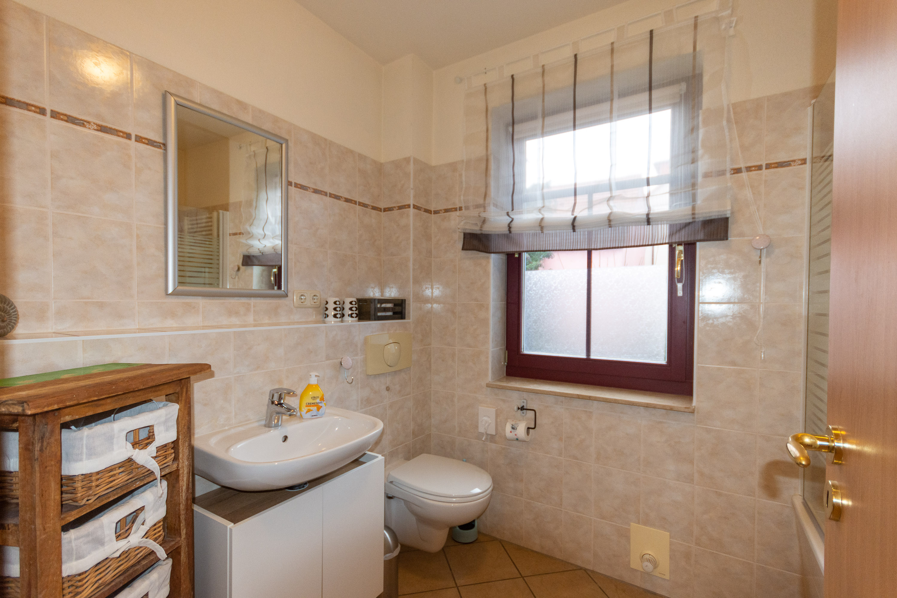 Das Tageslichtbad verfügt über eine Badewanne mit Dusche.