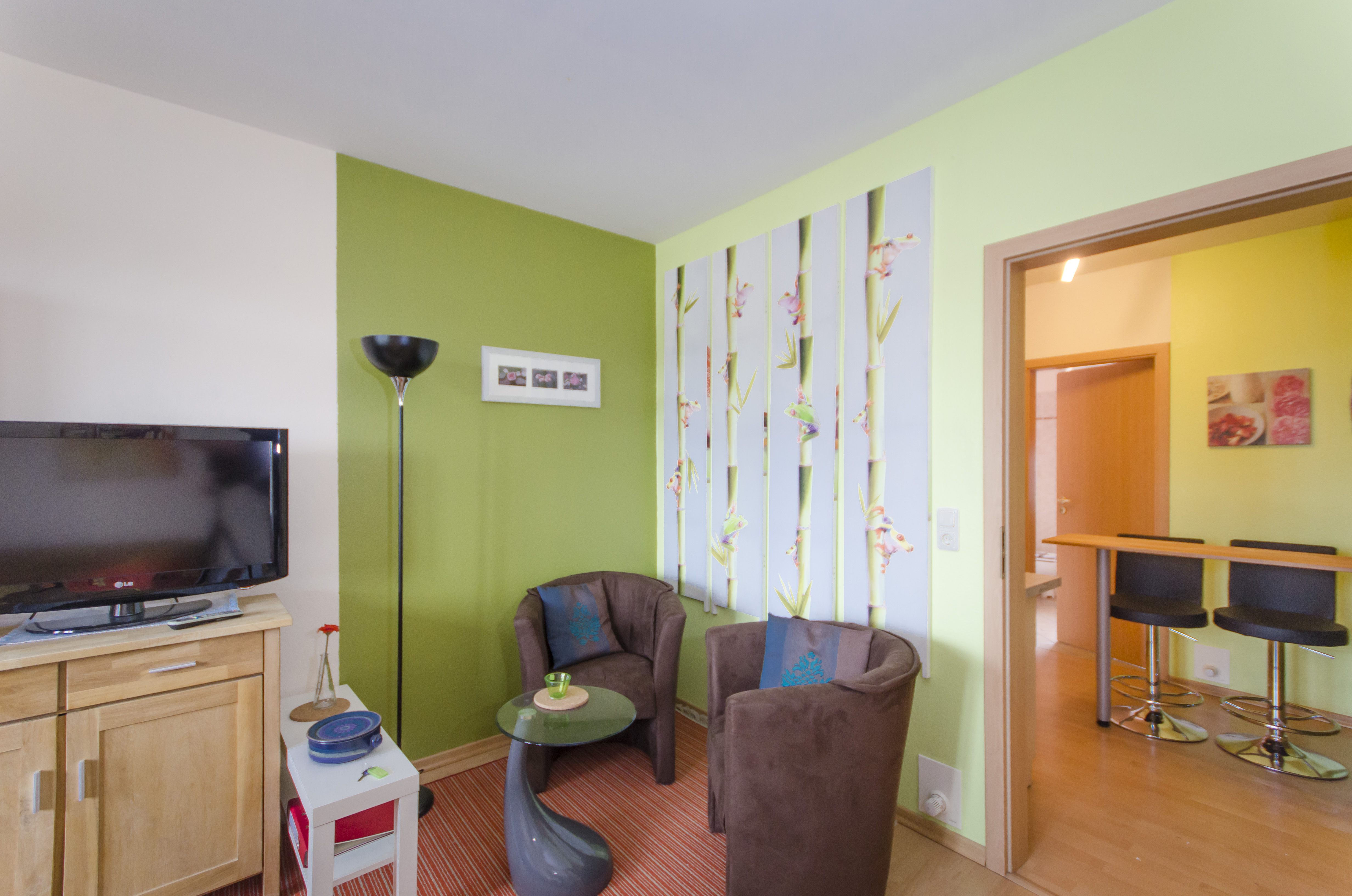 Die Ferienwohnung Schwerin liegt in der ersten Etage. Sie verfügt über einen Wohn-Schlafraum mit zwei Einzelbetten, die zum Doppelbett zusammengeschoben werden können. Sitzgruppe mit Sesseln und Flachbildschirm gehören ebenfalls zur Ausstattung.