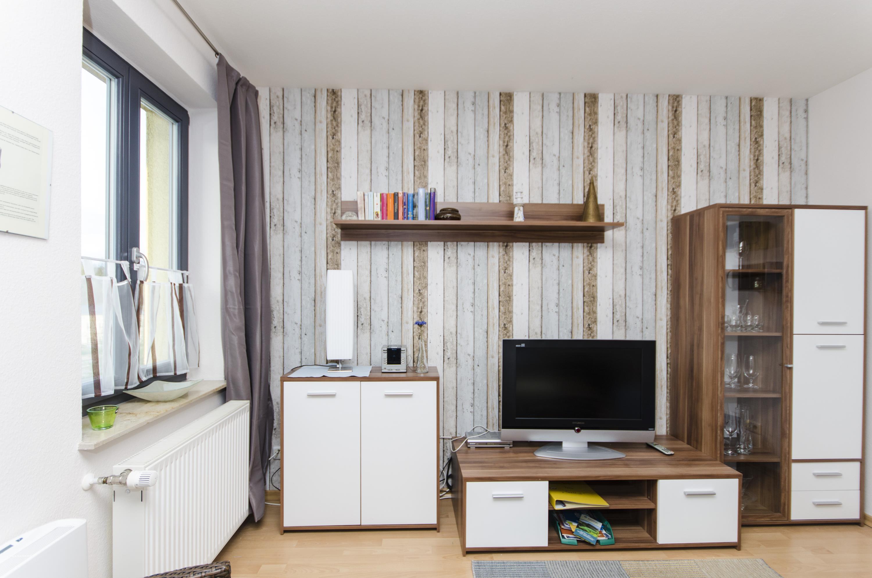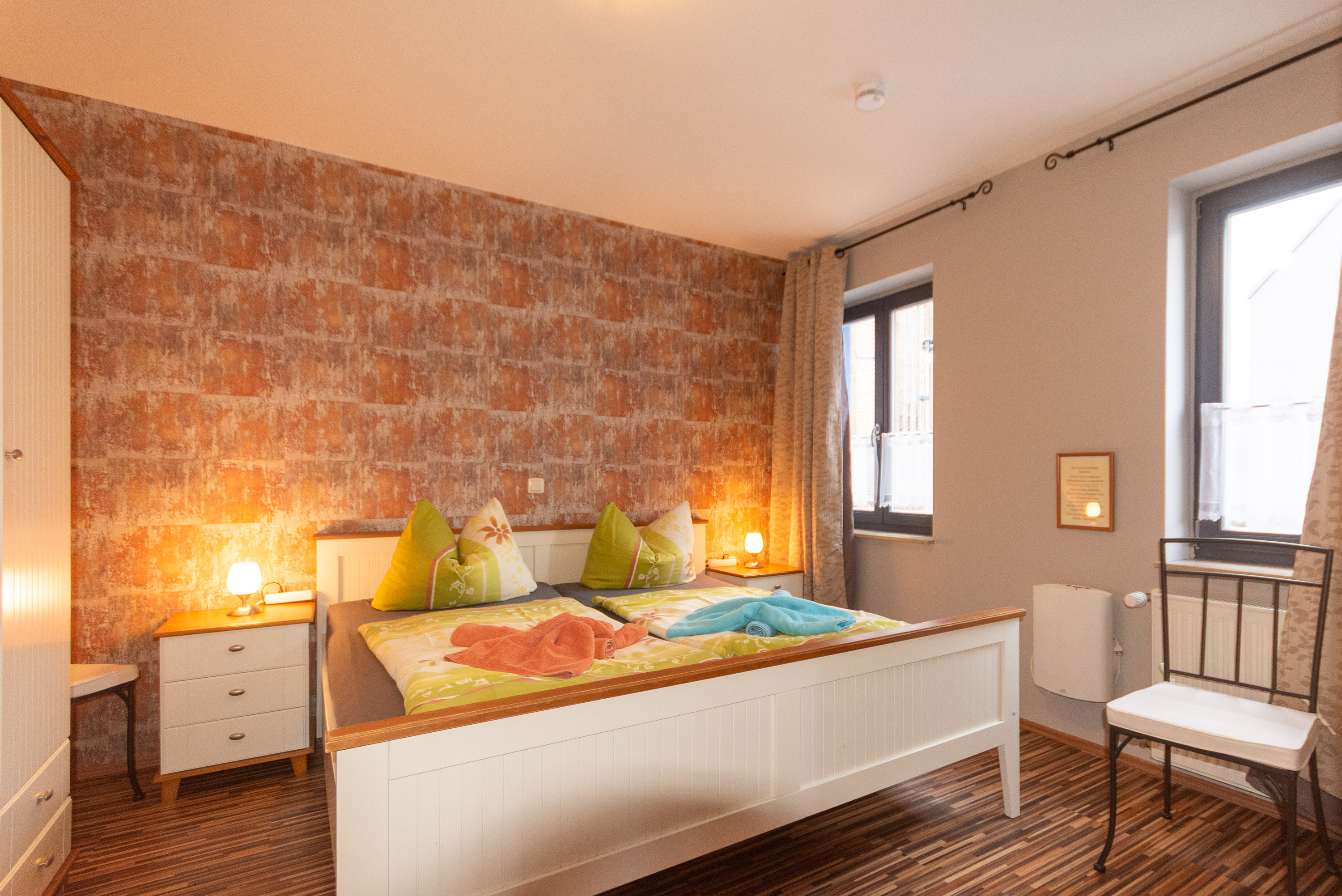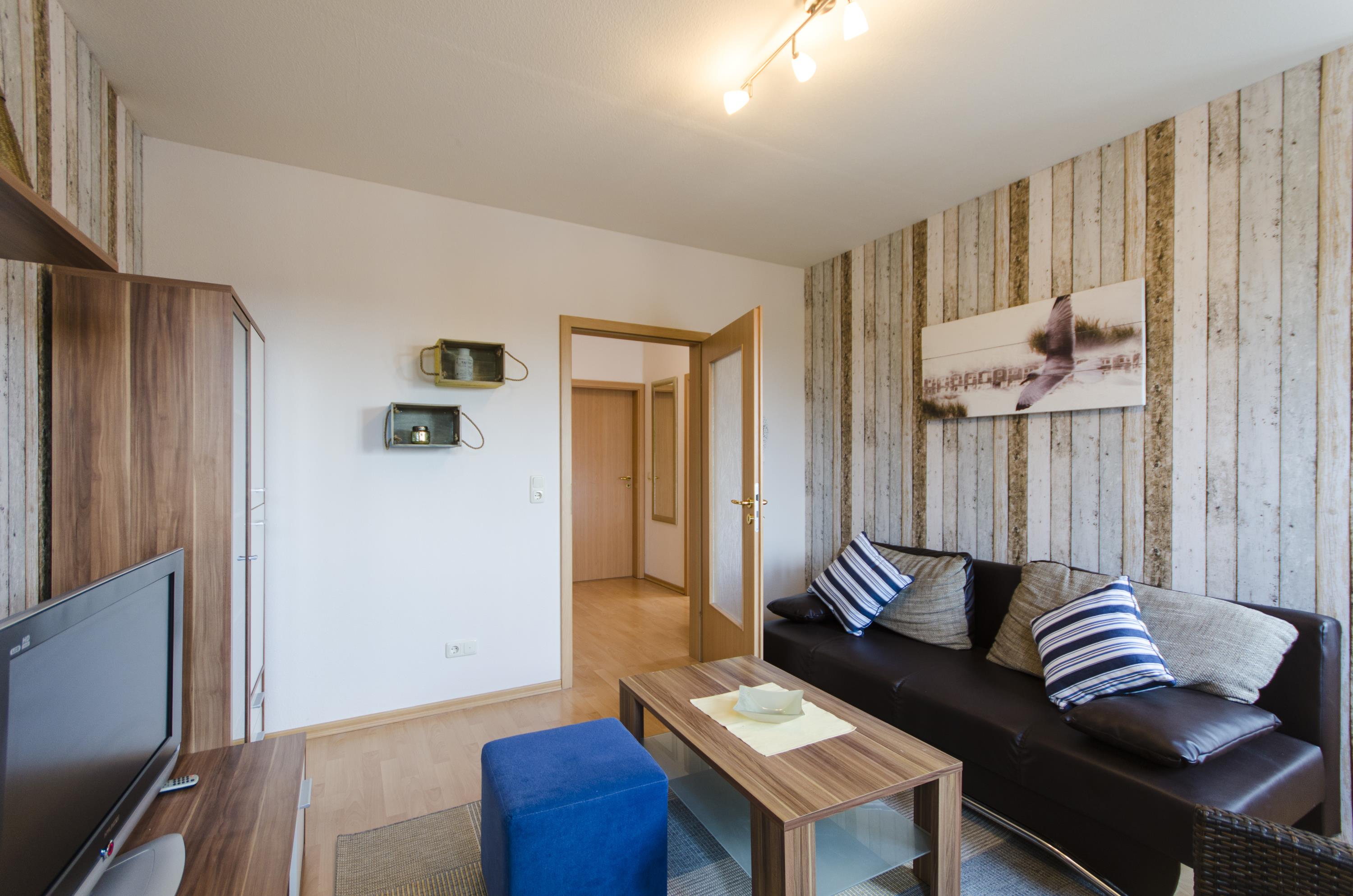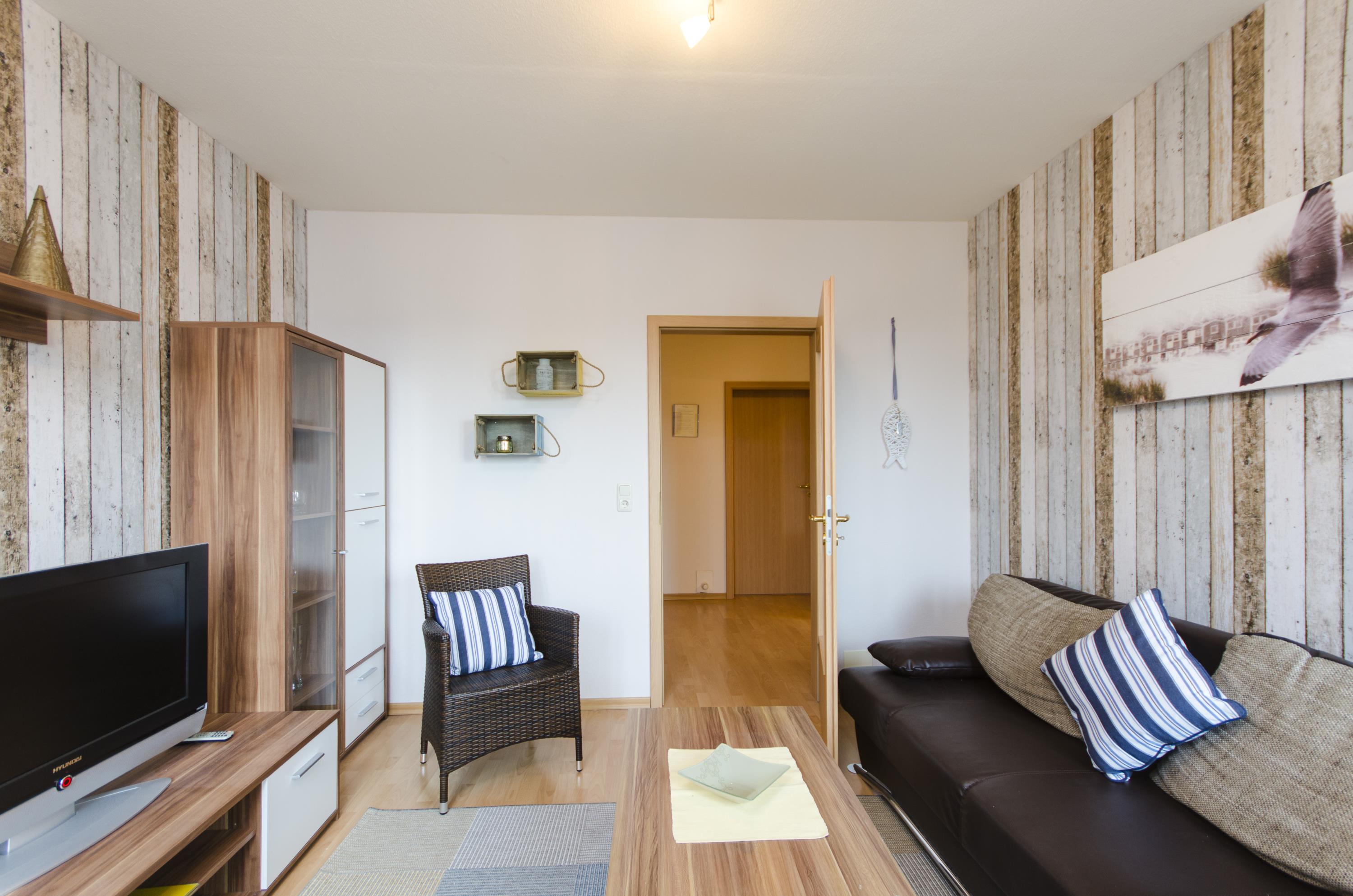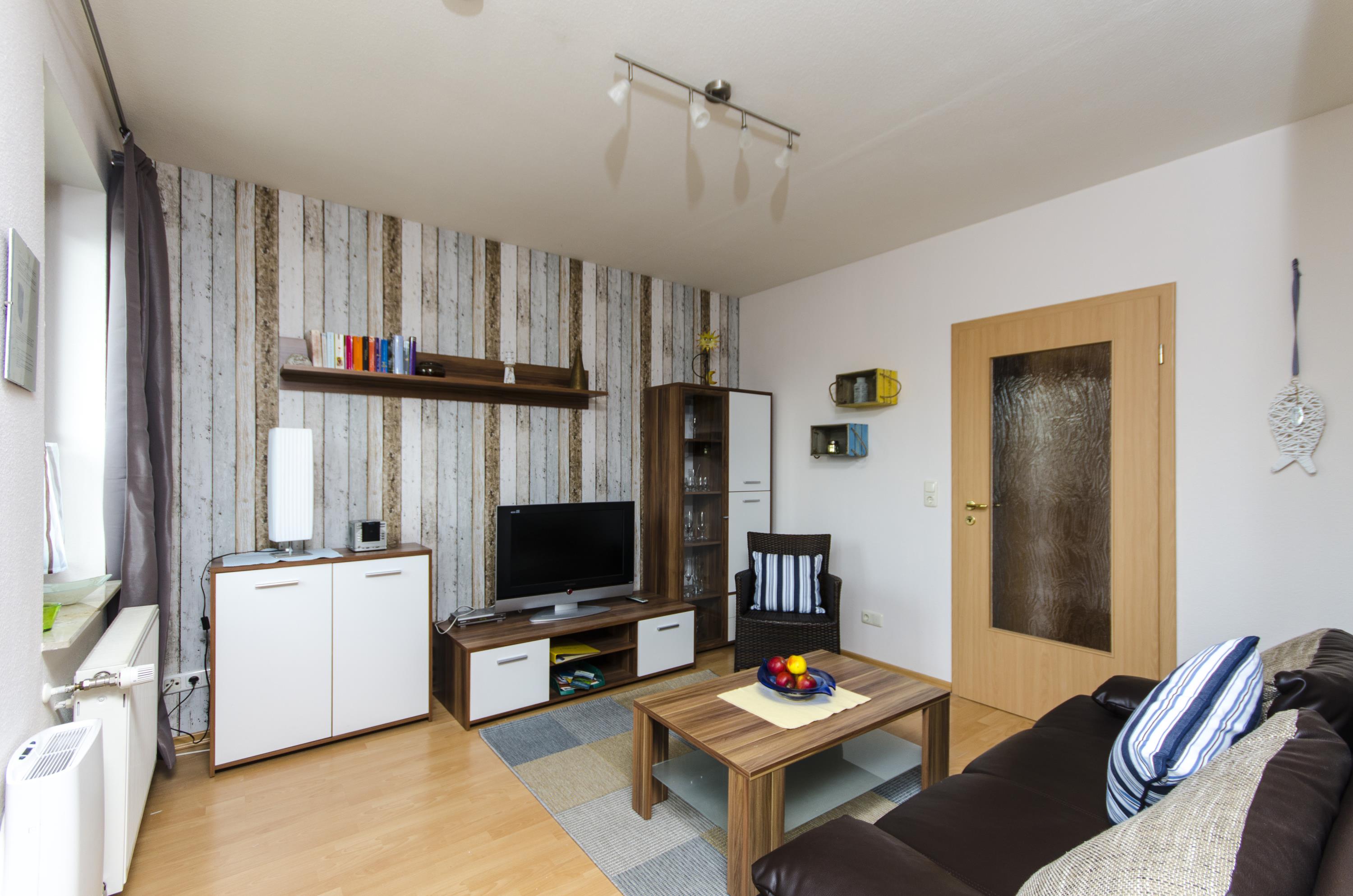 Die Ferienwohnung Seeblick liegt in der ersten Etage. Sie verfügt über ein Wohnzimmer mit Schlafcouch (140x200), Wohnzimmermöbeln, Sessel und Flachbildschirm, ein separates Schlafzimmer mit Doppelbett. Der Wohnbereich und das Schlafzimmer sind durch einen Flur mit kleinem Abstellraum getrennt und verfügen jeweils über eine eigene Tür. Dies sorgt insbesondere für Privatssphäre bei Belegung mit mehr als 2 Personen.