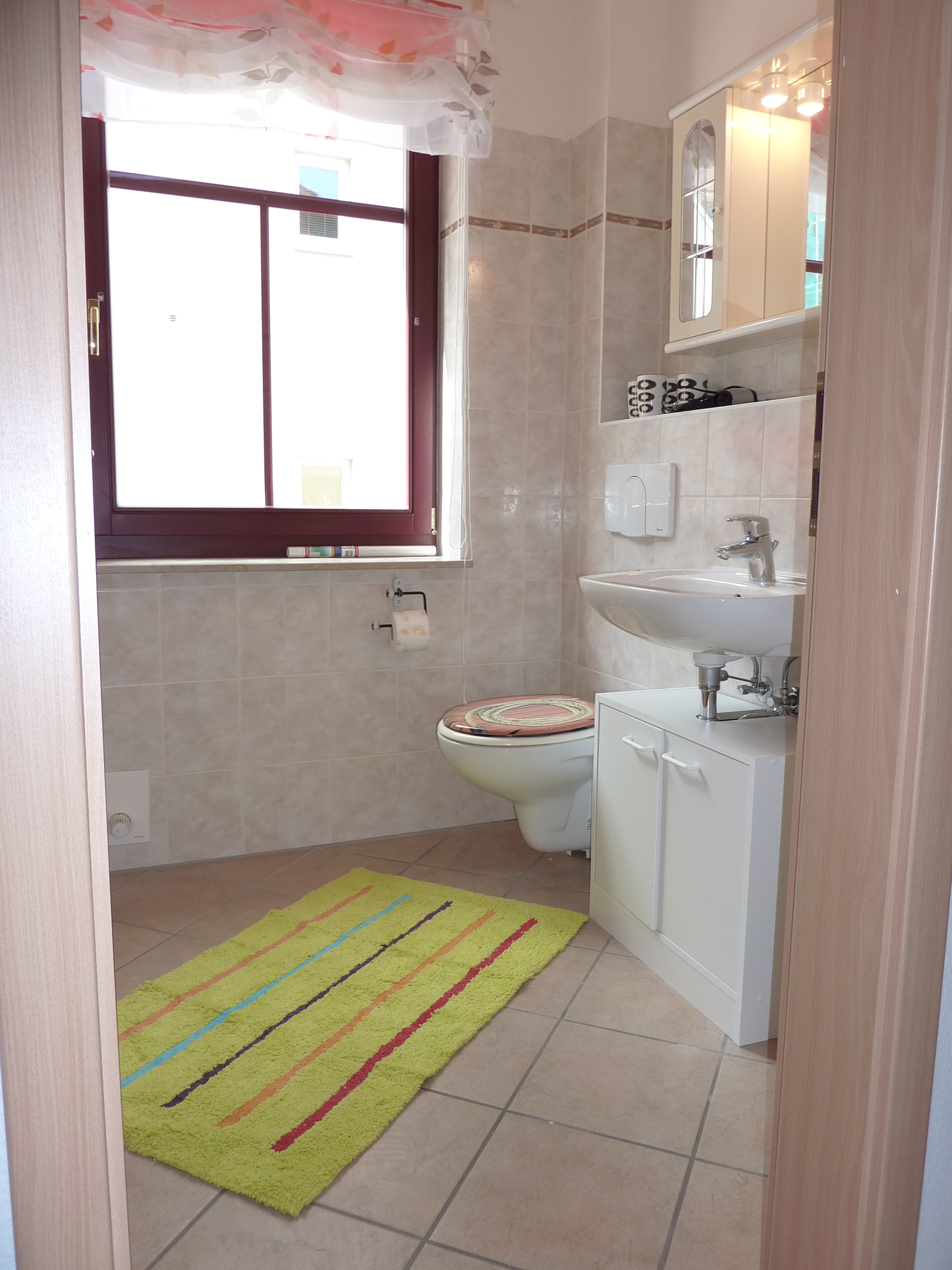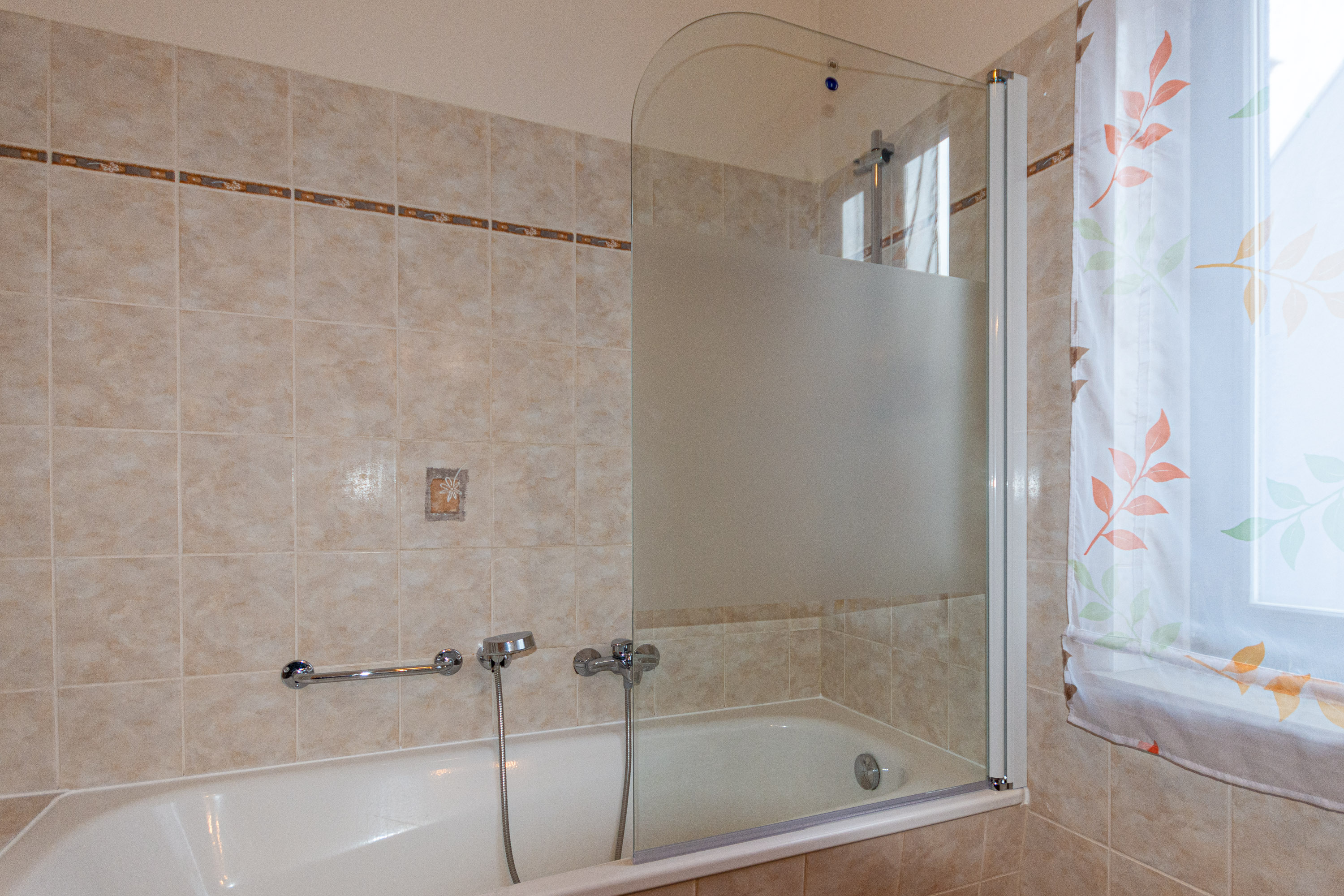 Das Tageslichtbad verfügt über eine Badewanne mit Dusche.