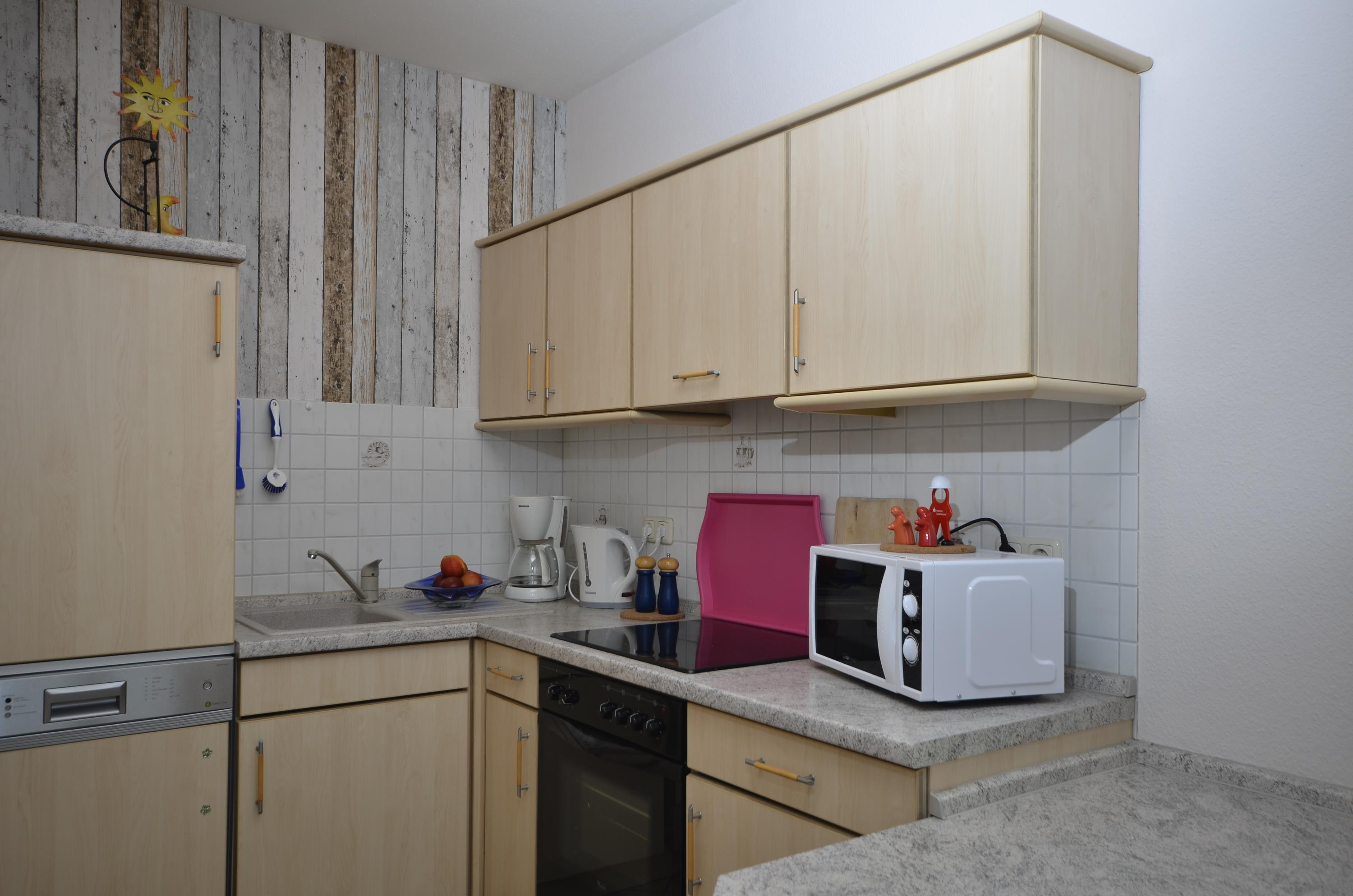 Die FeWo Seeblick verfügt über eine Einbauküche mit Herd (Ceranfeld), Backofen, Mikrowelle, Kühlschrank mit Eisfach und Spülmaschine, Elektrogeräte: Wasserkocher,Toaster und Kaffeemaschine sowie eine Komplettausstattung mit Koch- und Küchenutensilien.