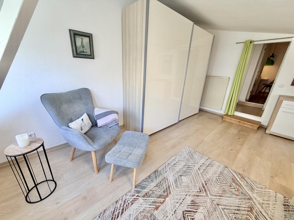 Im 1. Obergeschoss befindet sich die ca. 40 qm große Ferienwohnung beach mit Wohnzimmer(TV, kostenfreies WLAN), kleiner Küche, Schlafzimmer mit Doppelbett und Duschbad mit Fön. In der Wohnung befinden sich zwei Stufen .