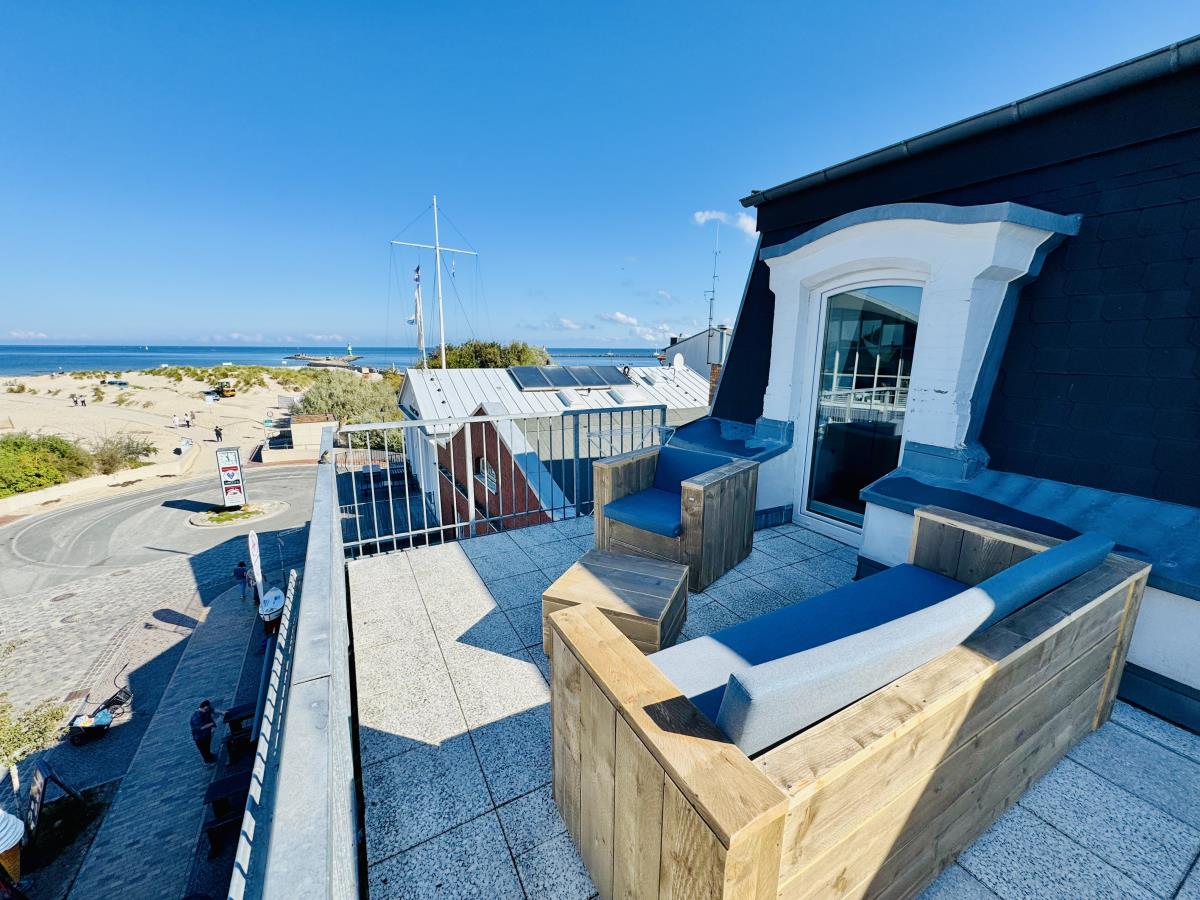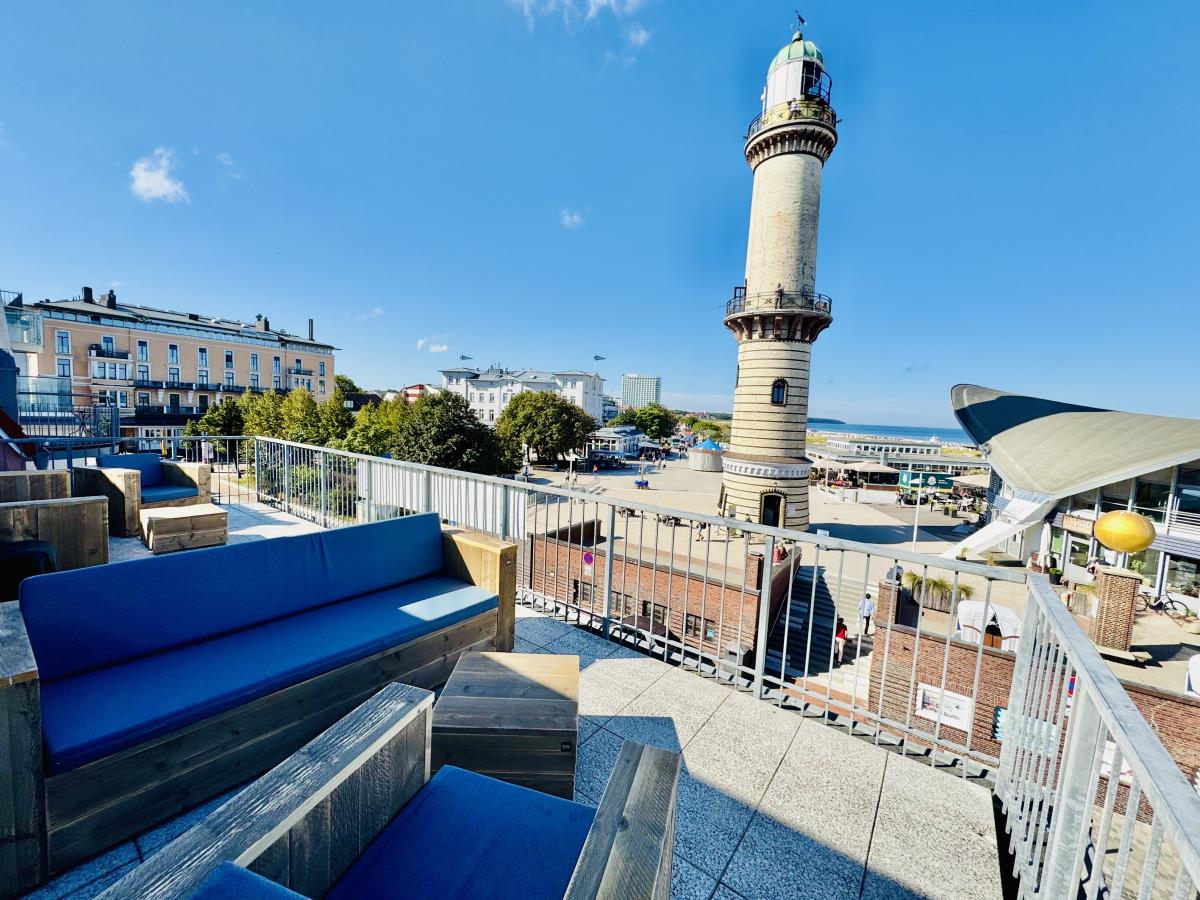 Aus der "Ausguck" im 2. Obergeschoss, sehen Sie vorbei am Leuchtturm hinten am Strand die Sonne im Meer versinken. Diesen Anblick vergessen Sie nie wieder. Zur Ostsee ist es ein Katzensprung und die Flaniermeile "Am Alten Strom" haben Sie in weniger als 50 m erreicht. Aber auch in der Wohnung werden Sie sich garantiert wohl fühlen. Küchenzeile mit Miniofen, Bad mit Dusche und Fön gehören zur Ausstattung. Flachbildfernseher,WLAN (kostenfrei) und DVD sind selbstverständlich. Auf insgesamt ca. 35 qm bietet sich bequem Platz für 2 Erwachsene. Gemütliches Wohnzimmer, Schlafzimmer mit Doppelbett (1,40 m). Die Wohnung ist mit Laminatboden versehen und Nichtrauchern vorbehalten. Von der Balkon-Terrasse(zweigeteilt) genießen Sie den Traumblick über die Ostsee. Aus dem Wohnzimmer können Sie zum Alten Strom sehen.