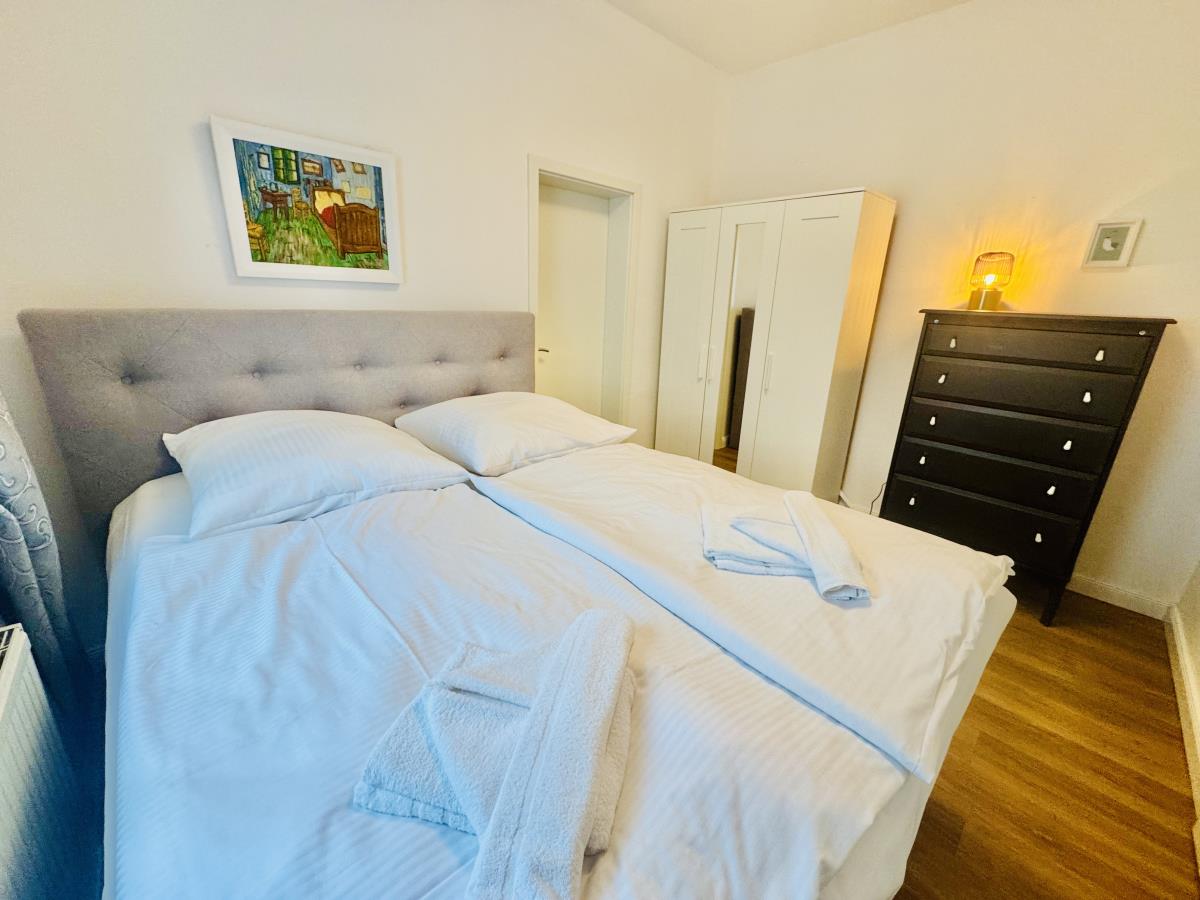 Im 1. Obergeschoss befindet sich die ca. 50 qm große Fewo "Strandkorb" mit Wohnzimmer mit Essplatz, Küche mit Geschirrspüler, Kühlschrank, Herd, Mikrowelle, Schlafzimmer mit Doppelbett (Boxspring 1,60 m), zweites Schlafzimmer als Durchgangszimmer mit Doppelbett (1,40 m), Duschbad mit Waschmaschine+Fön, Gäste-WC und sonnigem Süd-Ost-Balkon. Die Wohnung ist für 4 Personen ausgelegt und Nichtrauchern vorbehalten.