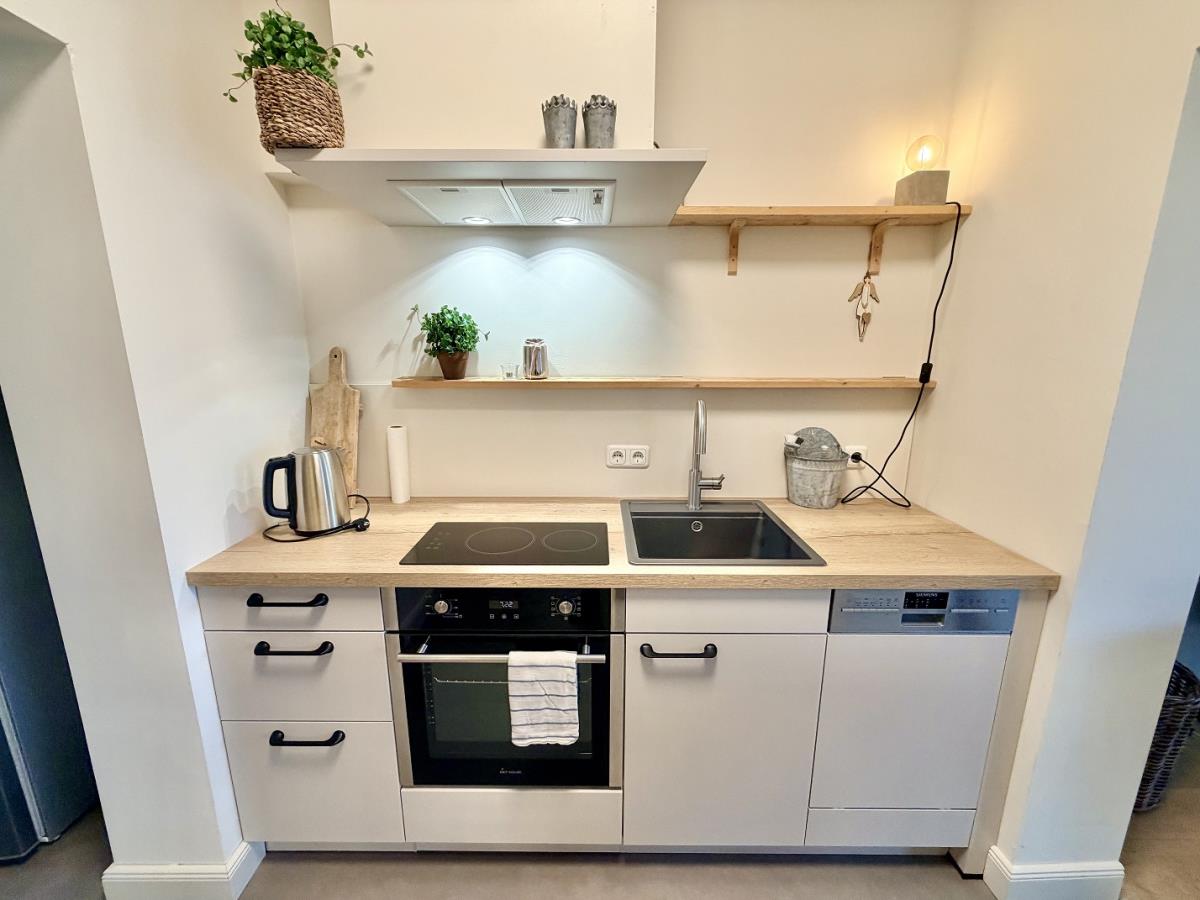 Unser Apartment verfügt über eine Pantryküche mit Geschirrspüler, Kühlschrank mit Kühlfach, Kaffeemaschine, Toaster, Wasserkocher, Geschirr und Besteck.