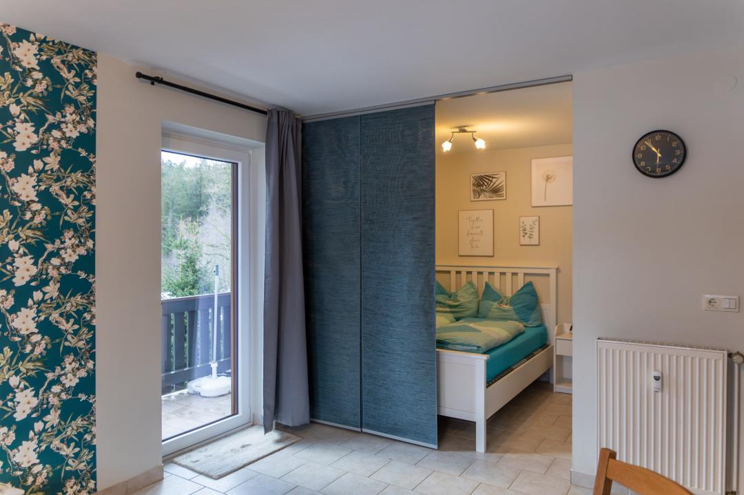 Unsere liebevoll eingerichtete, nach unserem Pony Kira benannte Ferienwohnung hat eine Größe von ca. 45m². Sie befindet sich in der ersten Etage über dem Hauseingang rechts und hat einen schönen Balkon mit Sonne von morgens bis abends. Von dort aus schaut man direkt auf den Wald, den Reitplatz und die Weide.