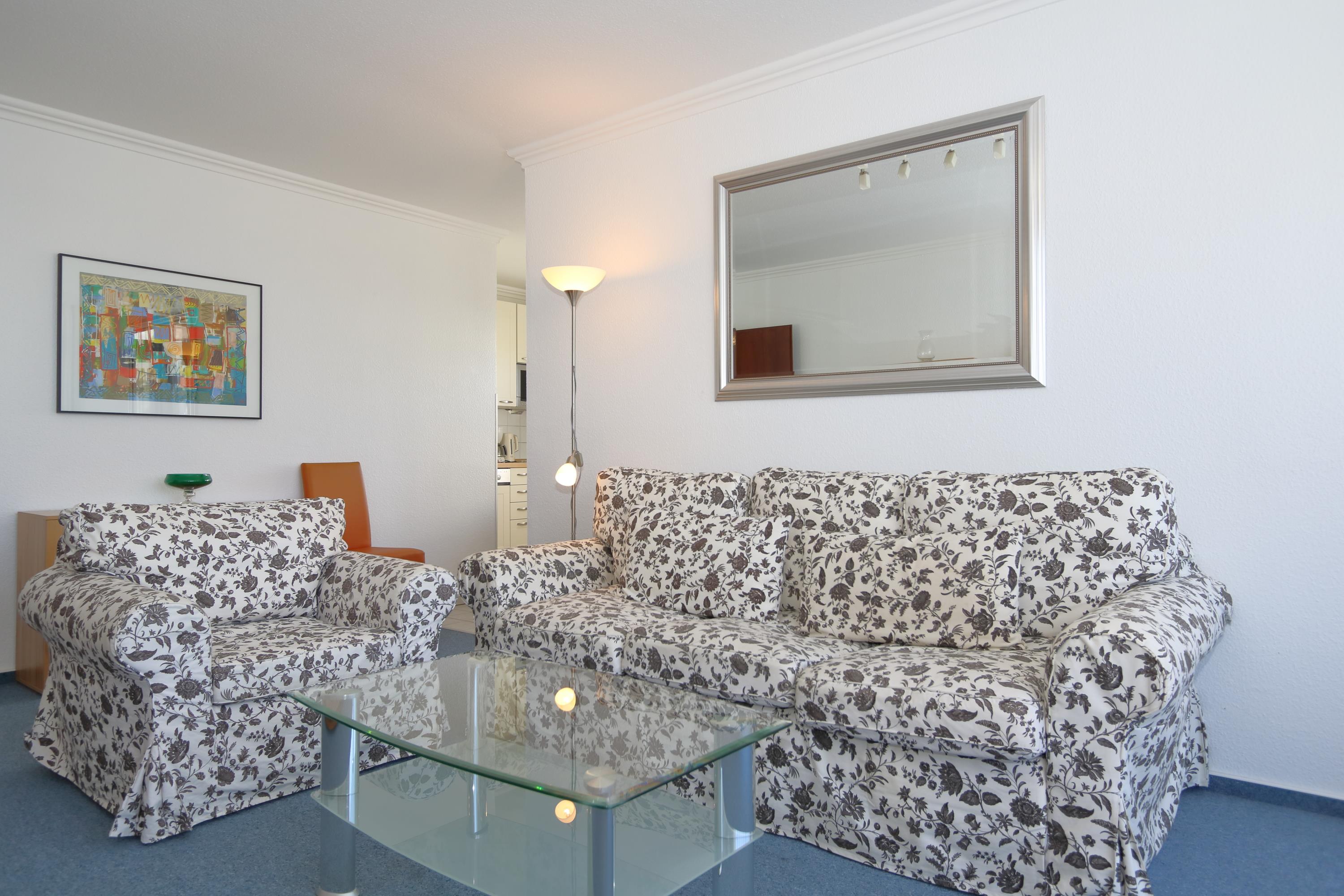 Ausstattung: Im Wohnzimmer steht eine große, gemütliche Couch, die sich zu einer bequemen Schlafgelegenheit ausziehen lässt. Vom Wohnzimmer aus offen zugänglich befindet sich die Küchenzeile (mit u. a. Mikrowelle und Spülmaschine) und dem am Fenster stehenden Essplatz. Das Schlafzimmer hat ein Doppelbett (2x90x200cm). Wohnzimmer und Schlafzimmer sind mit Teppichboden ausgelegt. Vor dem Wohnzimmer befindet sich der große Westbalkon mit entsprechenden Balkonmöbeln. Kabel-TV, Telefon und WLan sind vorhanden.