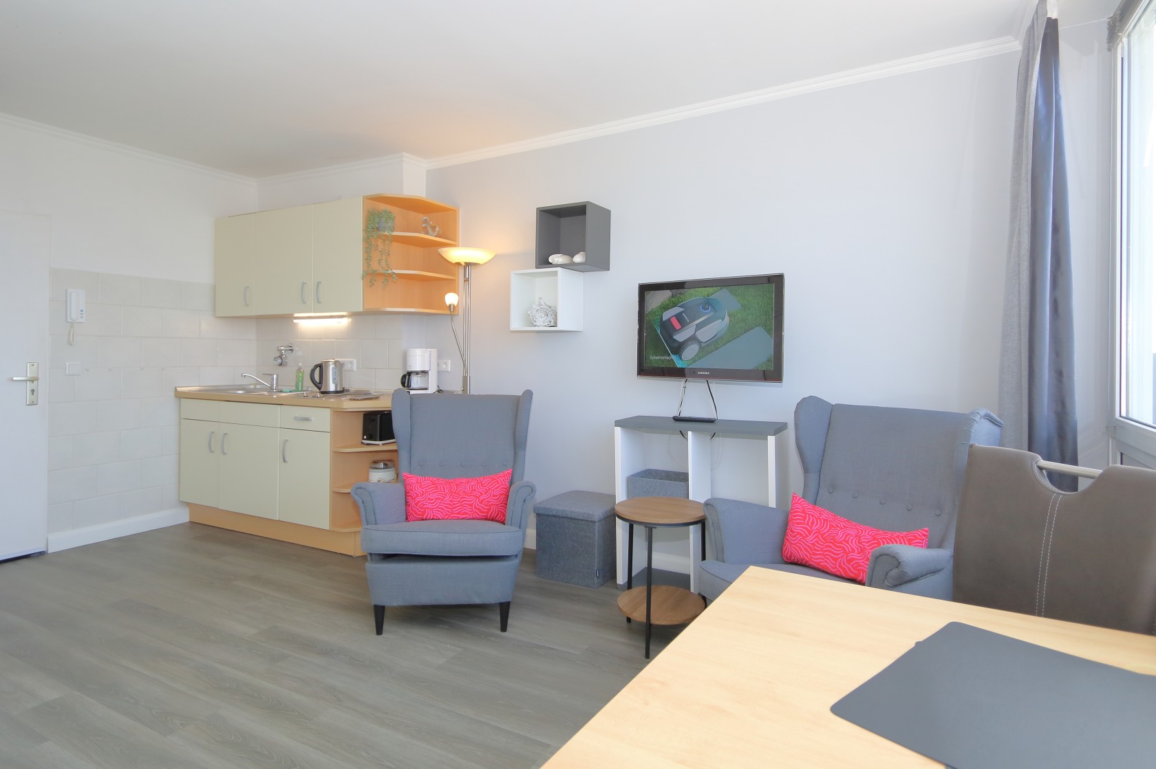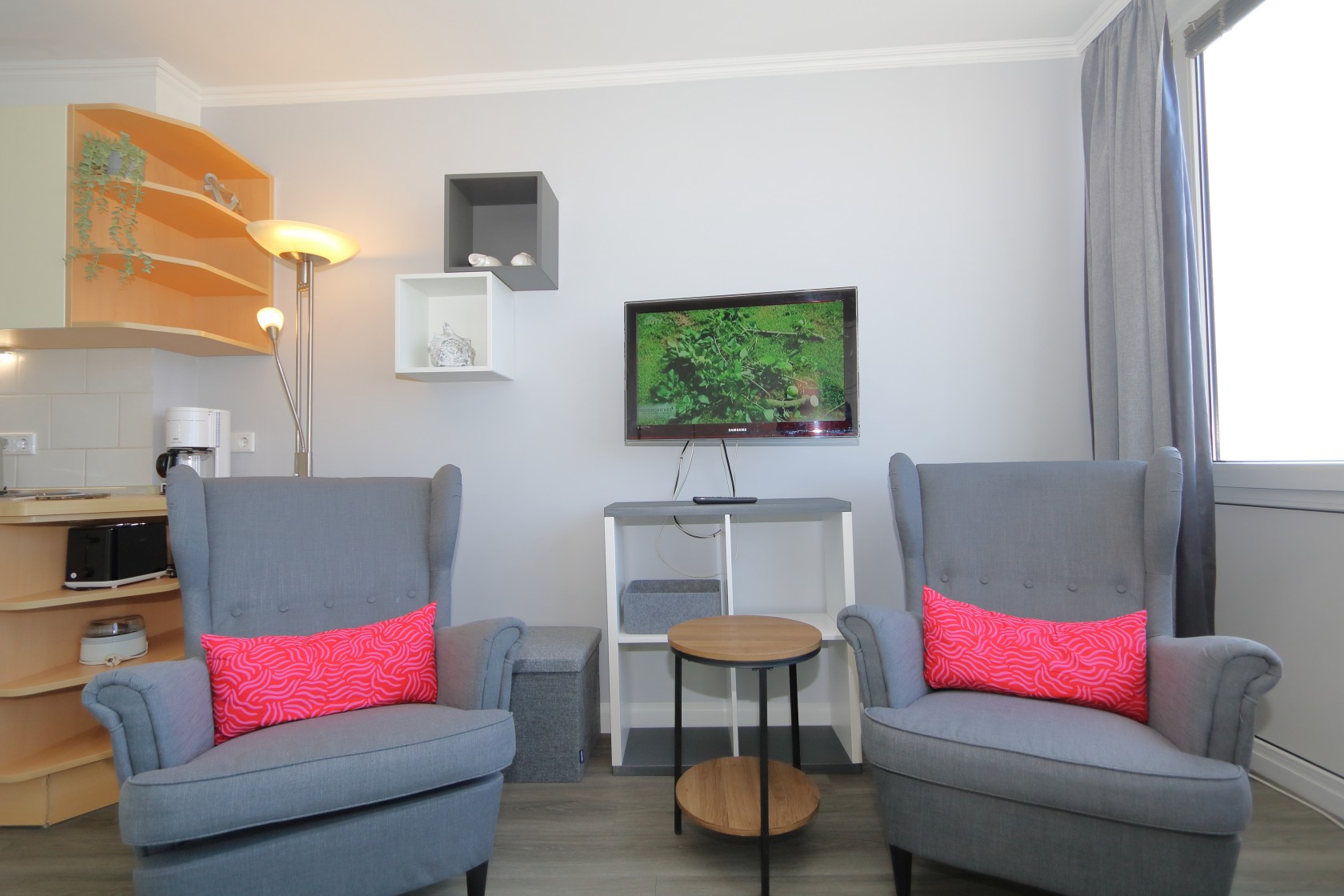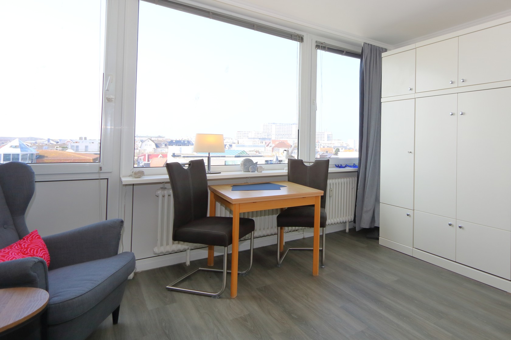 Ausstattung: Im Wohnzimmer des Appartements stehen 2 Sessel und vor dem Fenster der Essplatz mit dem weitem Blick über die Stadt Richtung Nordsee. In einer Schrankwand sind zwei einzeln aufklappbare zusammenstehende Schrankbetten untergebracht. Die Küchenzeile ist zum Wohnzimmer hin offen. Das Bad hat eine Dusche. Haustiere dürfen nach Absprache und gegen Aufpreis mitgebracht werden.