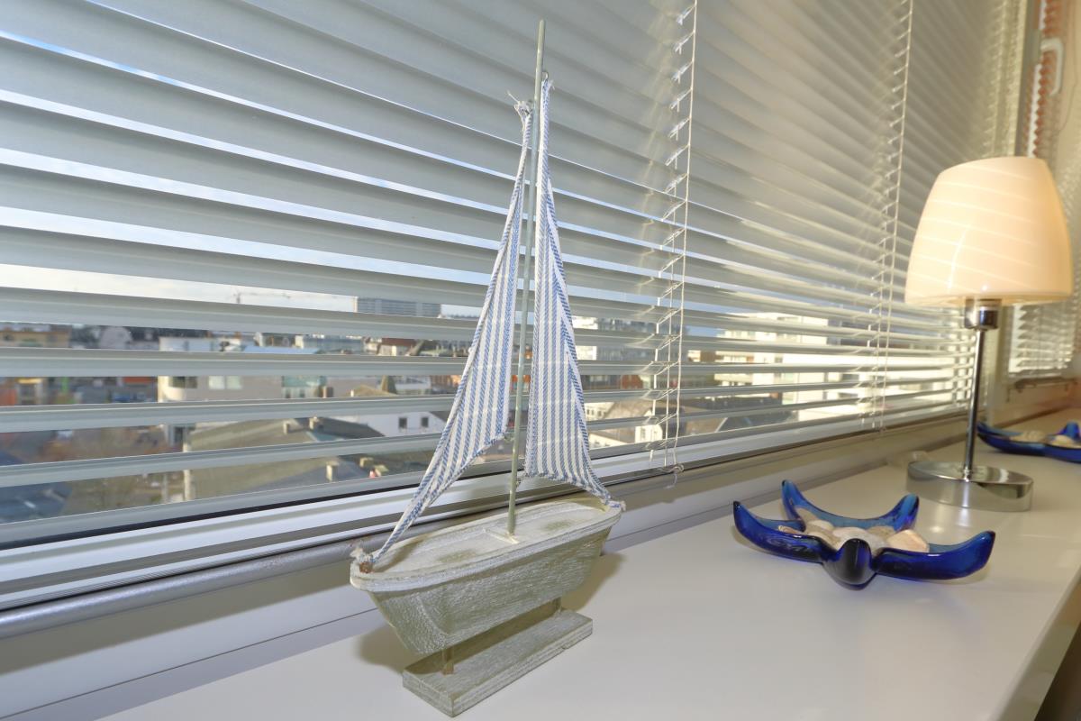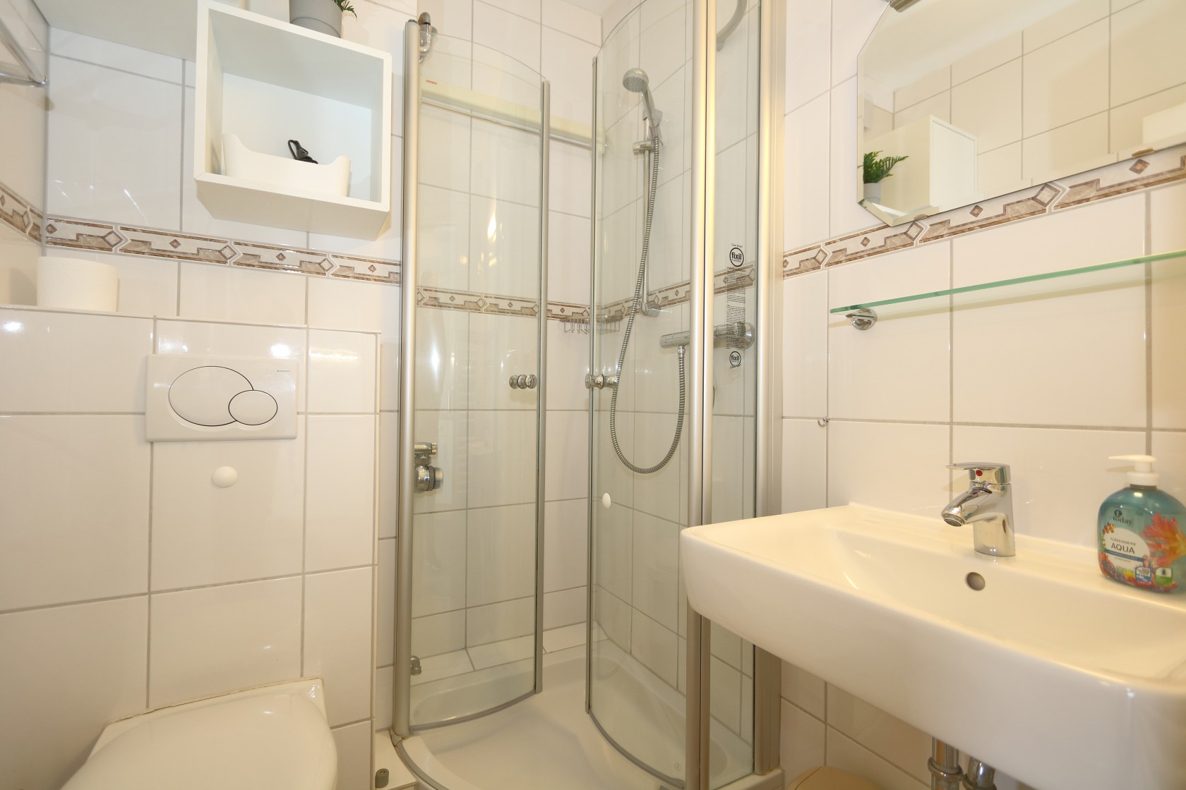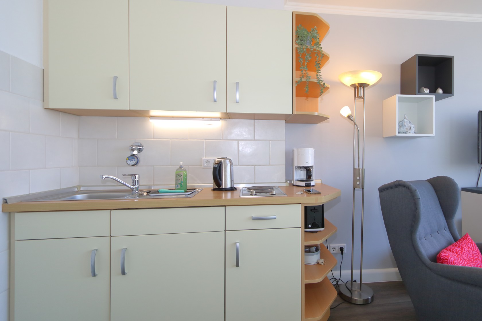 Ausstattung: Im Wohnzimmer des Appartements stehen 2 Sessel und vor dem Fenster der Essplatz mit dem weitem Blick über die Stadt Richtung Nordsee. In einer Schrankwand sind zwei einzeln aufklappbare zusammenstehende Schrankbetten untergebracht. Die Küchenzeile ist zum Wohnzimmer hin offen. Das Bad hat eine Dusche. Haustiere dürfen nach Absprache und gegen Aufpreis mitgebracht werden.