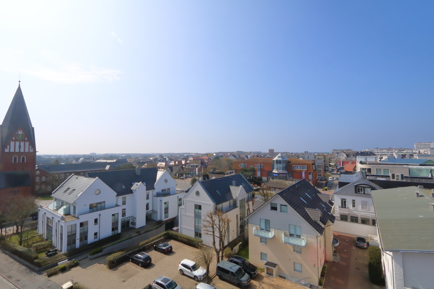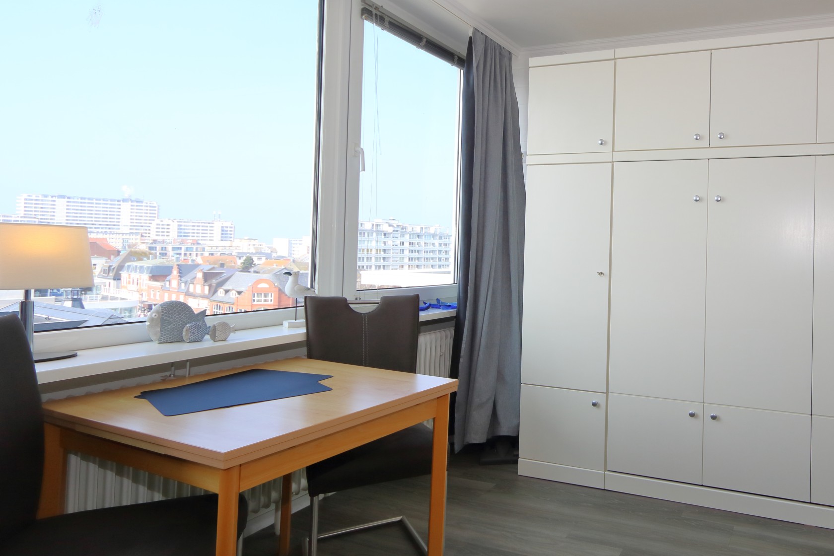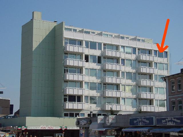 Lage: Das Appartementhaus steht an der Fußgängerzone Wilhelmstraße, die in die Friedrichstraße übergeht. Zum Strand sind es ca. 500 m. Das Appartement befindet sich in der 6. Etage mit Blick Richtung Westen.