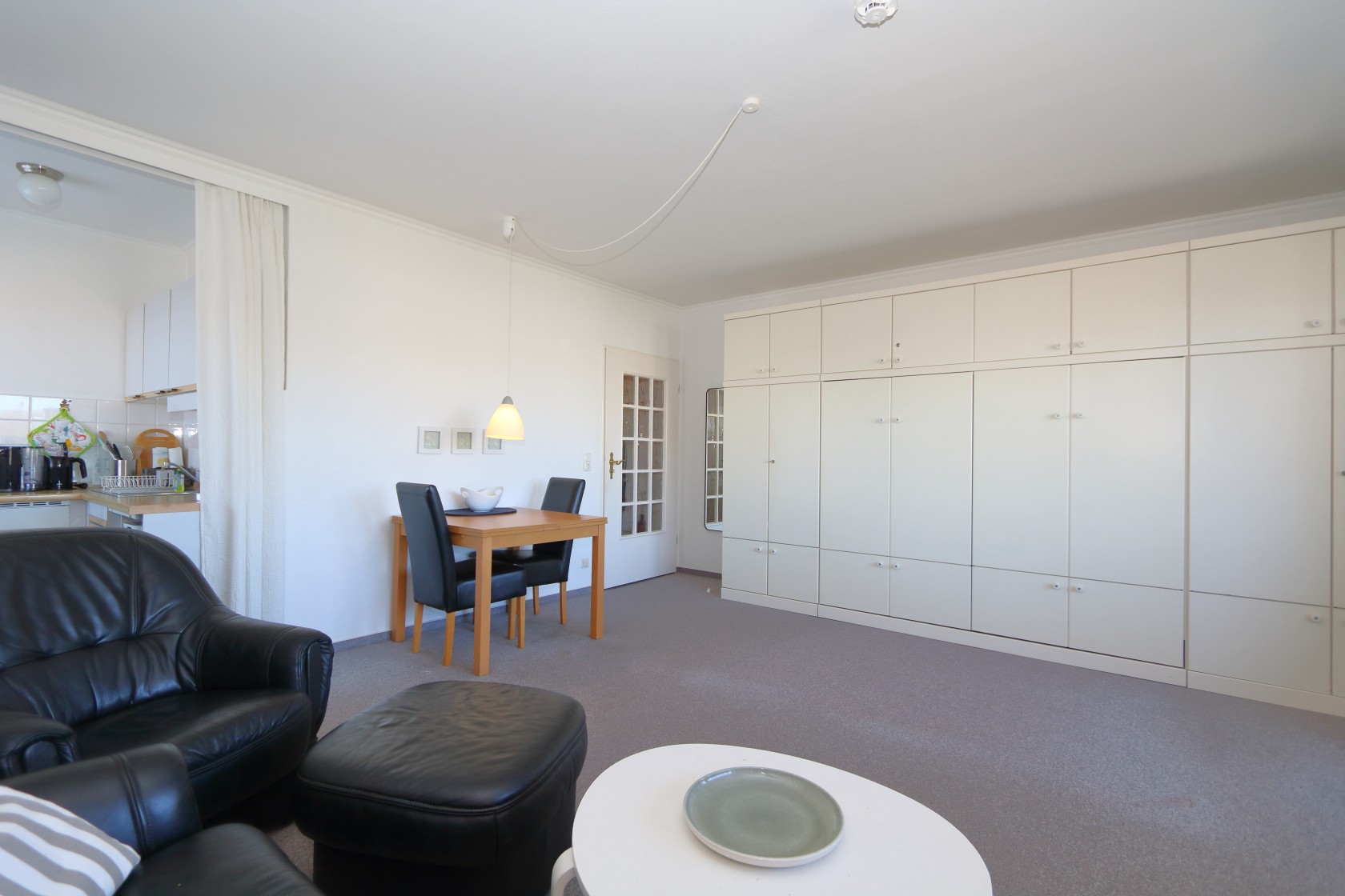 Wohnen Das Wohnzimmer ist mit Sitzgruppe, Fernseher und Radio ausgestattet. Eine Eßecke für 2 Personen ist integriert, das schicke kleine Duschbad macht schon morgens gute Laune.