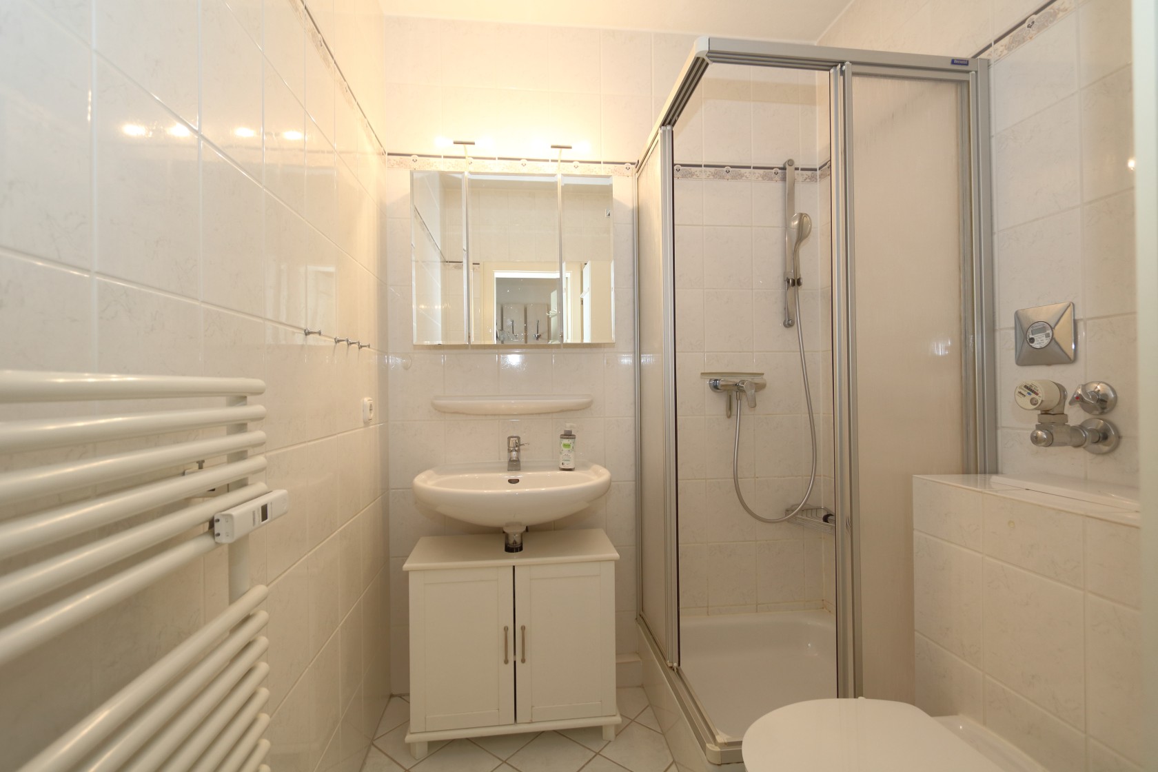 Badezimmer kleines, modernes Duschbad, WC, Waschtisch. Ausreichend Handtücher und Vorleger.