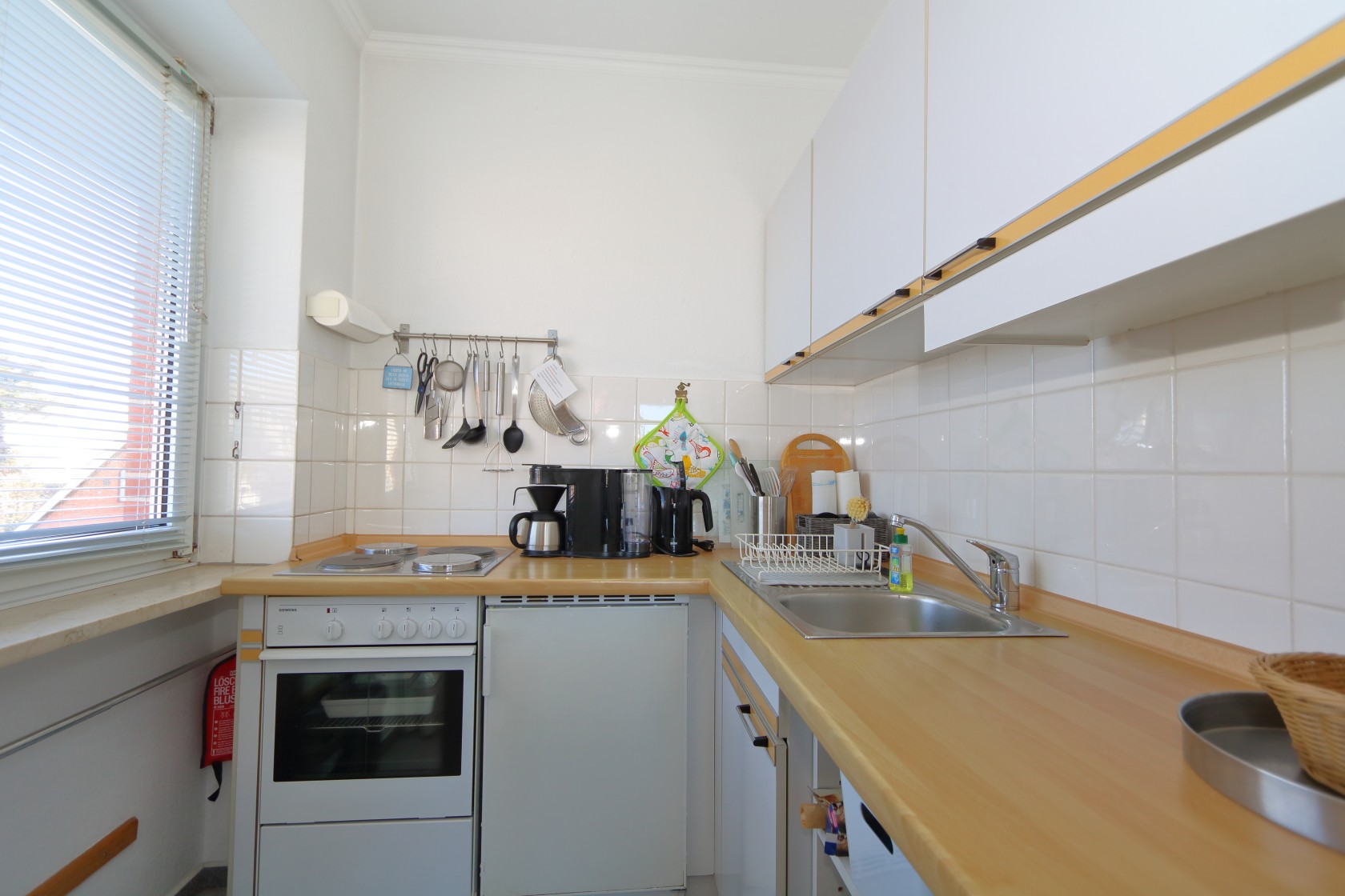 Küche Die Küche ist mit Backofen, Kühlschrank mit Eisfach,Toaster, Kaffeemaschine, Wasserkocher und ausreichend Geschirr und Küchenutensilien ausgestattet.