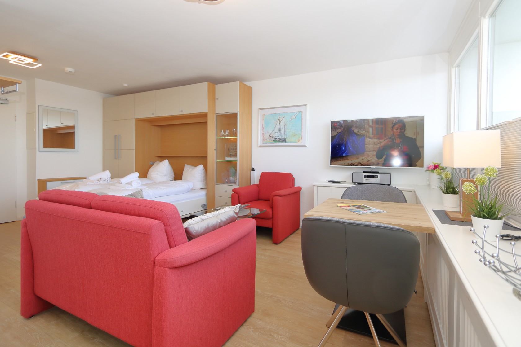 Durch die Glastür, die die Räume abtrennt, kommen Sie in den Wohn-und Schlafbereich, der kreativ eingerichtet ist.