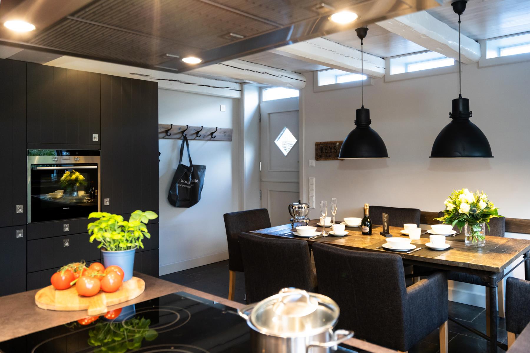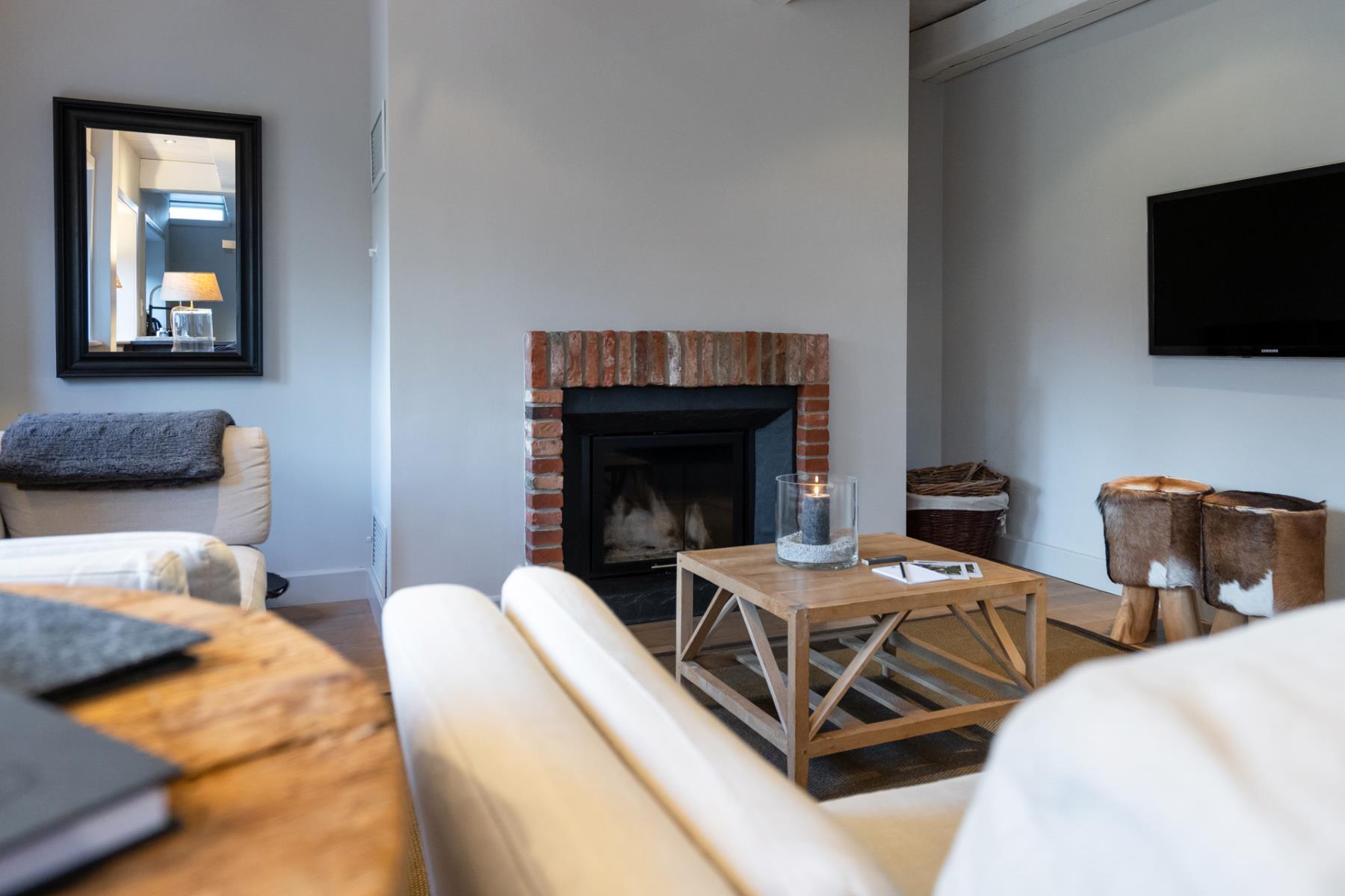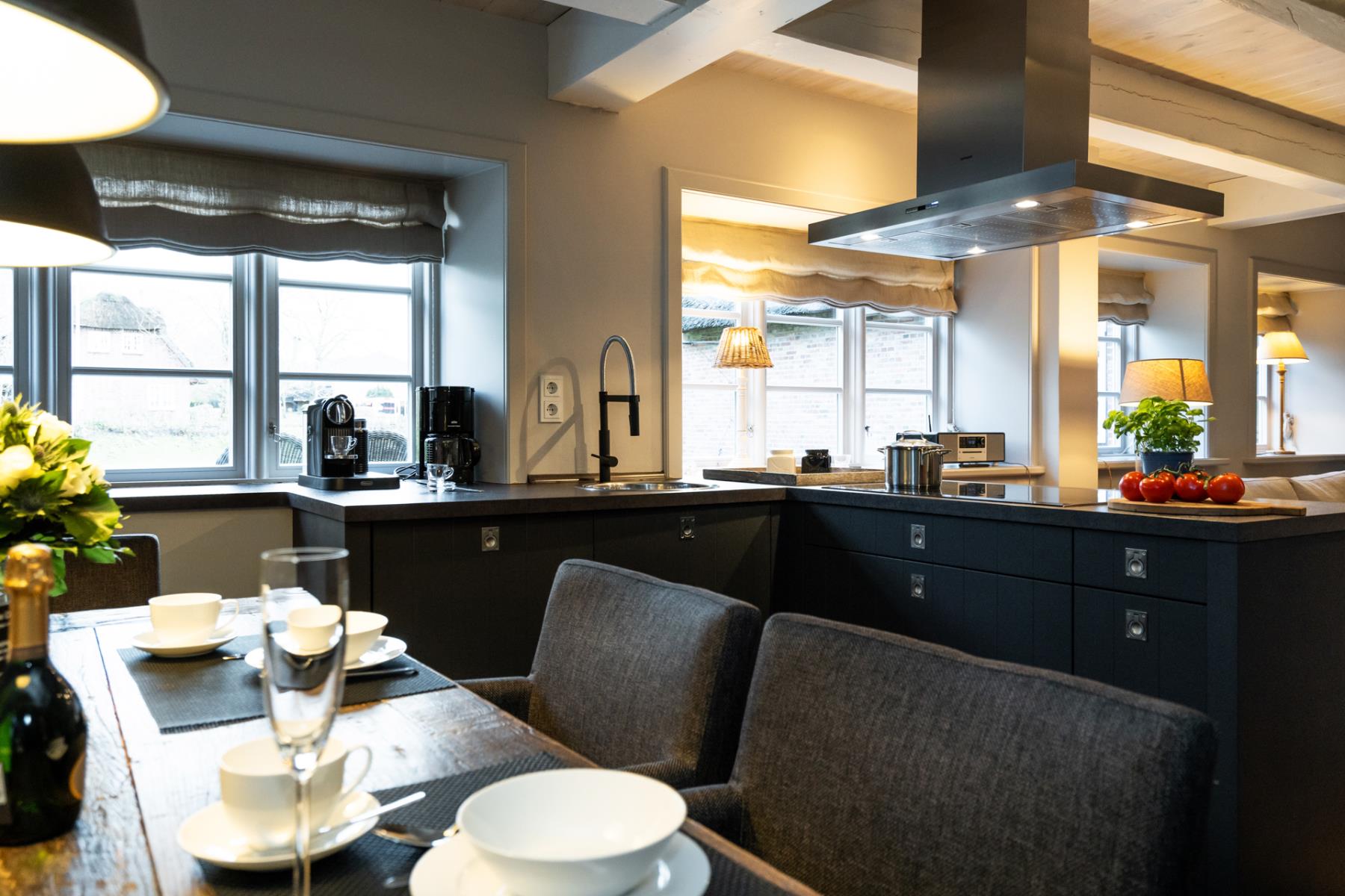 Im Erdgeschoss empfängt Sie ein großzügiger Wohnbereich mit stilvoller Essecke für sechs Personen, einem antiken Holztisch und einer offenen, eleganten Siemens-Küche in Schwarz. Diese ist voll ausgestattet und lässt keine Wünsche offen – ideal für genussvolle Kochabende im Urlaub. Der anschließende Wohnbereich mit zwei beigen Leinensofas, Kamin, LED-TV und warmen Naturmaterialien schafft eine besonders cozy und luxuriöse Atmosphäre.