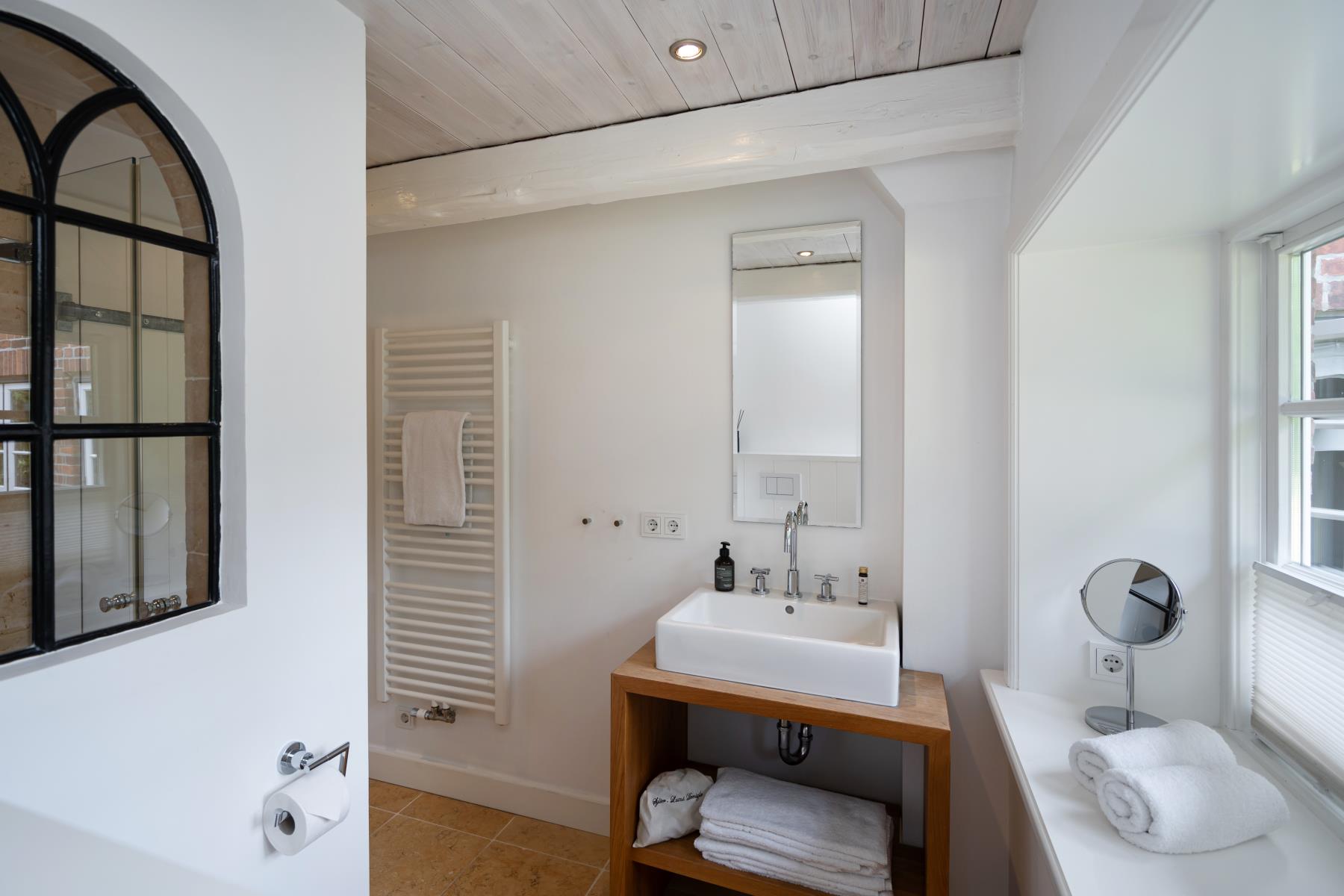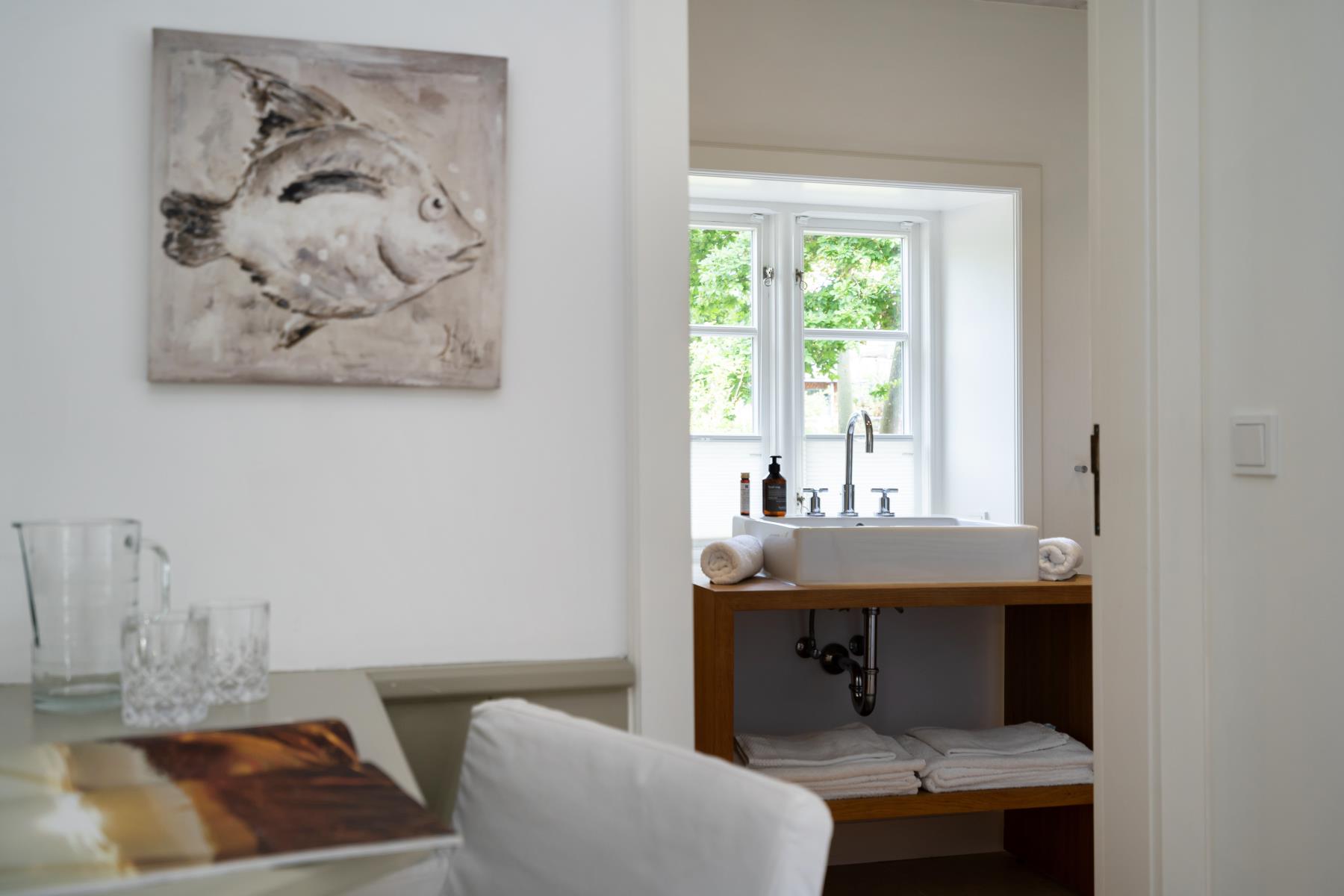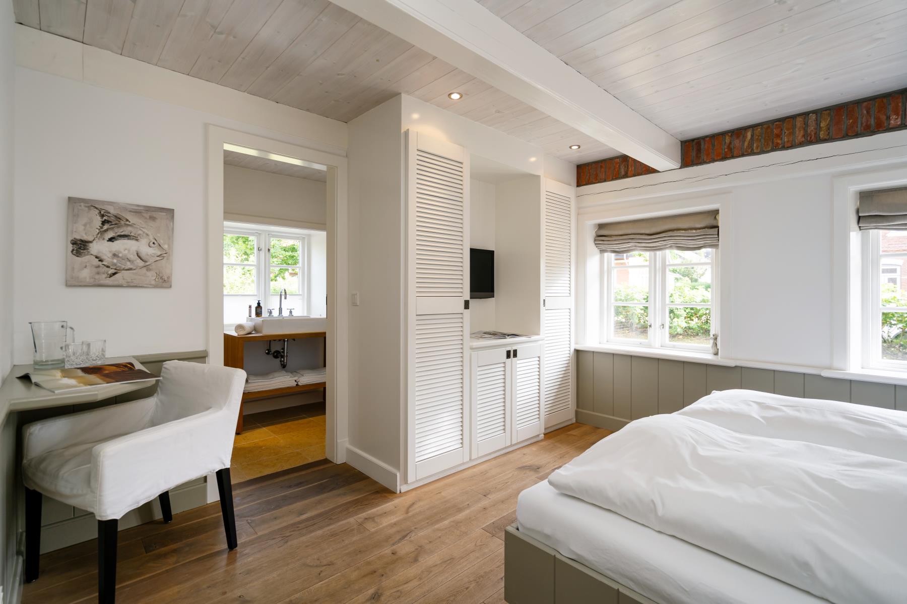 Die Suite ANNO 1792 – EG liegt im Erdgeschoss des Haupthauses und verfügt über eine private Süd-Ost-Terrasse mit hochwertigen Teakholzmöbeln – ein geschützter Platz für sonnige Frühstücke oder entspannte Stunden nach einem Tag am Strand.